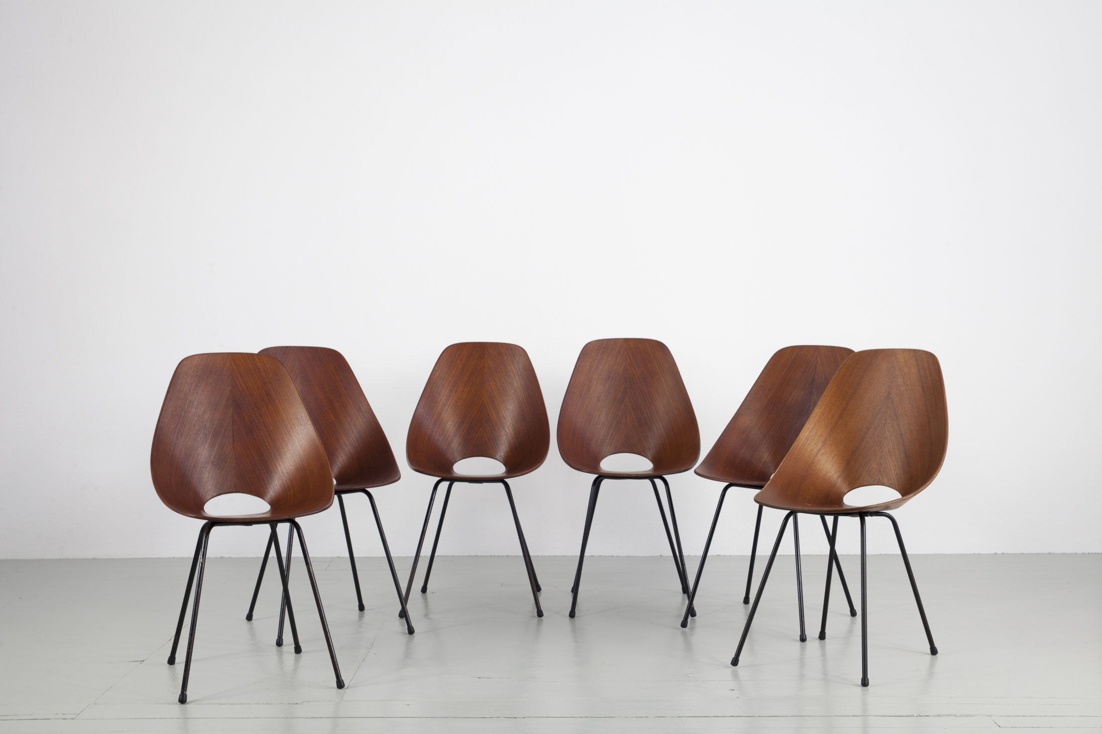 Set von 6 Plywood Stühlen aus Italien, 1954. Die Stühle wurde von Frattelli Tagliabue hergestellt. Auf dem klassischen lackierten Stahlrohrrahmen liegt die für dieses Modell ebenso typische Schichtholzschale. Alle Stühle befinden sich in sehr gutem Zustand.