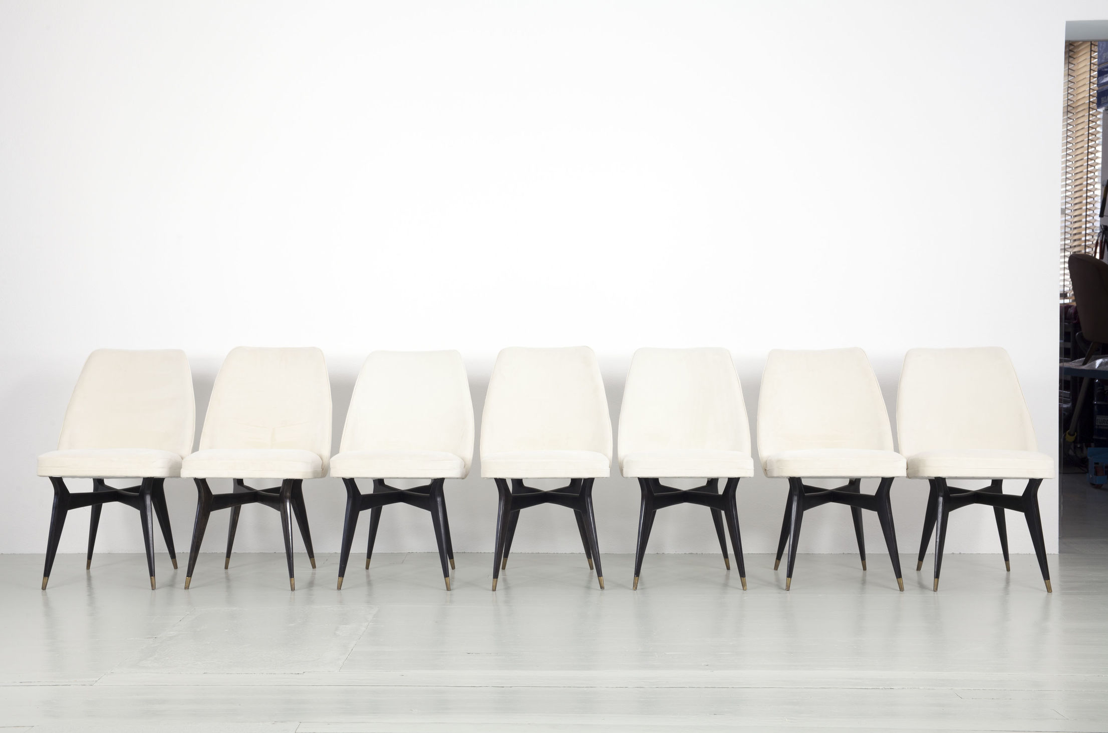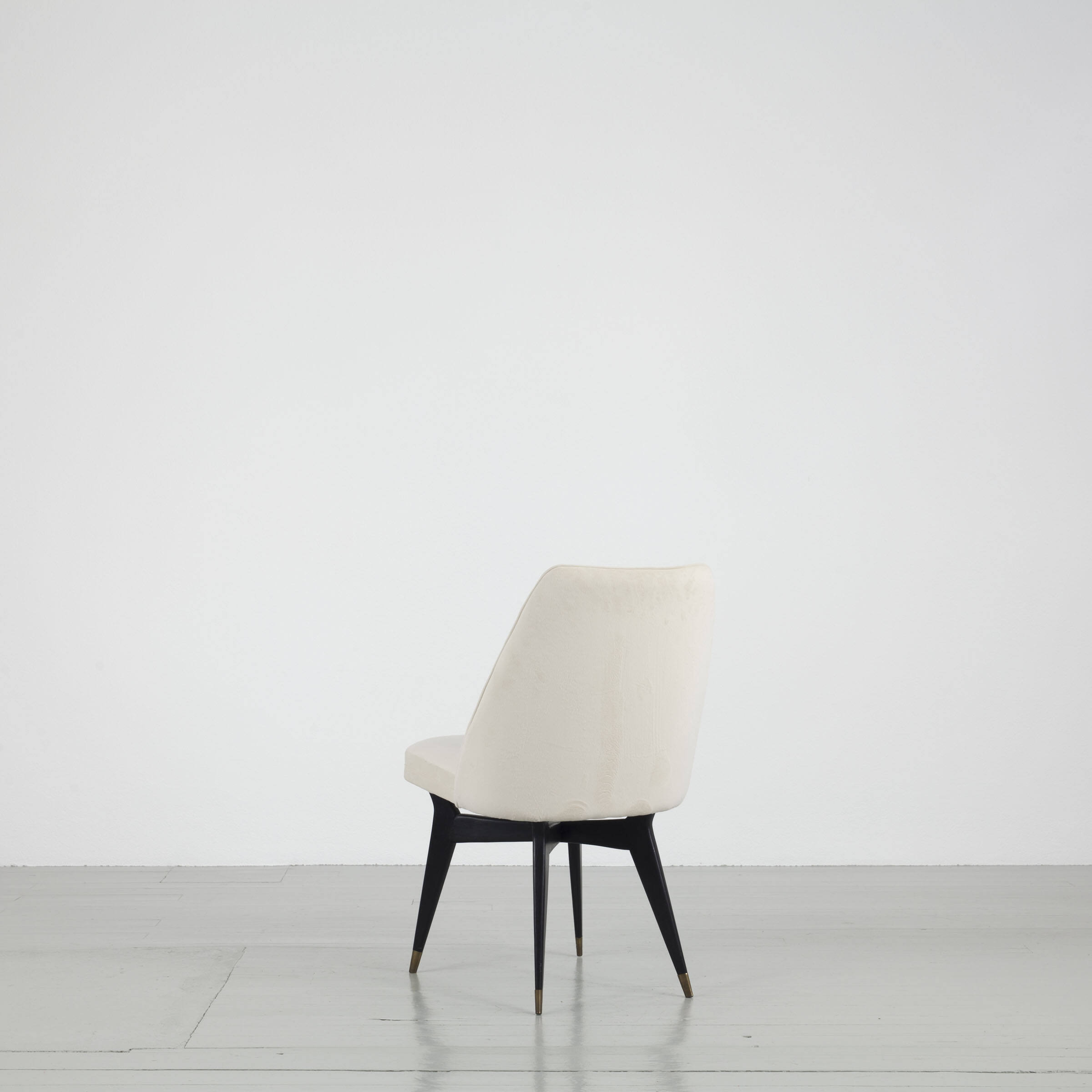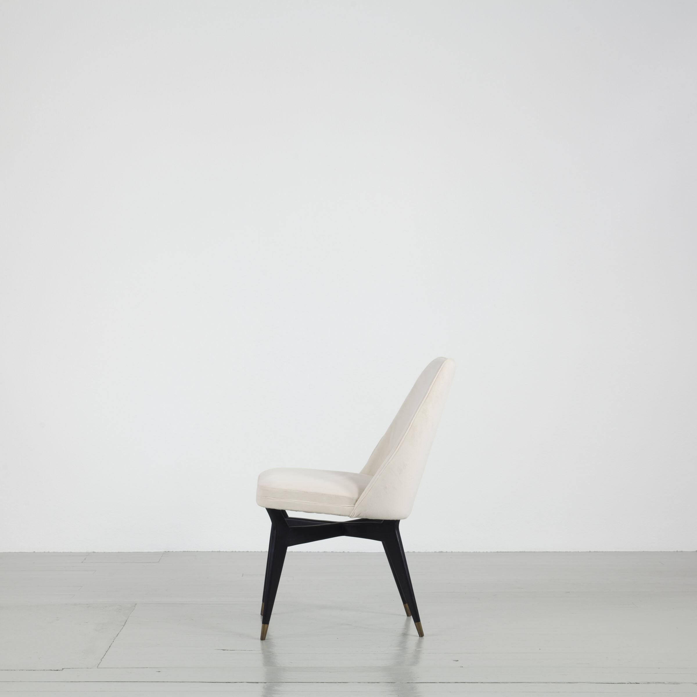 Stuhl Modell "AB 100" - Entwurf von Melchiorre Bega, hergestellt von Altamira, Italien, 1954. Der Rahmen ist aus dunkel lackiertem Holz mit Messingkappen gefertigt. Die Stühle wurden mit einem weißen Velour bezogen.