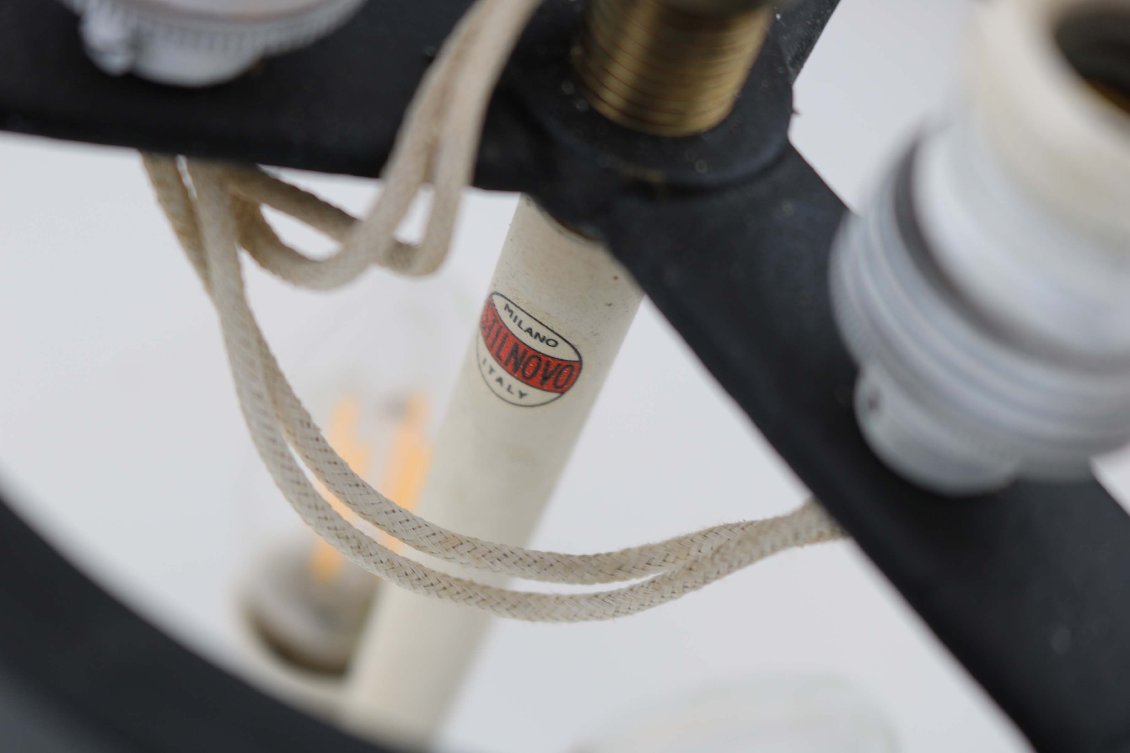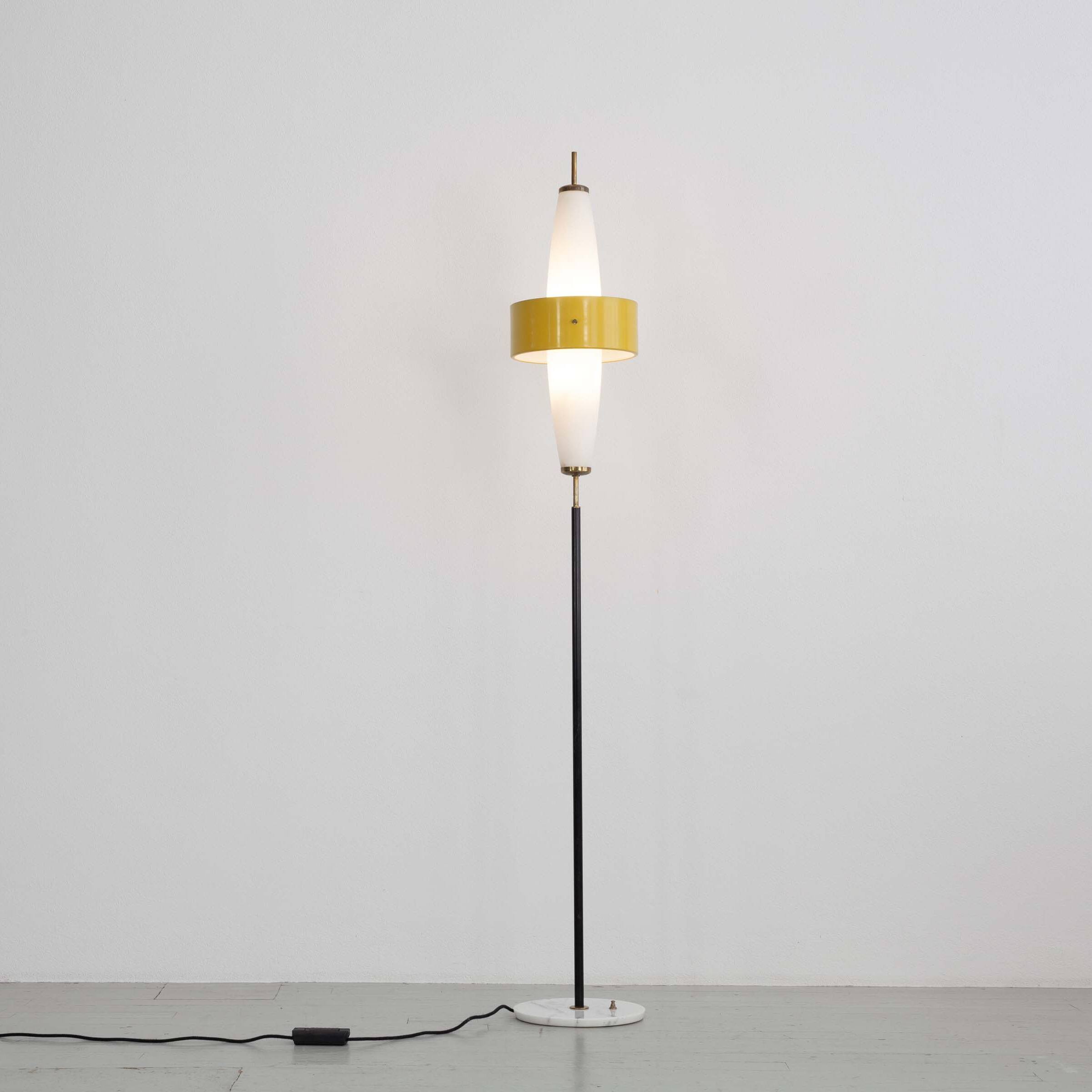 Die Leuchte verfügt über ein schwarz lackiertes Eisengestell mit Messing und Marmorsockel, sowie eine satinierte Glastube mit gelb lackiertem Aluminiumringring.
