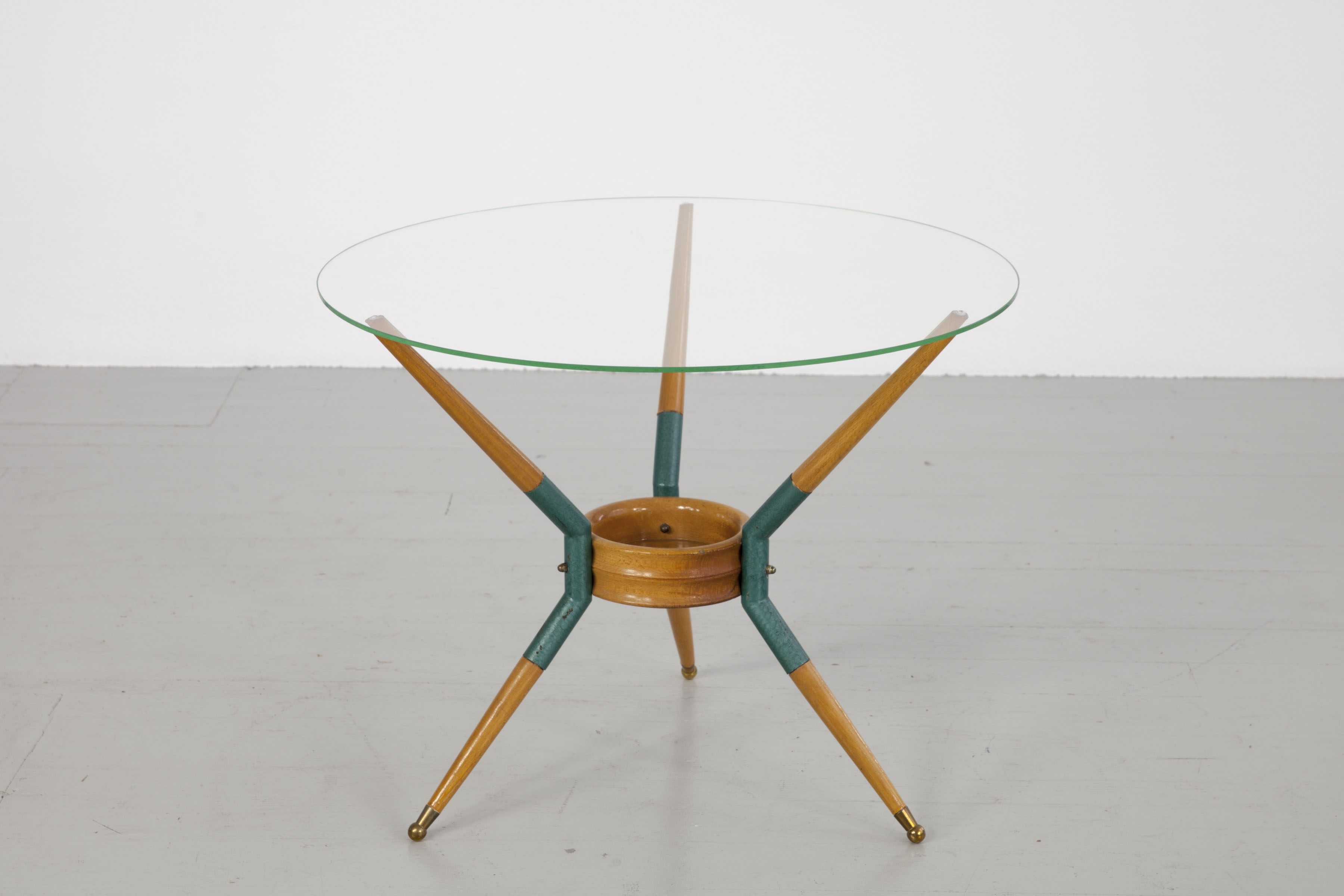 Dieser elegante Sofatisch wurde in den 1950iger Jahren in Italien gefertigt. Die runde Glasplatte wird von drei, schön bearbeiteten Buchenholzbeinen getragen. Die drei Beine sind durch eine runde Holzablage verbunden und mit Messingelementen und Messingabschlüssen verziert. Ein Teil der Tischbeine besteht aus petrolfarbenem Metall. Der Tisch befindet sich in sehr gutem Vintage-Zustand.