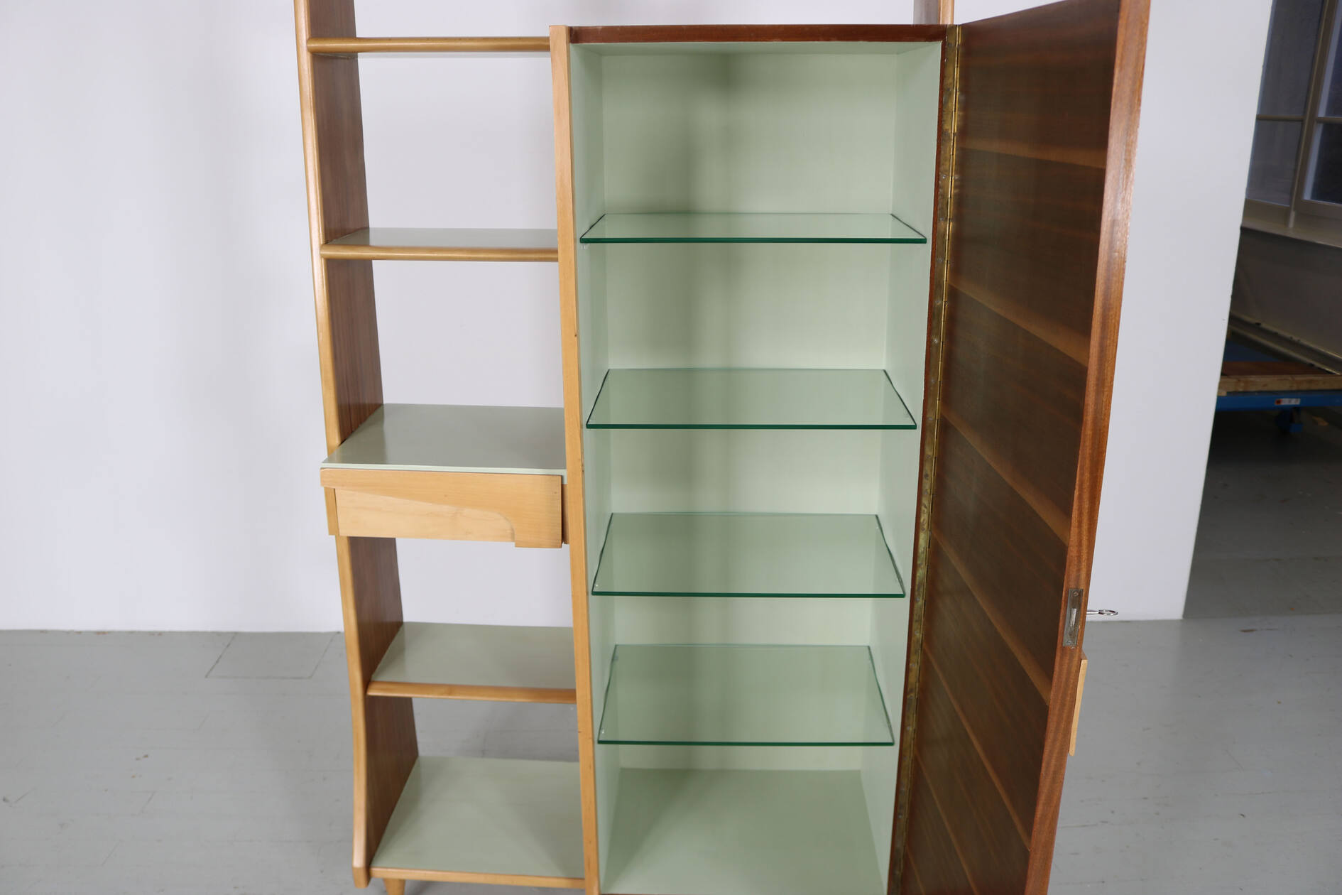 Italienisches Cabinet aus den 1950er-Jahren, von uns sorgfältig restauriert. Die Innenseite und Ablagen wurden in einem hellen Grün gestrichen, zusätzlich wurden Glasregale eingebaut. Das Board bietet großzügigen Stauraum und verbindet elegantes Design mit praktischer Funktionalität