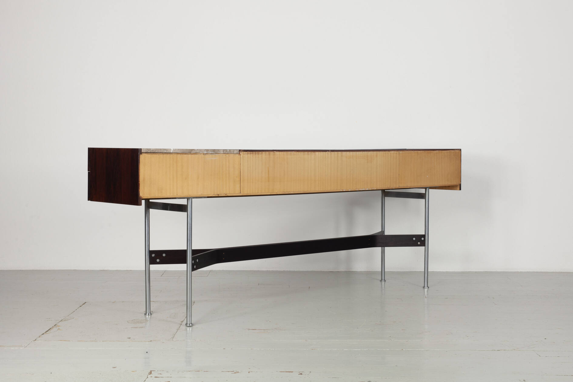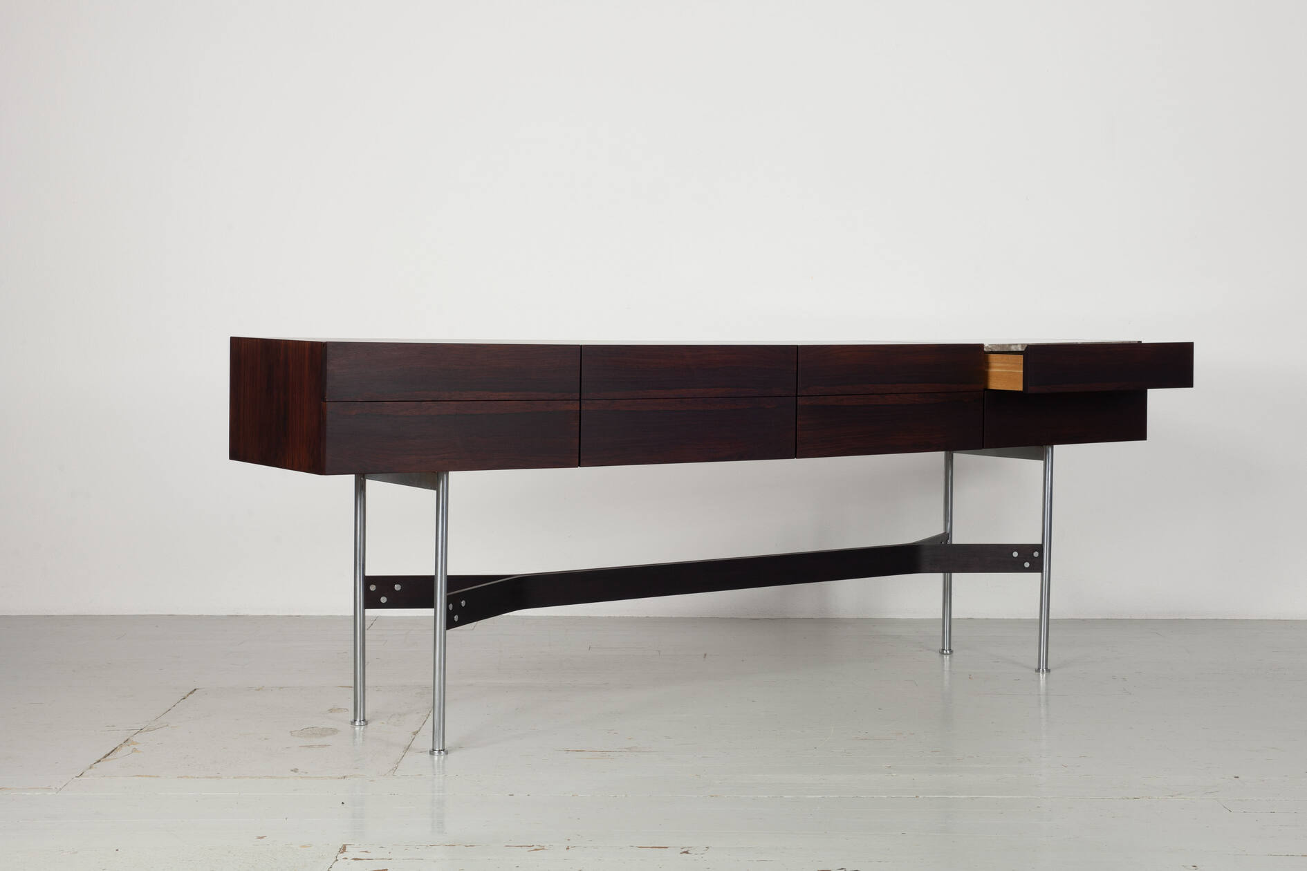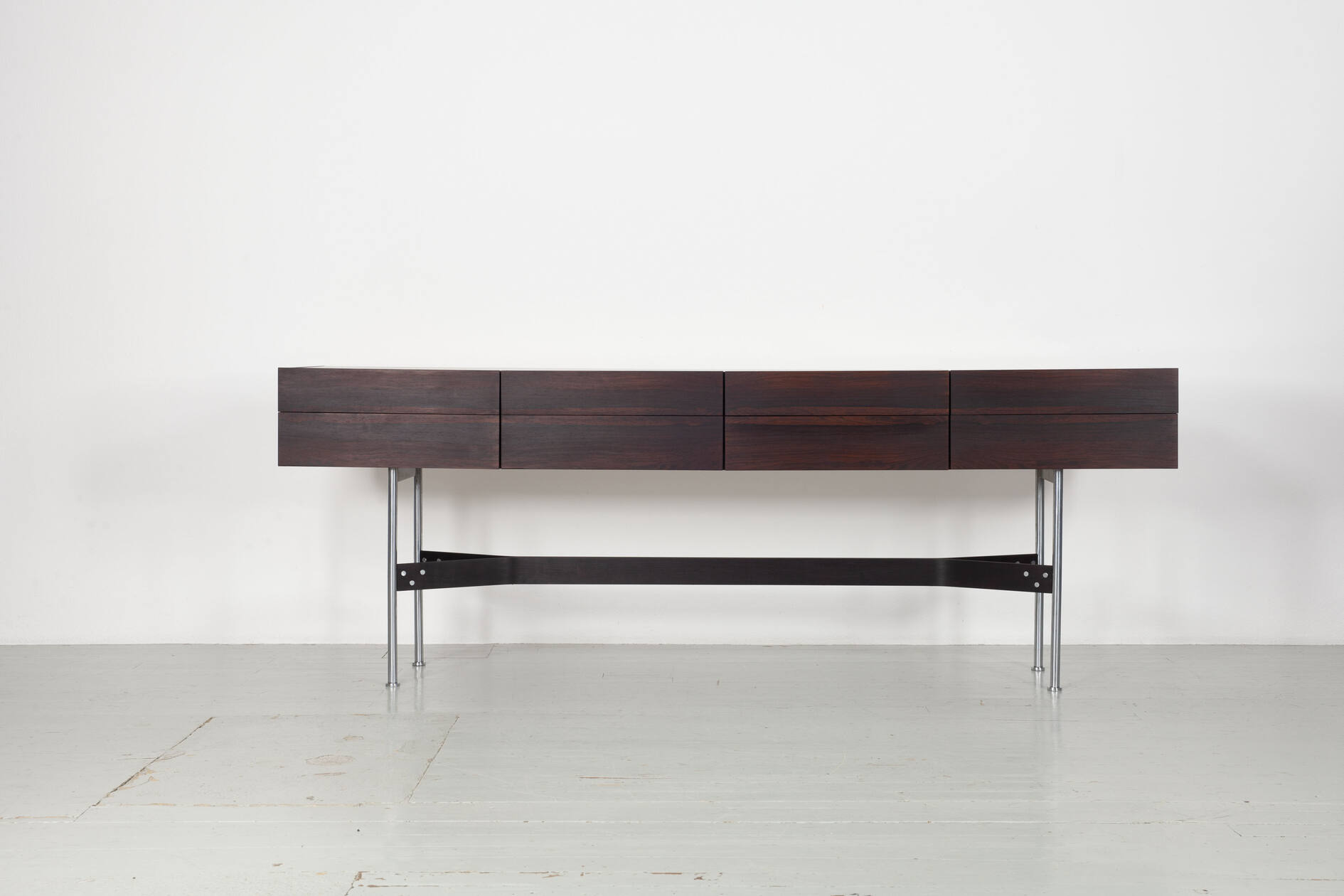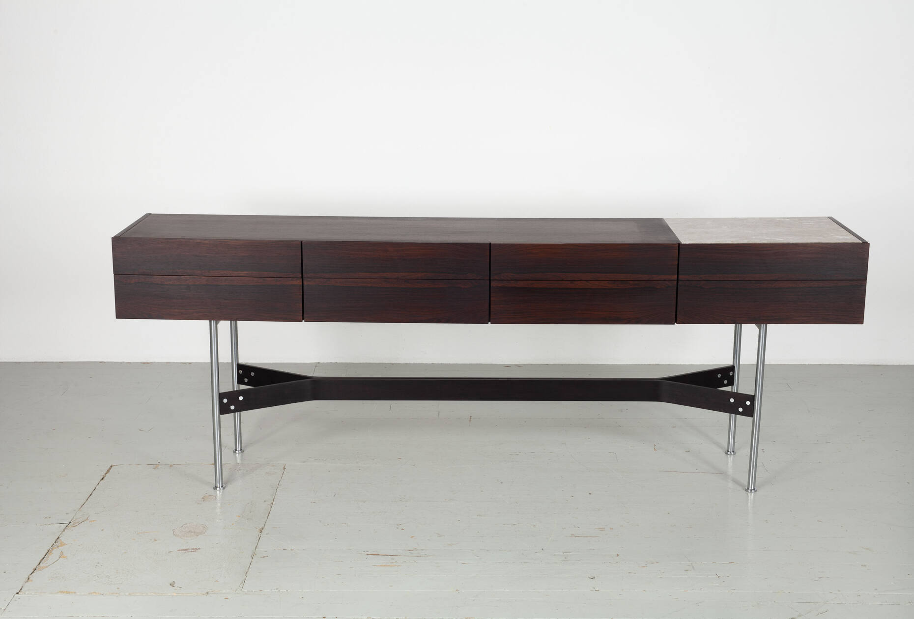 Diese äußerst raffinierte Anrichte mit acht Schubladen besteht aus schön gemasertem Palisanderholz und ist mit einer eingelassenen, beigefarbenen Steinplatte versehen. Die Steinplatte ist gebrochen, wodurch feine Haarrisse sichtbar sind. Der Rahmen besteht aus gebürstetem Stahlrohr, welcher durch eine Sperrholzverbindung aus Palisanderholz stabilisiert wird. Das Board befindet sich jedoch in einem sehr guten restaurierten Zustand.