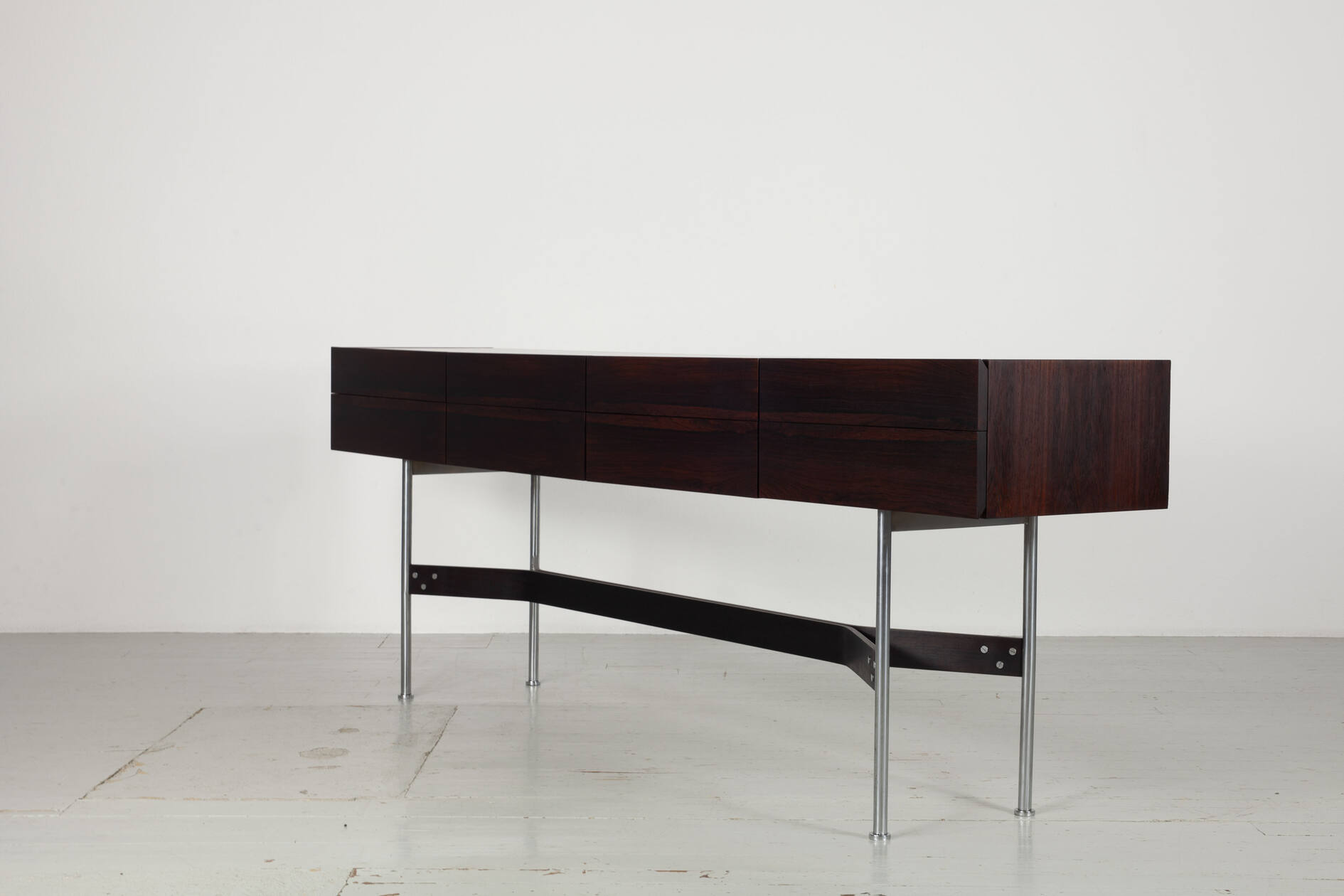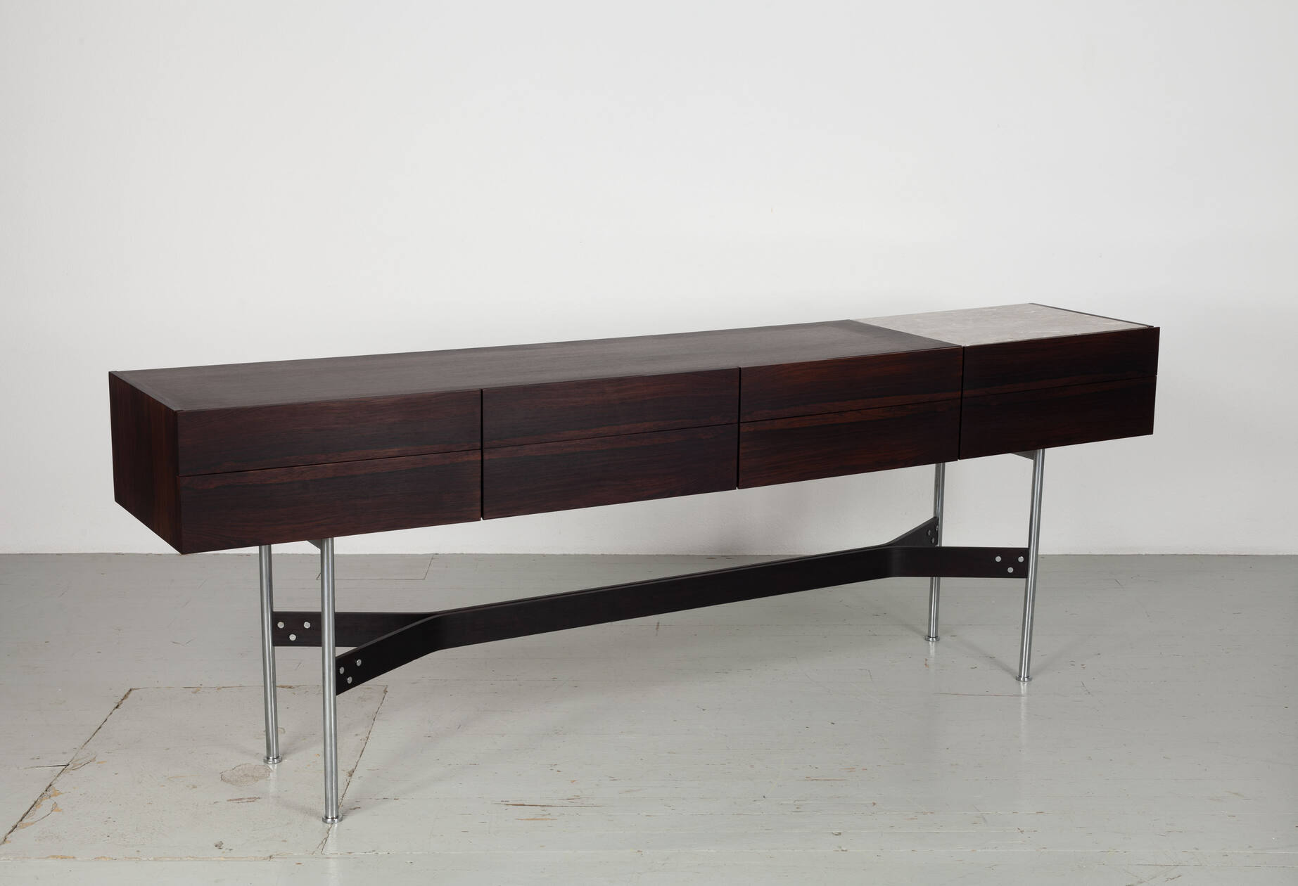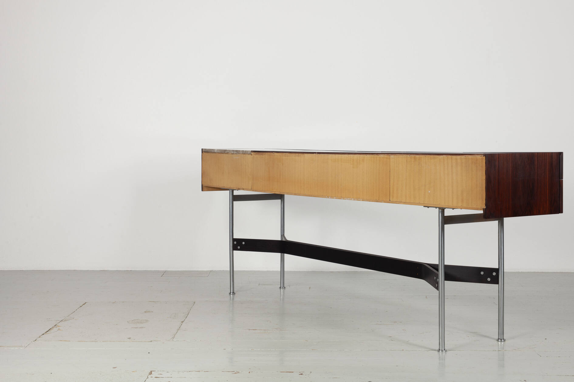 Diese äußerst raffinierte Anrichte mit acht Schubladen besteht aus schön gemasertem Palisanderholz und ist mit einer eingelassenen, beigefarbenen Steinplatte versehen. Die Steinplatte ist gebrochen, wodurch feine Haarrisse sichtbar sind. Der Rahmen besteht aus gebürstetem Stahlrohr, welcher durch eine Sperrholzverbindung aus Palisanderholz stabilisiert wird. Das Board befindet sich jedoch in einem sehr guten restaurierten Zustand.