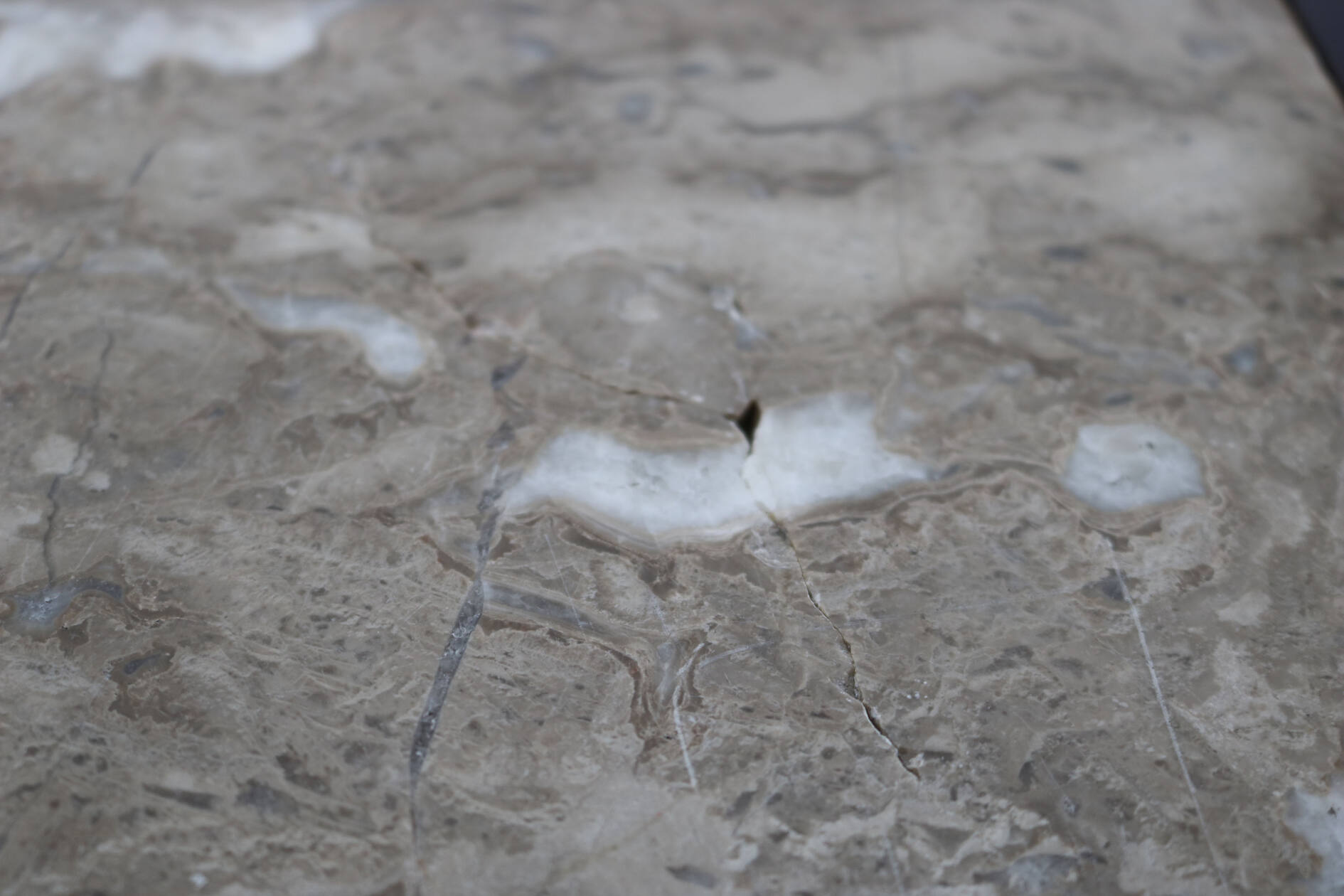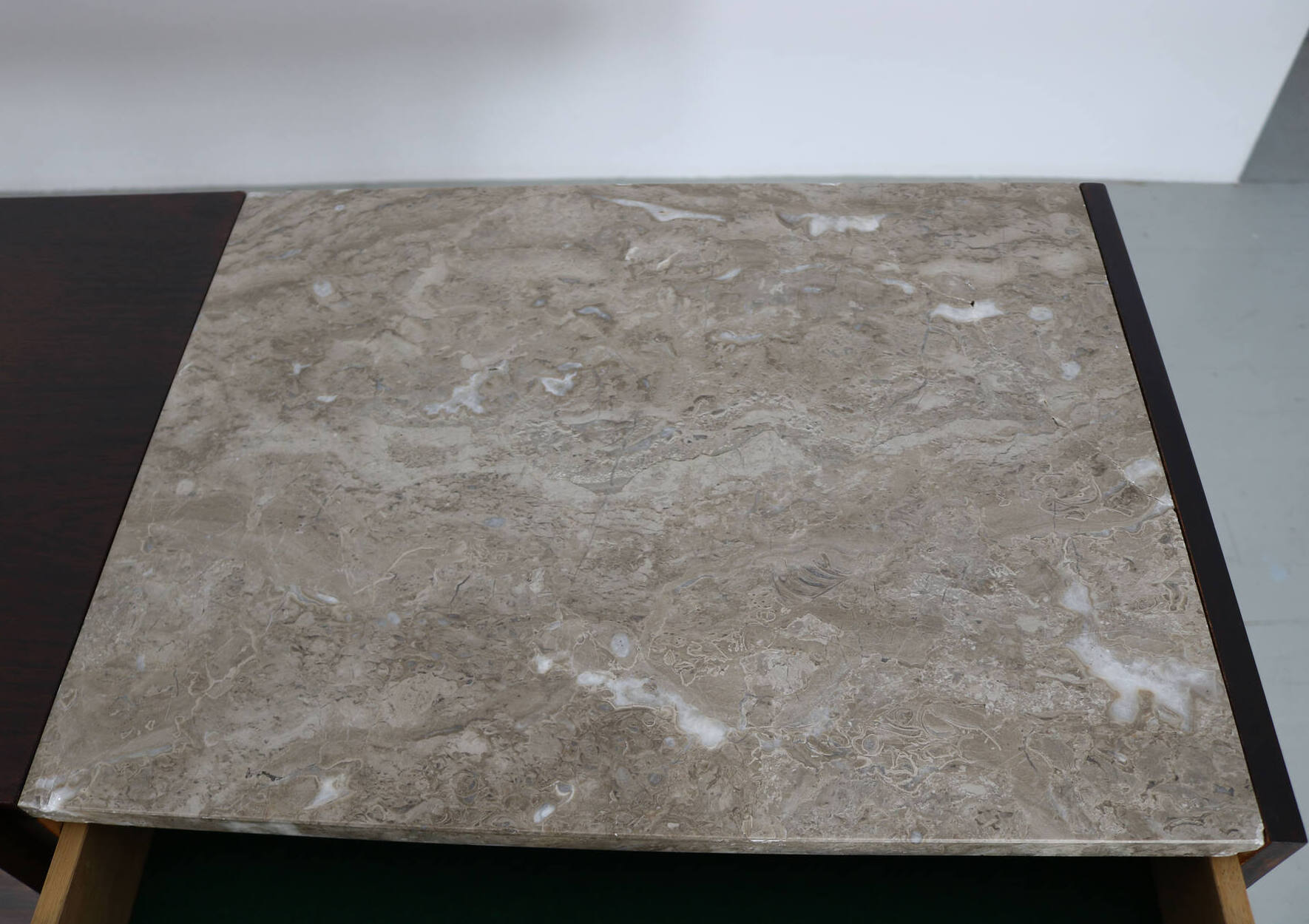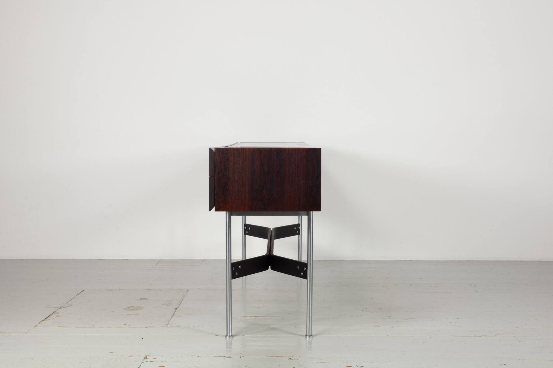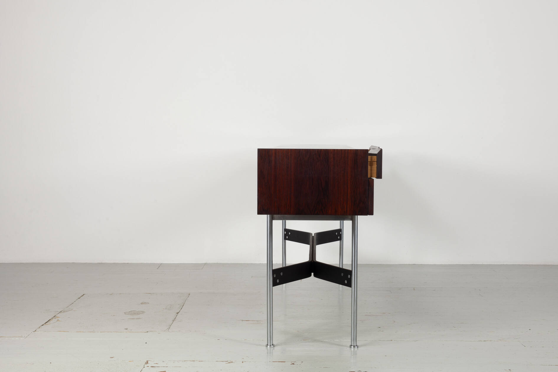 Diese äußerst raffinierte Anrichte mit acht Schubladen besteht aus schön gemasertem Palisanderholz und ist mit einer eingelassenen, beigefarbenen Steinplatte versehen. Die Steinplatte ist gebrochen, wodurch feine Haarrisse sichtbar sind. Der Rahmen besteht aus gebürstetem Stahlrohr, welcher durch eine Sperrholzverbindung aus Palisanderholz stabilisiert wird. Das Board befindet sich jedoch in einem sehr guten restaurierten Zustand.