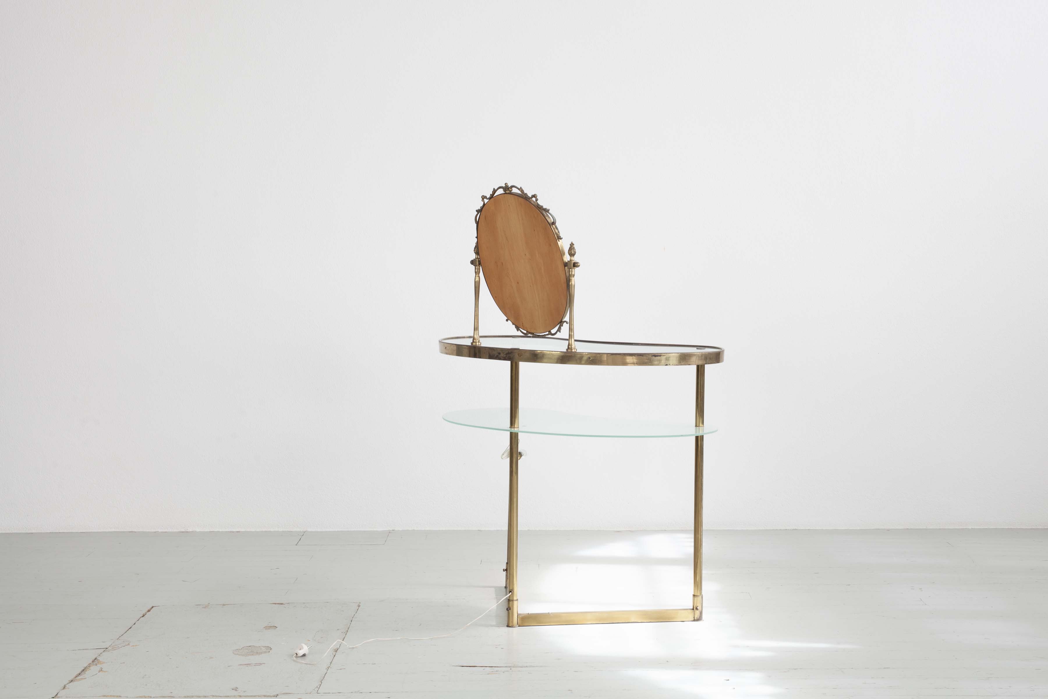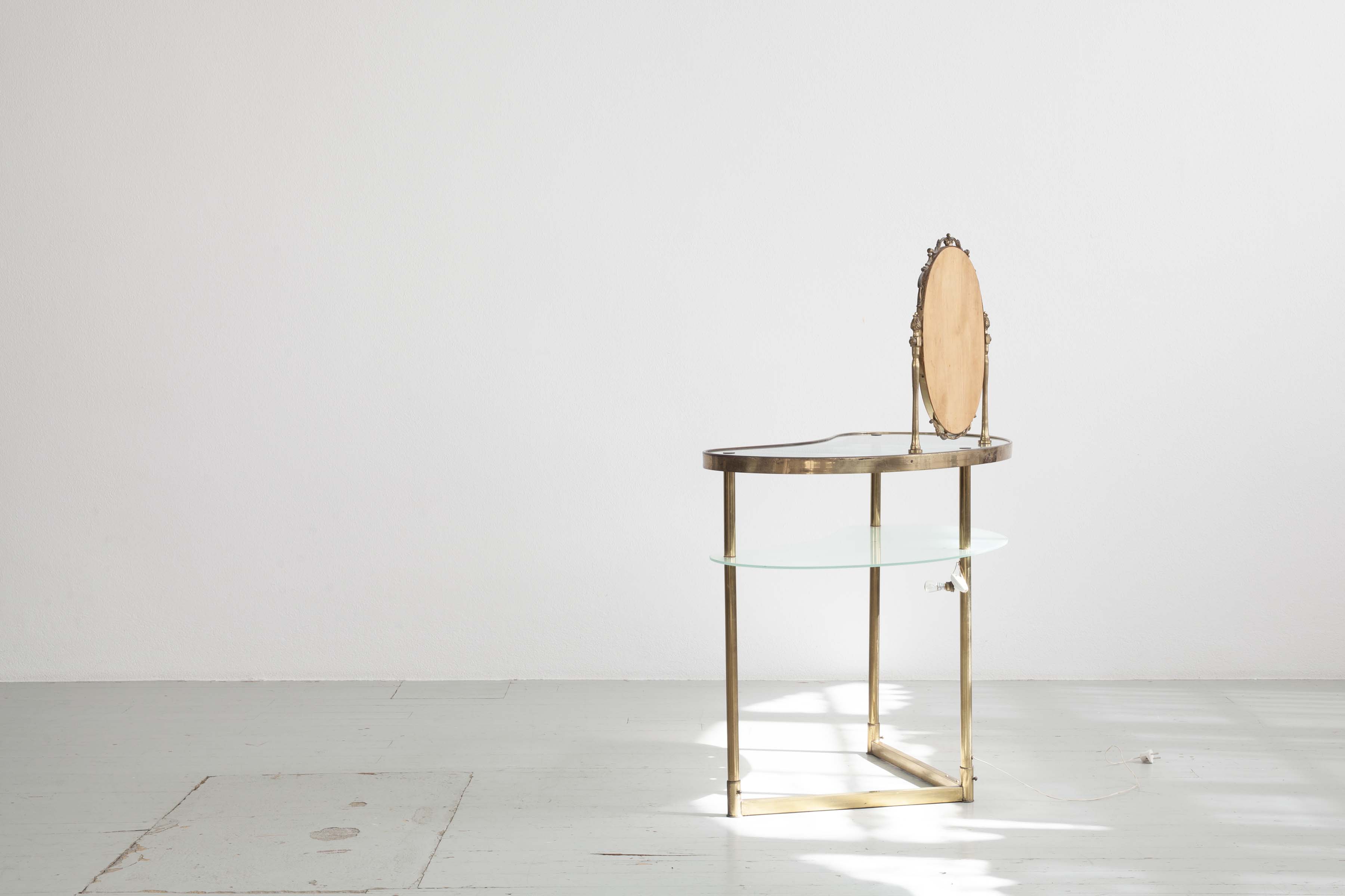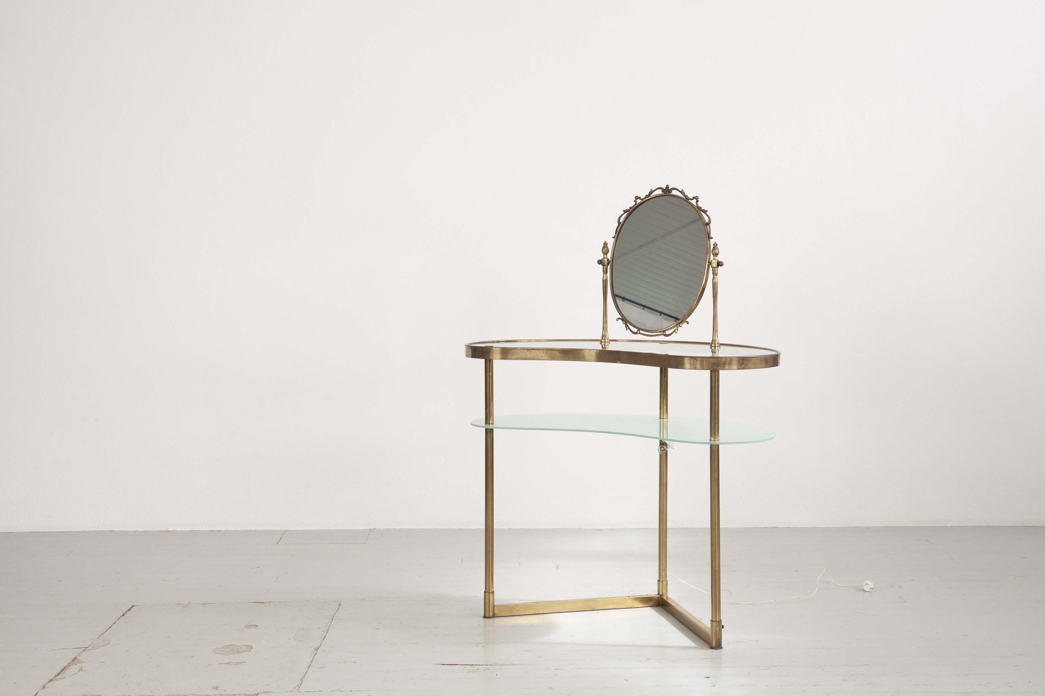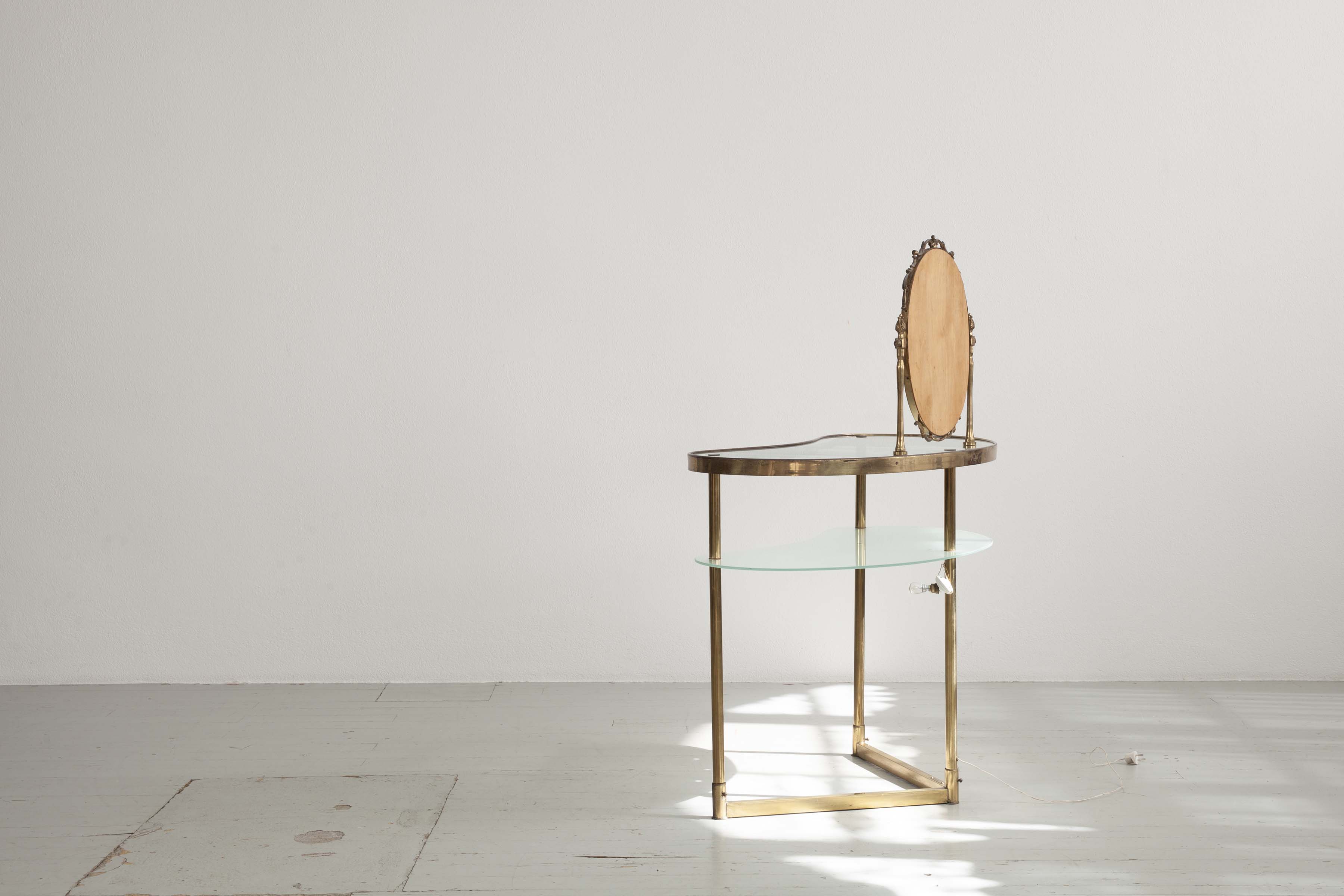 50er-Jahre Schminktisch, zugeschrieben Luigi Brusotti. Mit kippbarem Spiegel, Hauptablage aus Glas und unterer, satinierten Glasablage mit Stern-Dekor. E14-Leuchtmittel zur Beleuchtung der unteren Ablage. Gestell aus massivem Messing mit schöner Patina. Elektrik erneuert, transportfreundlich zerlegbar. Sehr guter Vintage-Zustand.