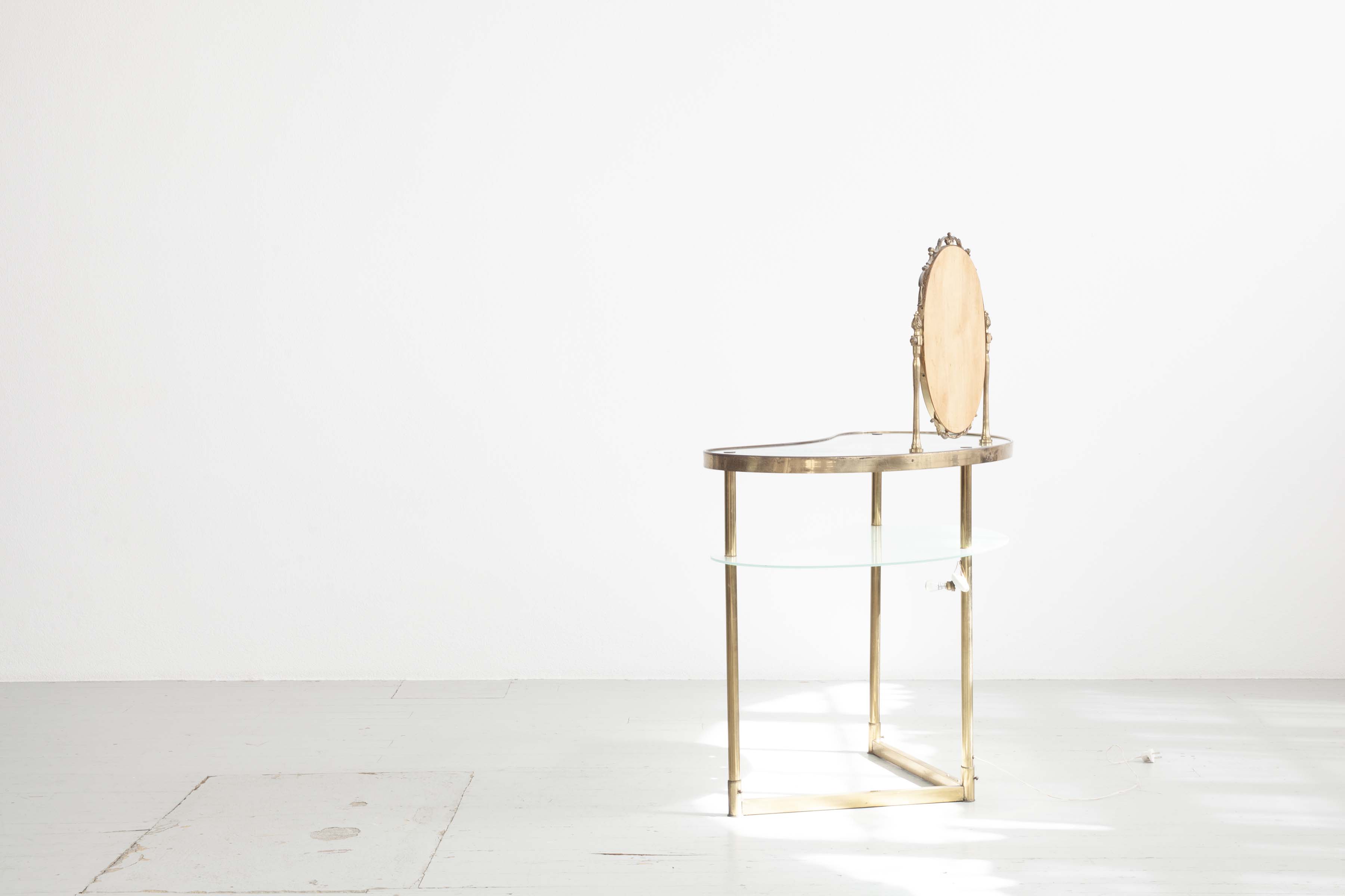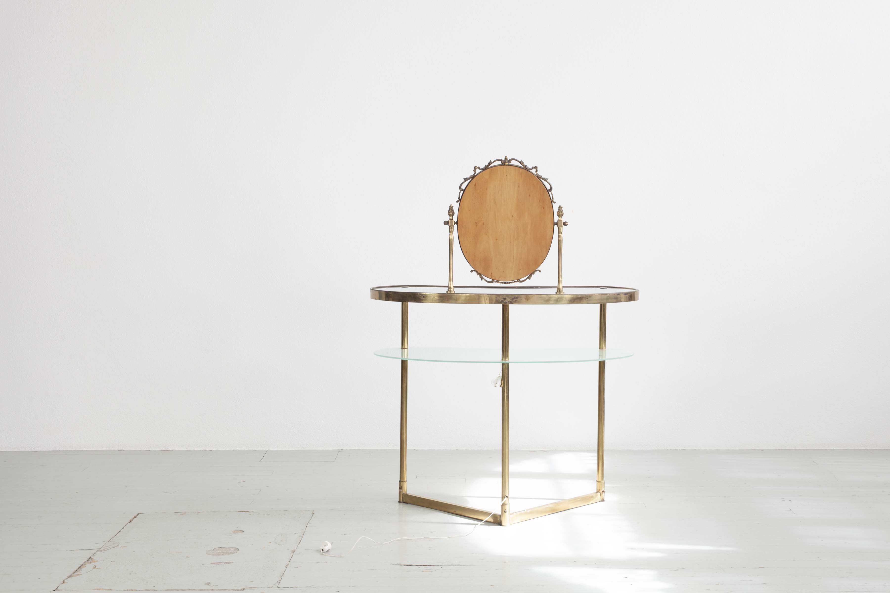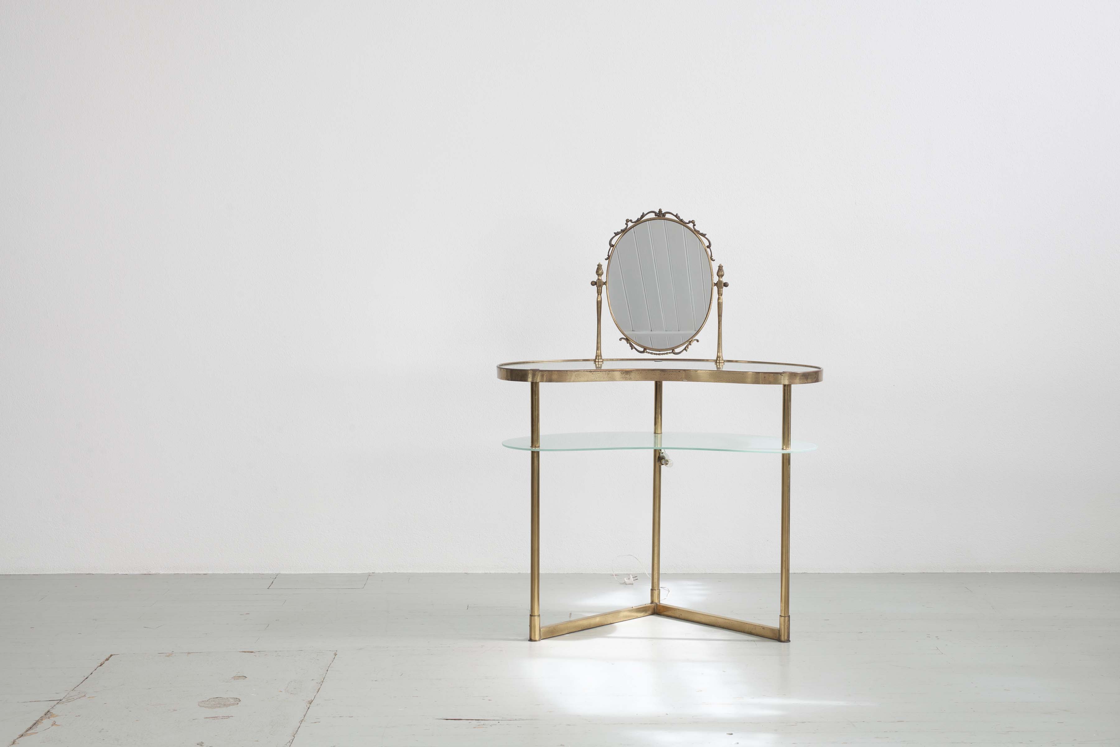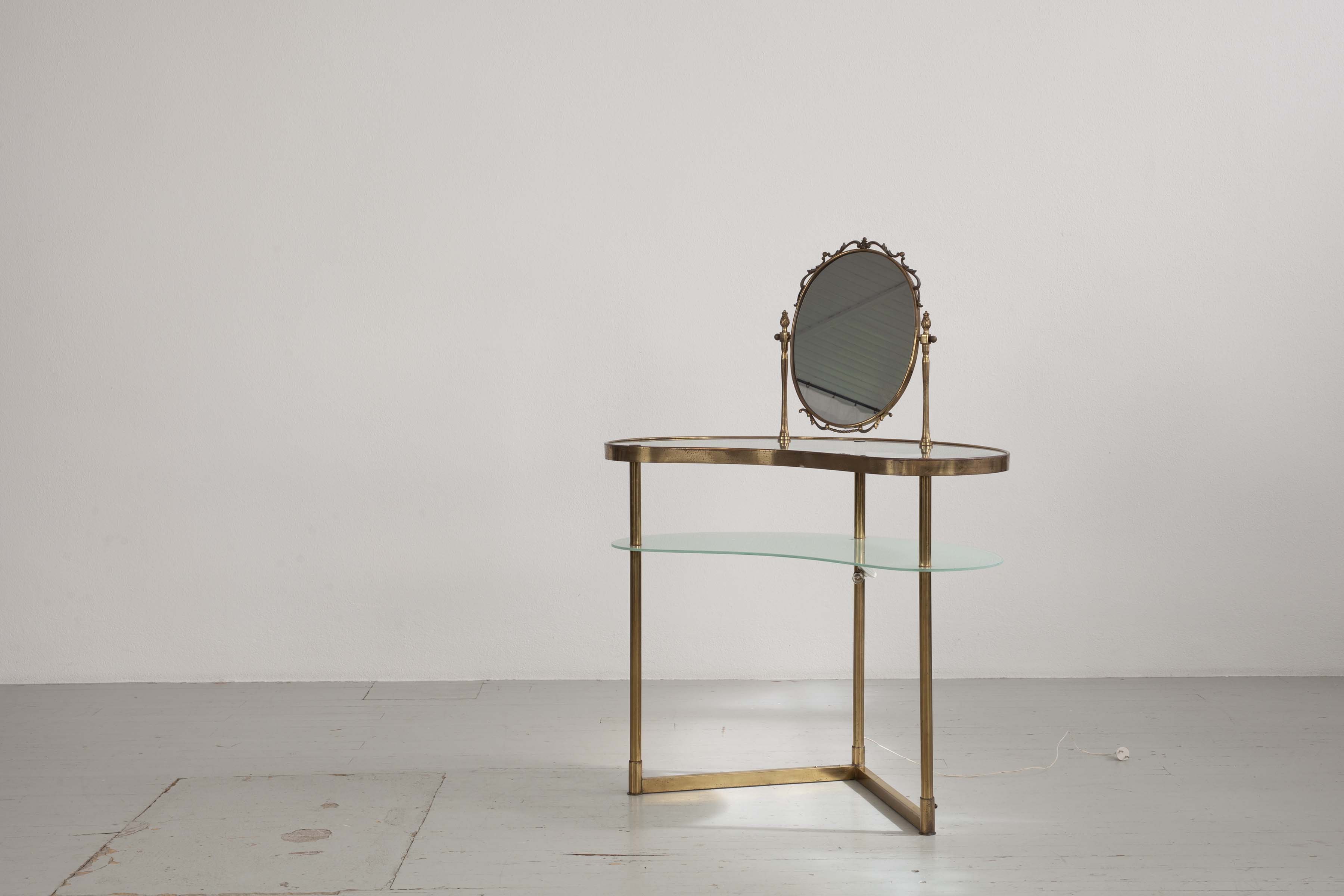 50er-Jahre Schminktisch, zugeschrieben Luigi Brusotti. Mit kippbarem Spiegel, Hauptablage aus Glas und unterer, satinierten Glasablage mit Stern-Dekor. E14-Leuchtmittel zur Beleuchtung der unteren Ablage. Gestell aus massivem Messing mit schöner Patina. Elektrik erneuert, transportfreundlich zerlegbar. Sehr guter Vintage-Zustand.