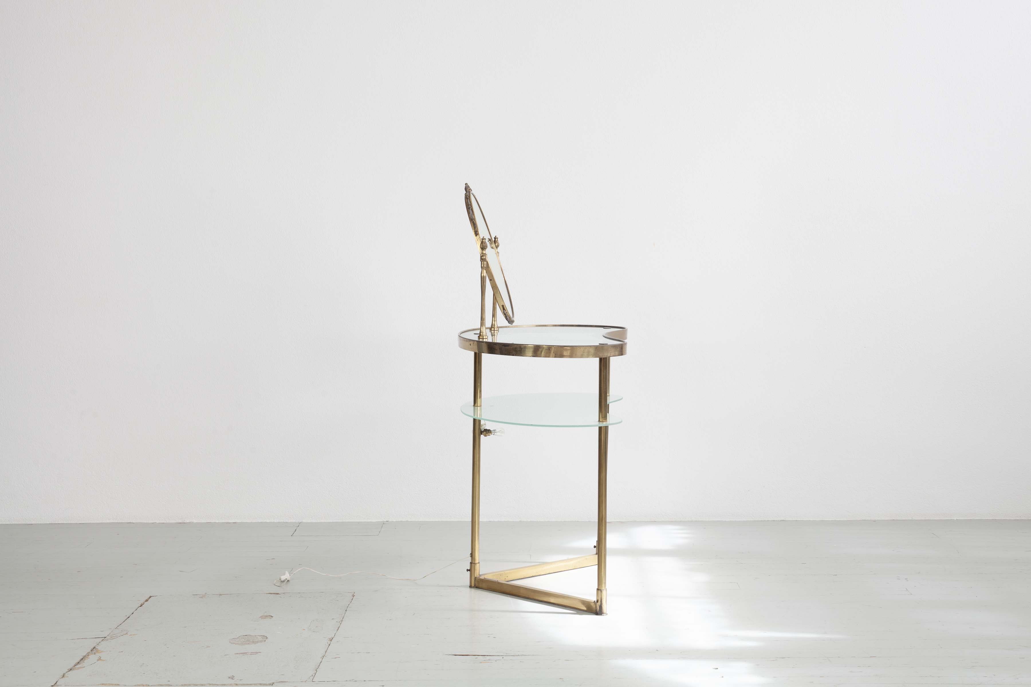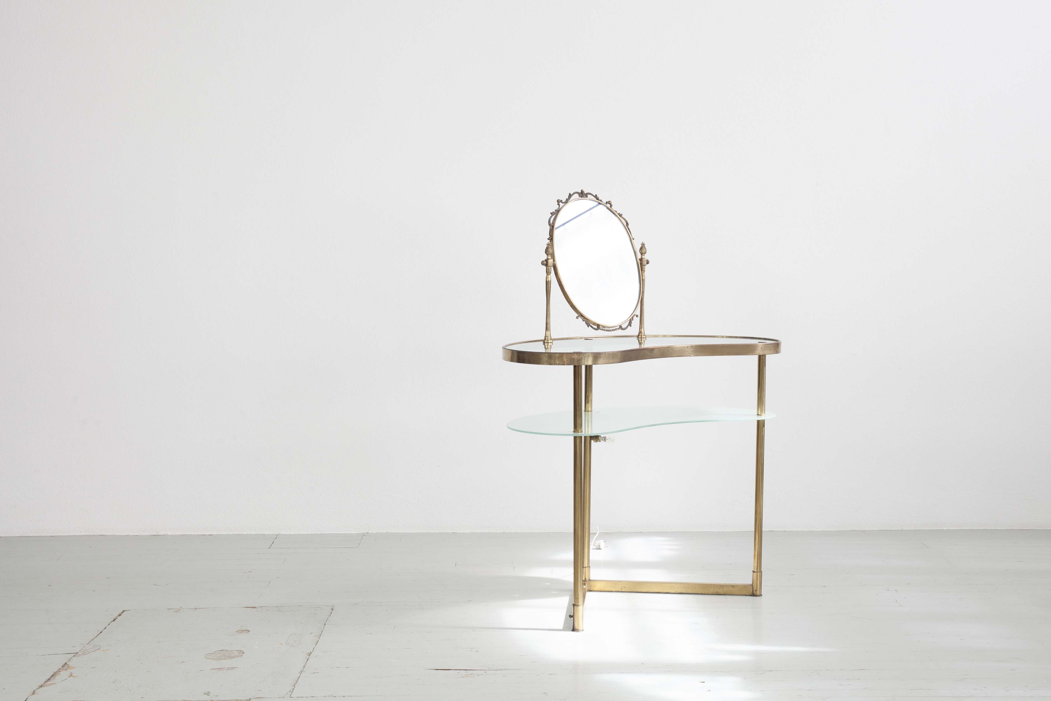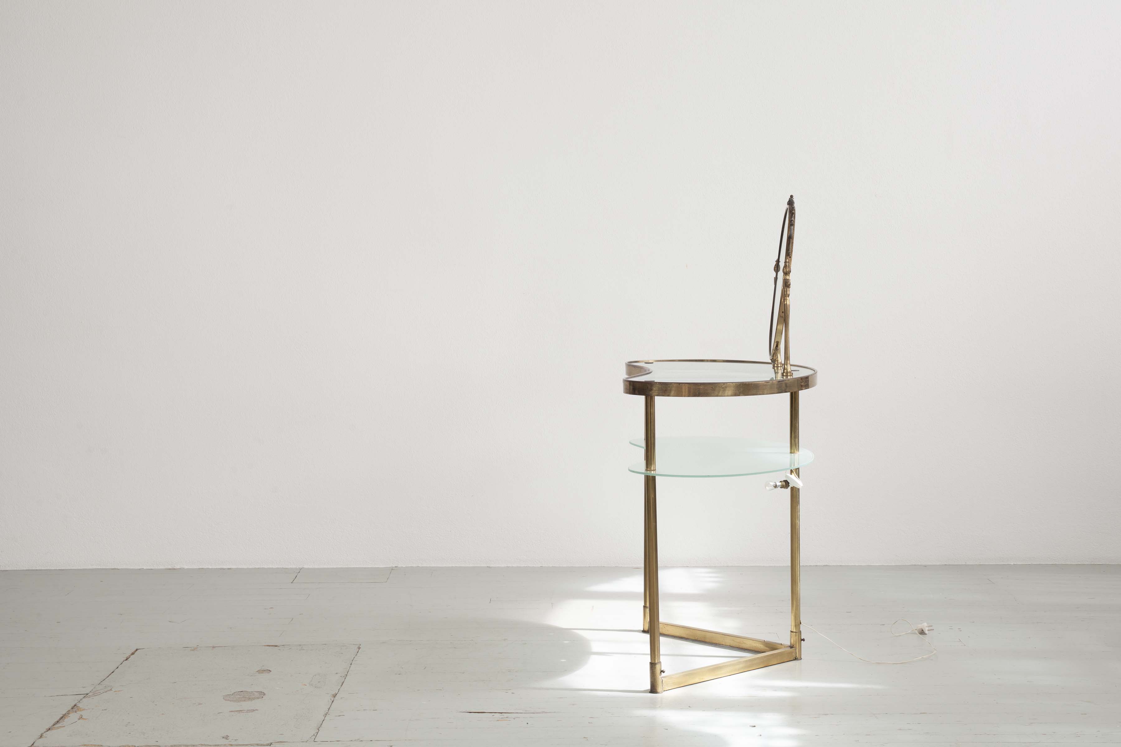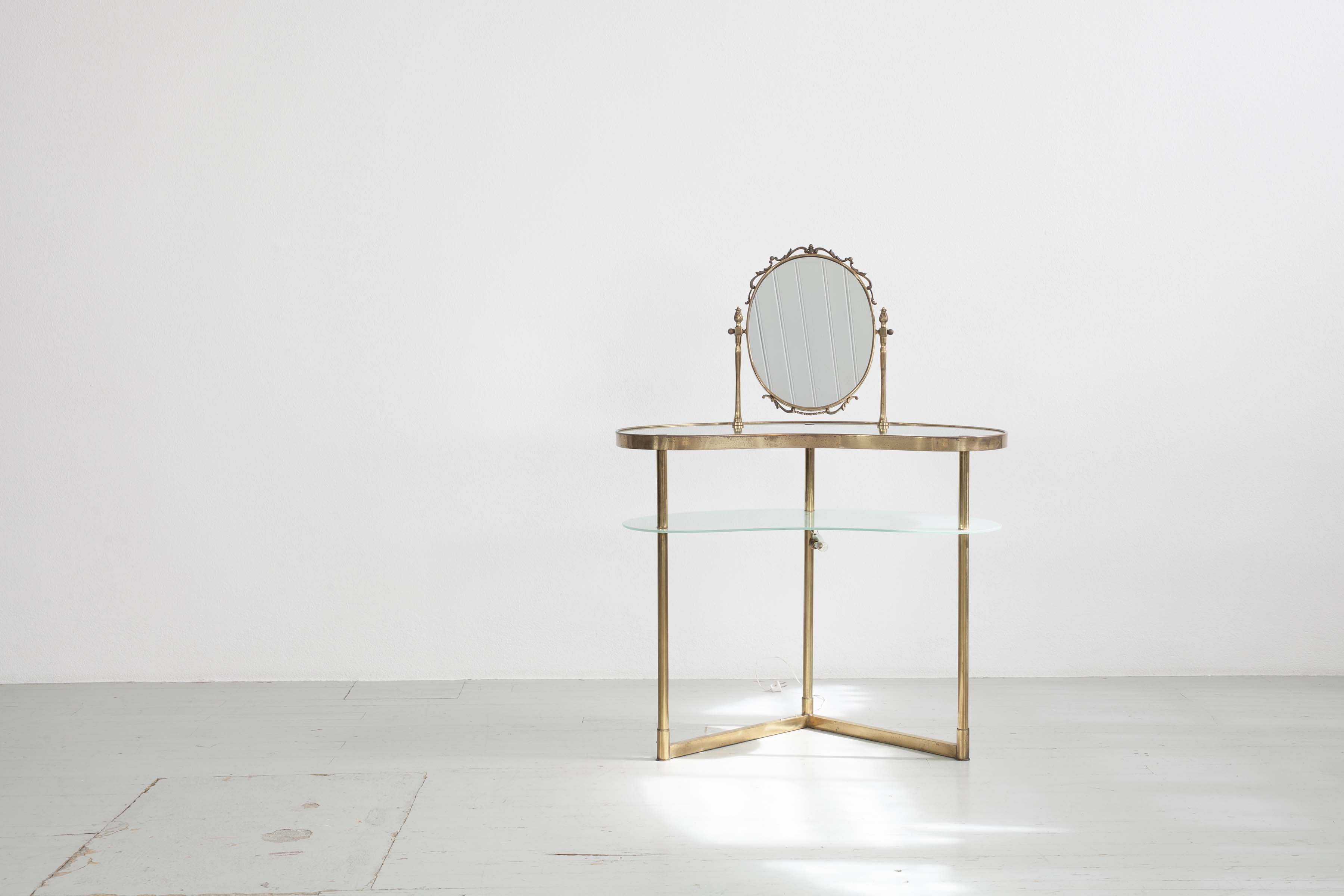 50er-Jahre Schminktisch, zugeschrieben Luigi Brusotti. Mit kippbarem Spiegel, Hauptablage aus Glas und unterer, satinierten Glasablage mit Stern-Dekor. E14-Leuchtmittel zur Beleuchtung der unteren Ablage. Gestell aus massivem Messing mit schöner Patina. Elektrik erneuert, transportfreundlich zerlegbar. Sehr guter Vintage-Zustand.