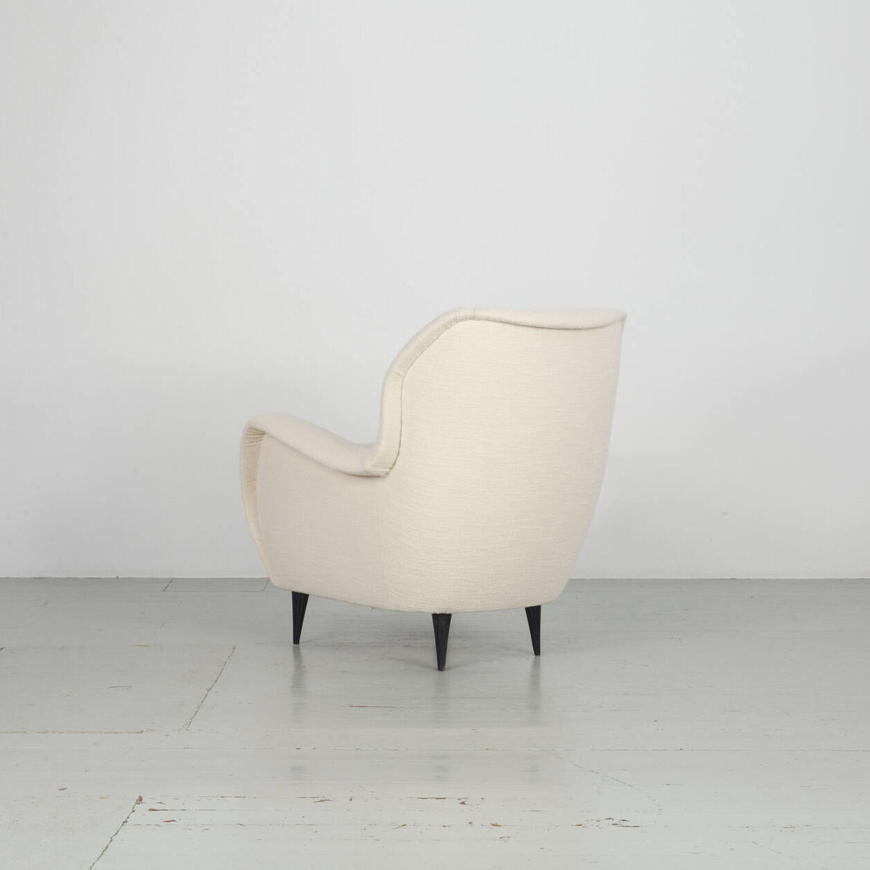 Italienischer Ohrensessel aus den 50er Jahren mit Schurwollbezug. Der Sessel wurde komplett restauriert. Die Metallfedern der Sitzfläche wurden neu geschnürt, der Schaumstoff neu aufgebaut und mit er wurde mit beigem 100% Schurwollbezug in Boucléoptik der Firma Backhausen neu bezogen. Das Sitzkissen ist mit Federn gefüllt. Die spitz zulaufenden Beine wurden dunkel gebeizt.