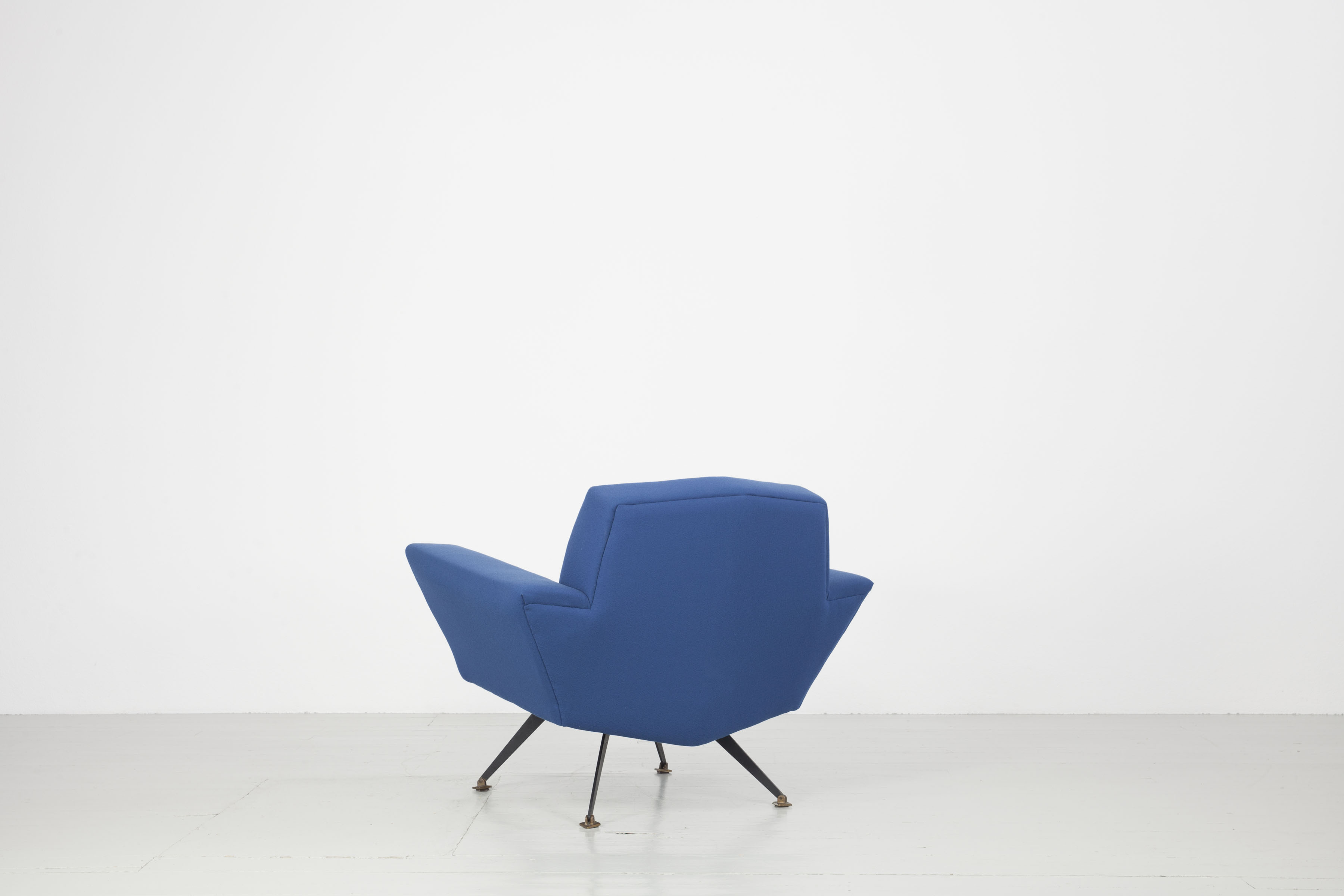 Dieses Sesselpaar „Modell 530“ wurde in den 1950iger Jahren von Lenzi entworfen und von Studio Tecnico hergestellt. Die geometrischen Möbelstücke verfügen über Armlehnen und ein Eisengestell mit Messingabschlüssen. Beide Sessel wurden von uns mit Stoff der Firma Kvadrat in blau und violett neubezogen. Das Sesselpaar befindet sich in gutem Vintage-Zustand.
