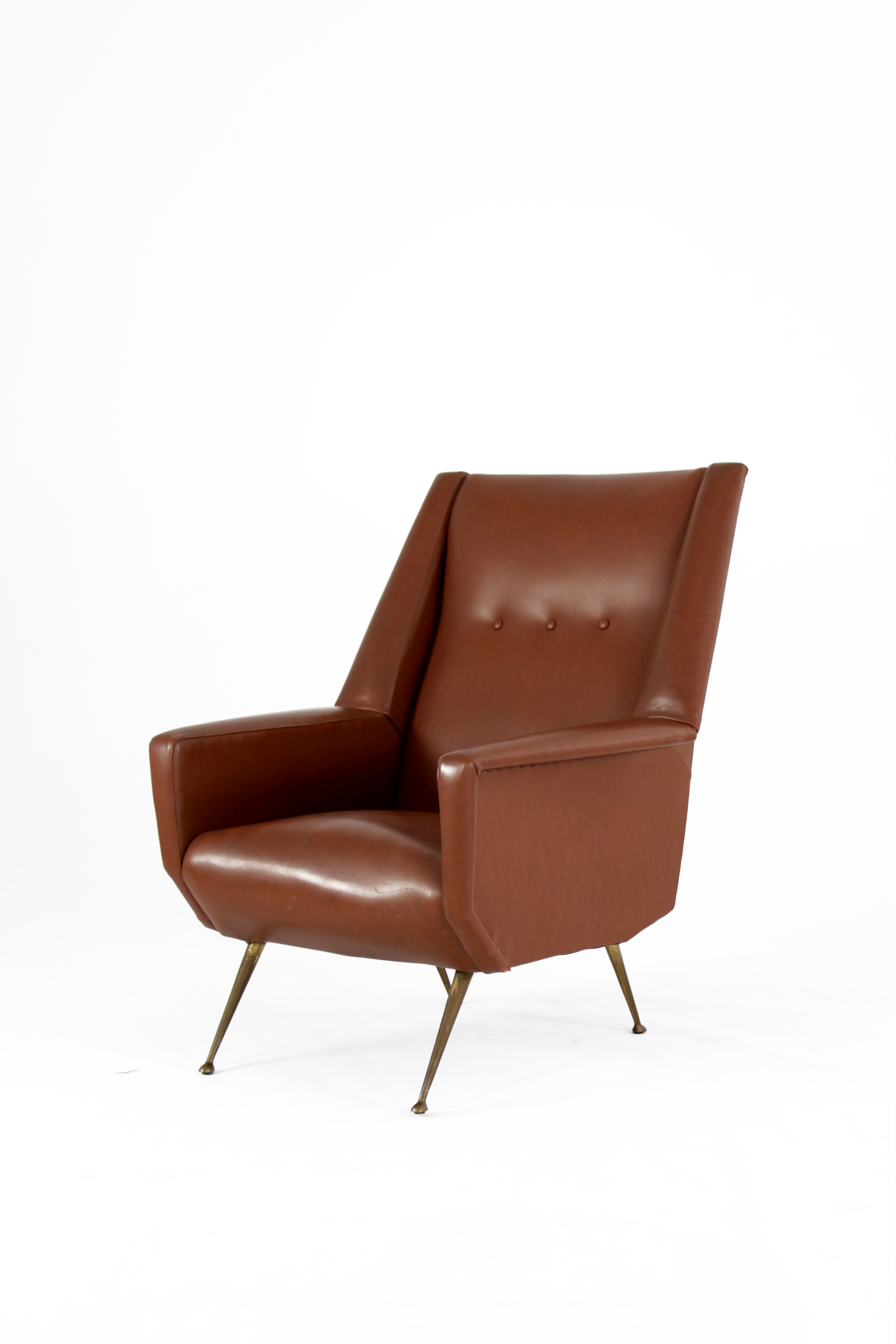 Kunstledersessel - Italien, 1950er Jahre. Der Sessel verfügt über den Originalbezug aus braunem Kunstleder und Messingbeine.