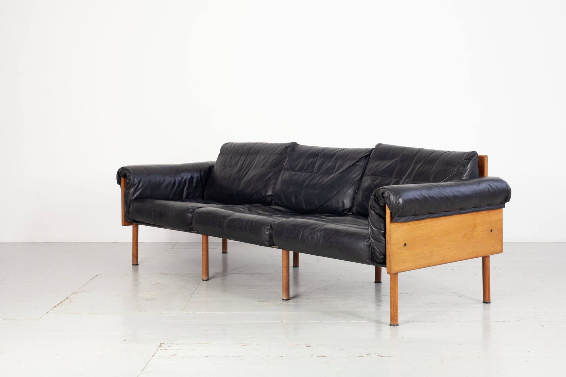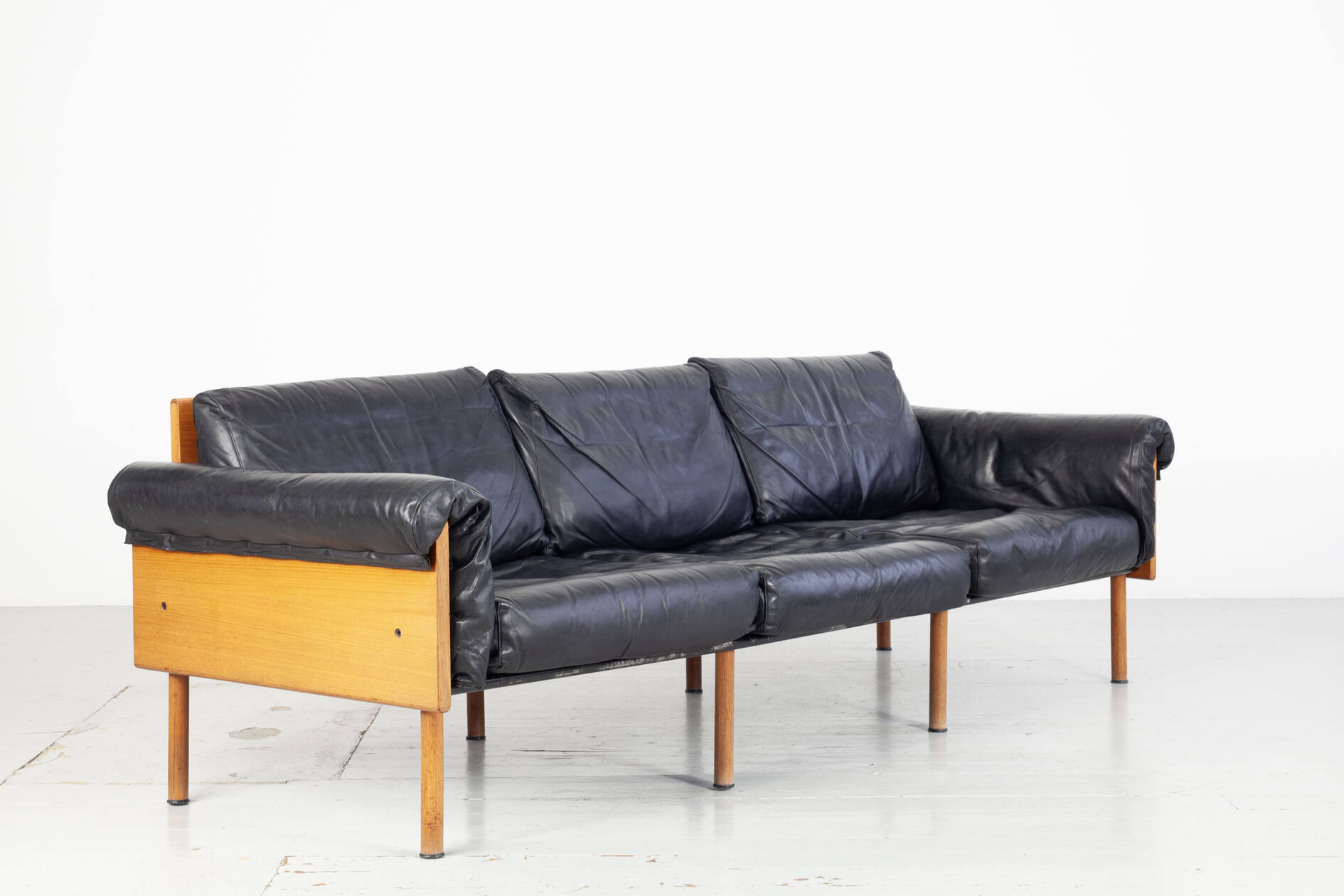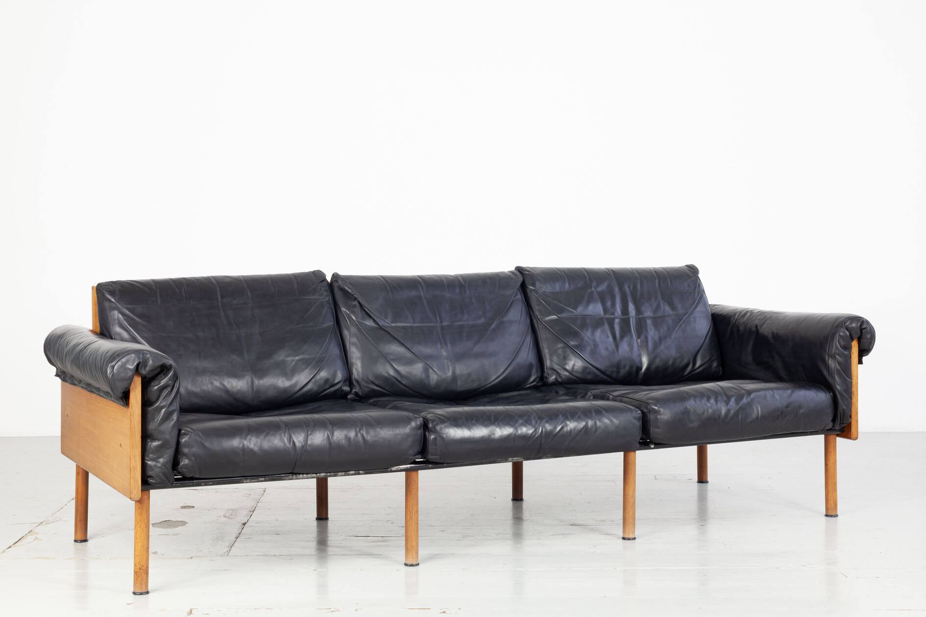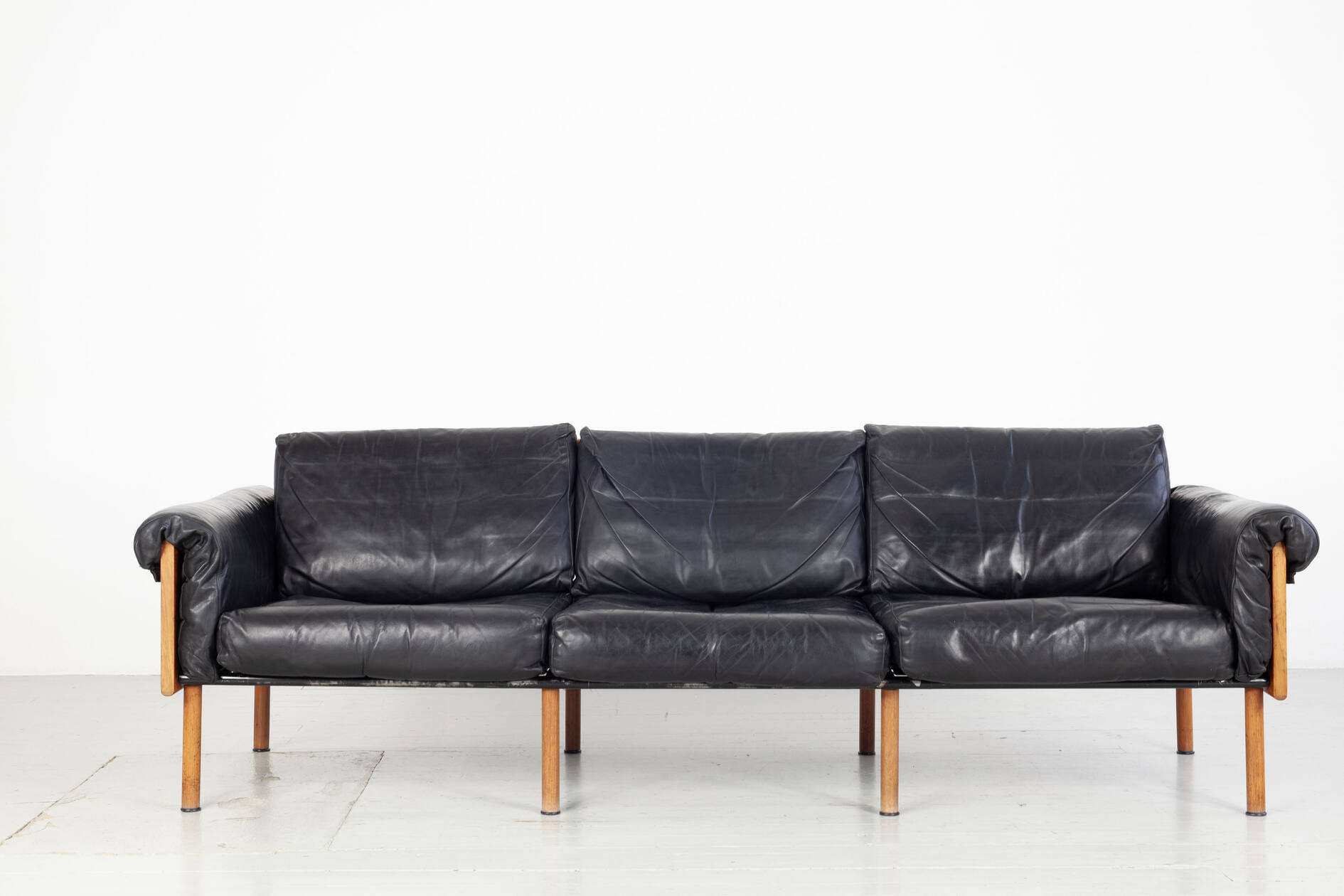 Elegantes Dreisitzer-Sofa aus den 1960er Jahren, entworfen von dem renommierten finnischen Designer Yrjö Kukkapuro für Haimi. Das Gestell besteht aus gebeizter Esche, die Sitzfläche ist mit hochwertigem schwarzem Leder bezogen. Ein originales Haimi-Label auf dem Möbelstück bestätigt die Authentizität.