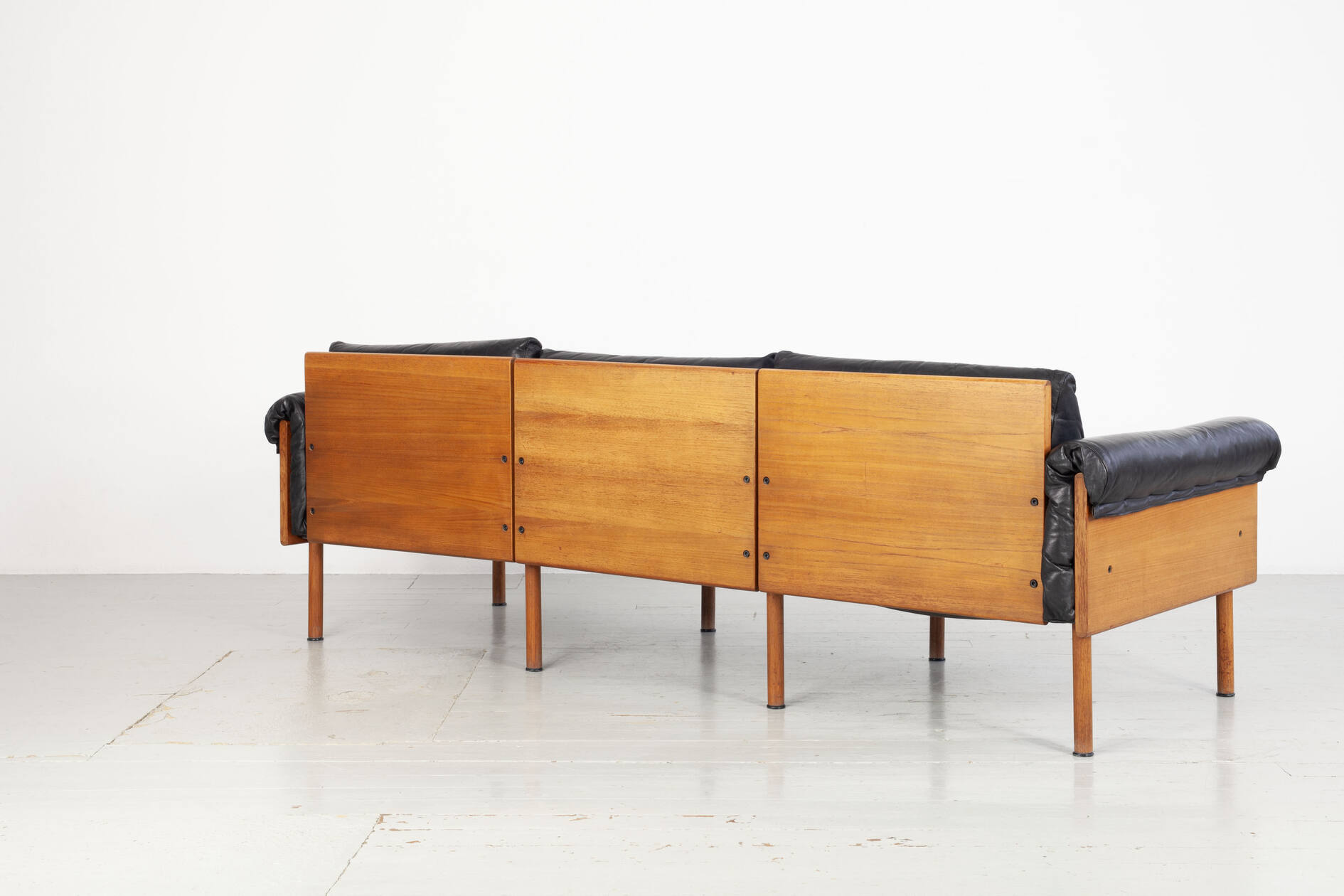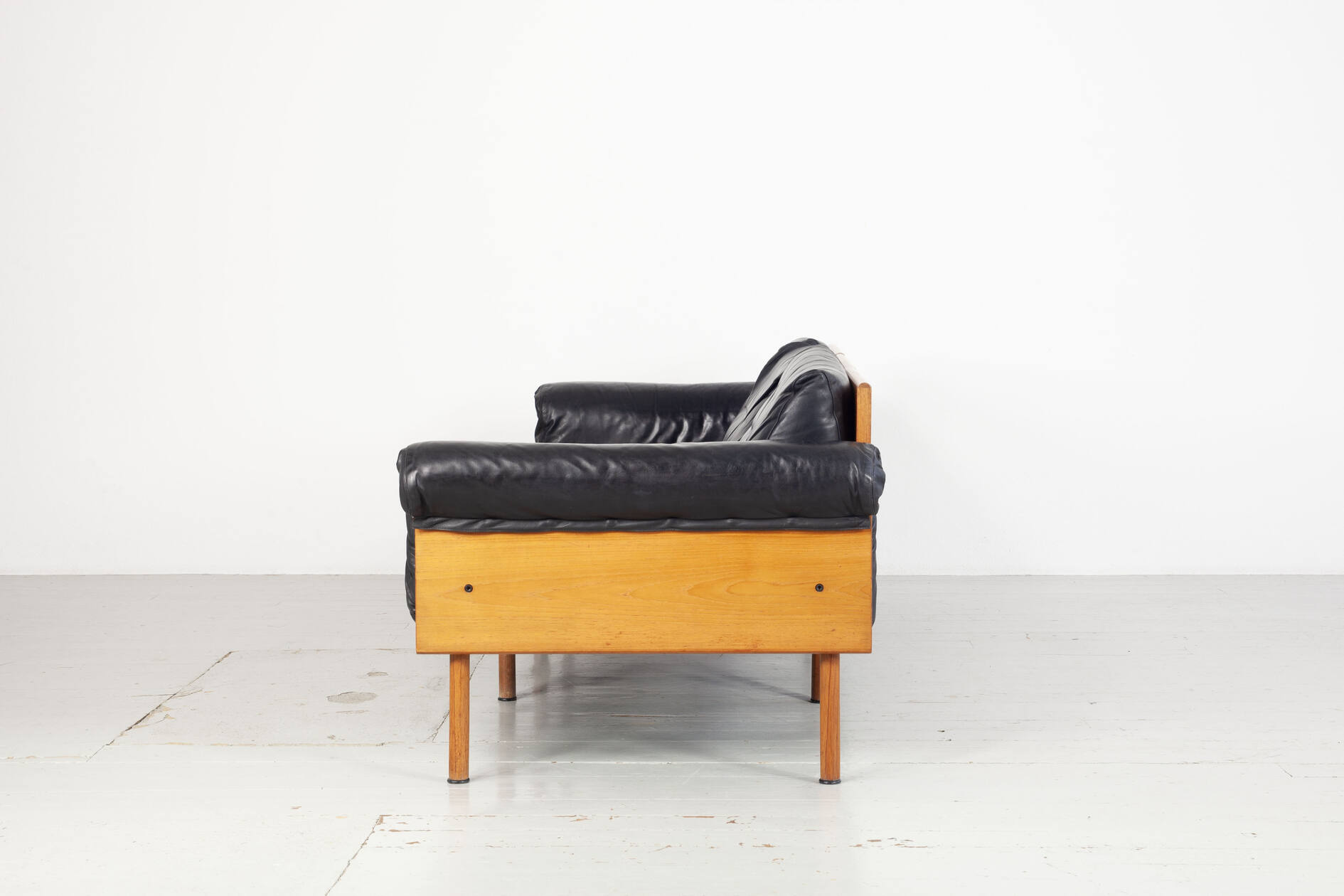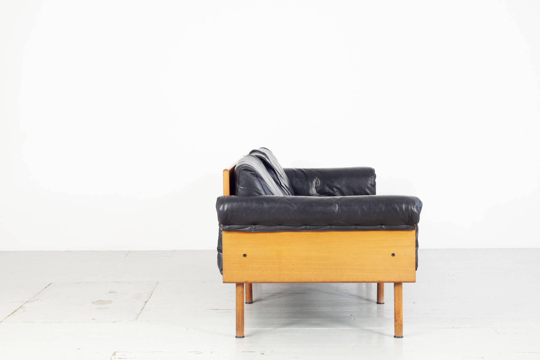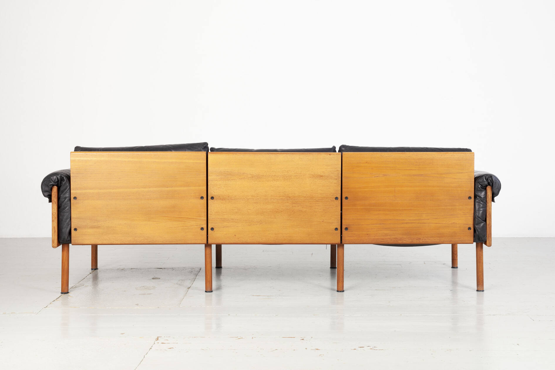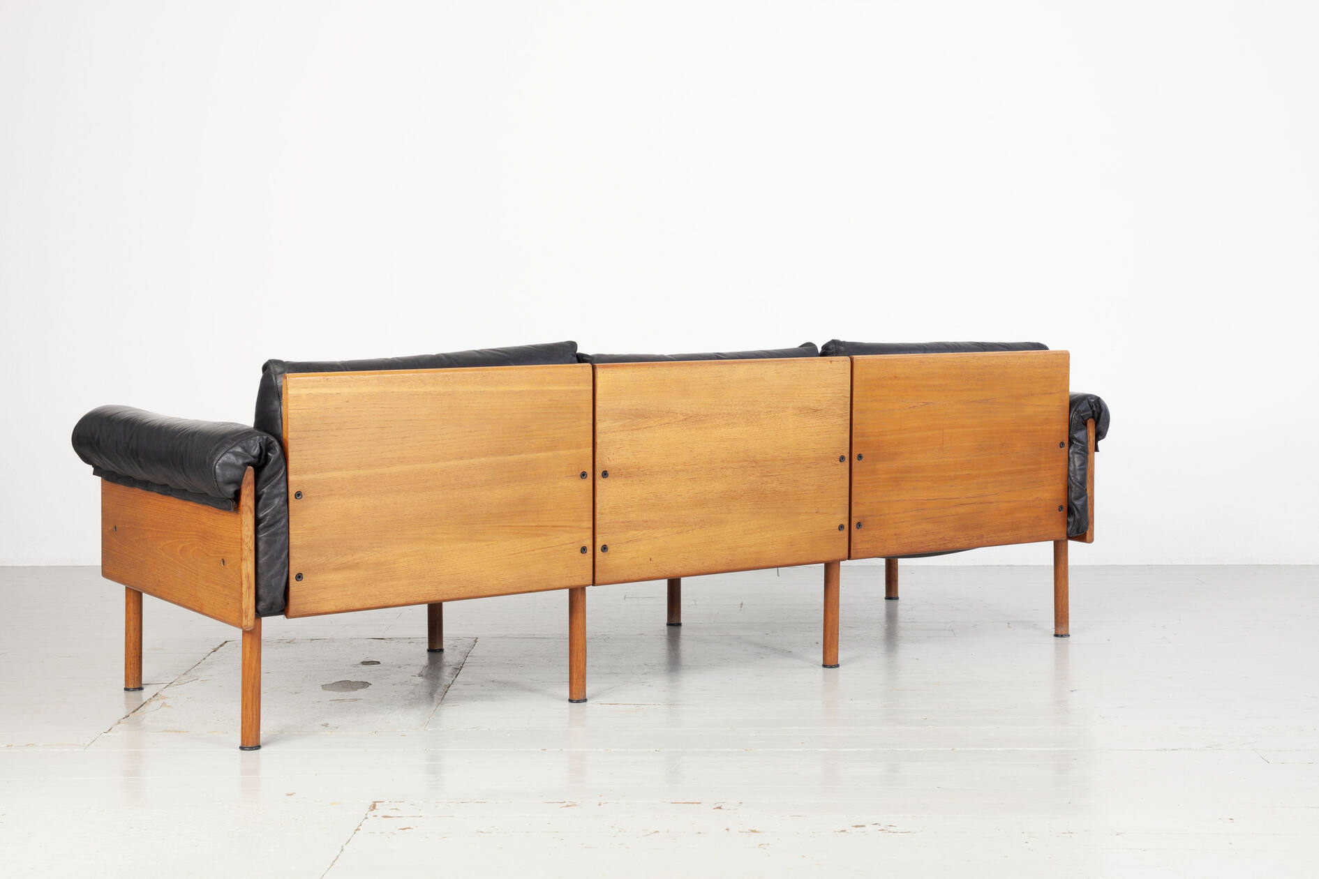 Elegantes Dreisitzer-Sofa aus den 1960er Jahren, entworfen von dem renommierten finnischen Designer Yrjö Kukkapuro für Haimi. Das Gestell besteht aus gebeizter Esche, die Sitzfläche ist mit hochwertigem schwarzem Leder bezogen. Ein originales Haimi-Label auf dem Möbelstück bestätigt die Authentizität.