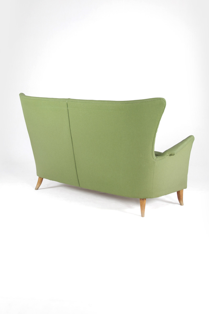 Dieses Set von einem Sofa und zwei Sesseln wurde in Italien in den 1950iger Jahren gefertigt. Die Stücke befinden sich im Originalzustand und zeigen deutliche Gebrauchsspuren, weshalb ein Neubezug nötig ist.