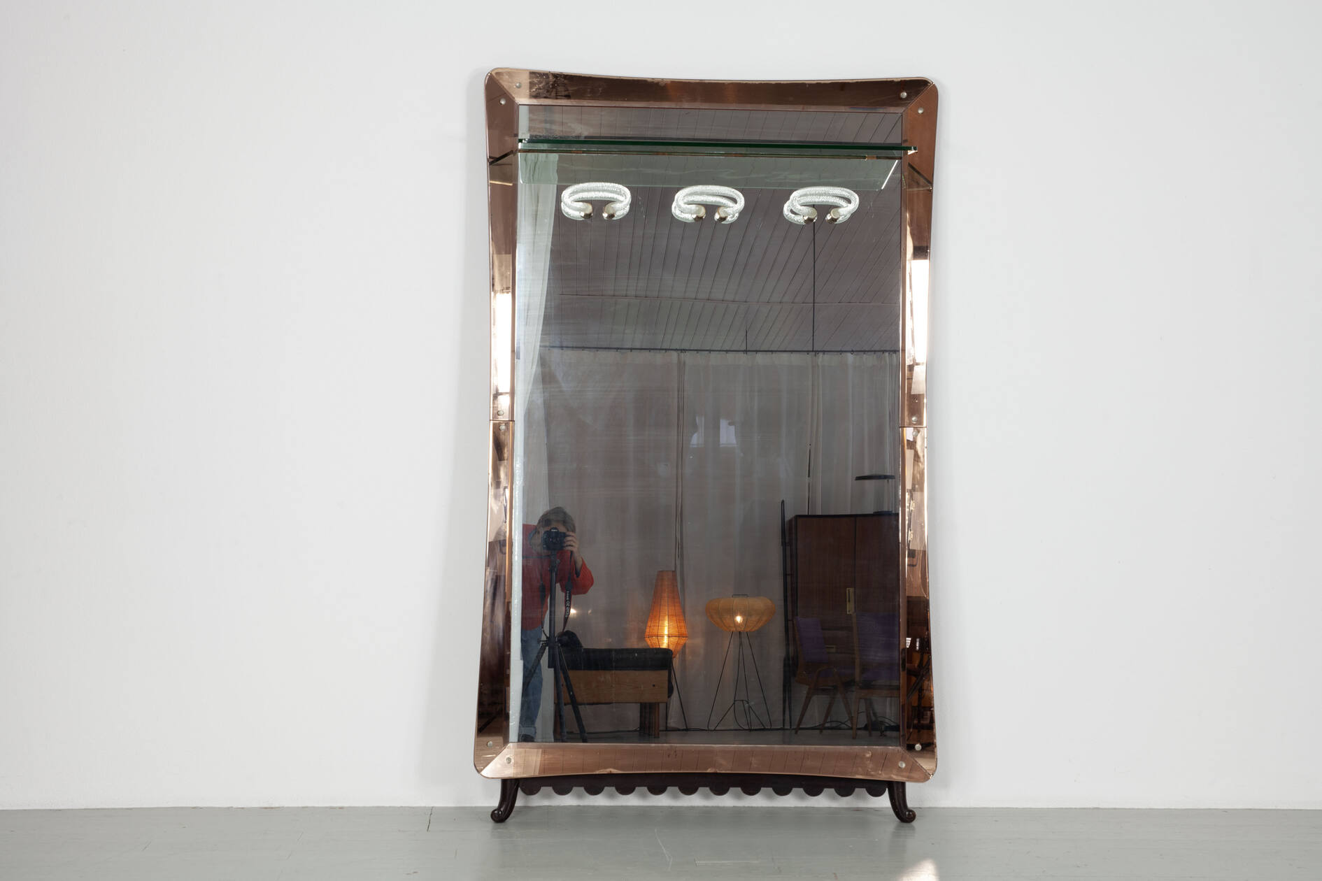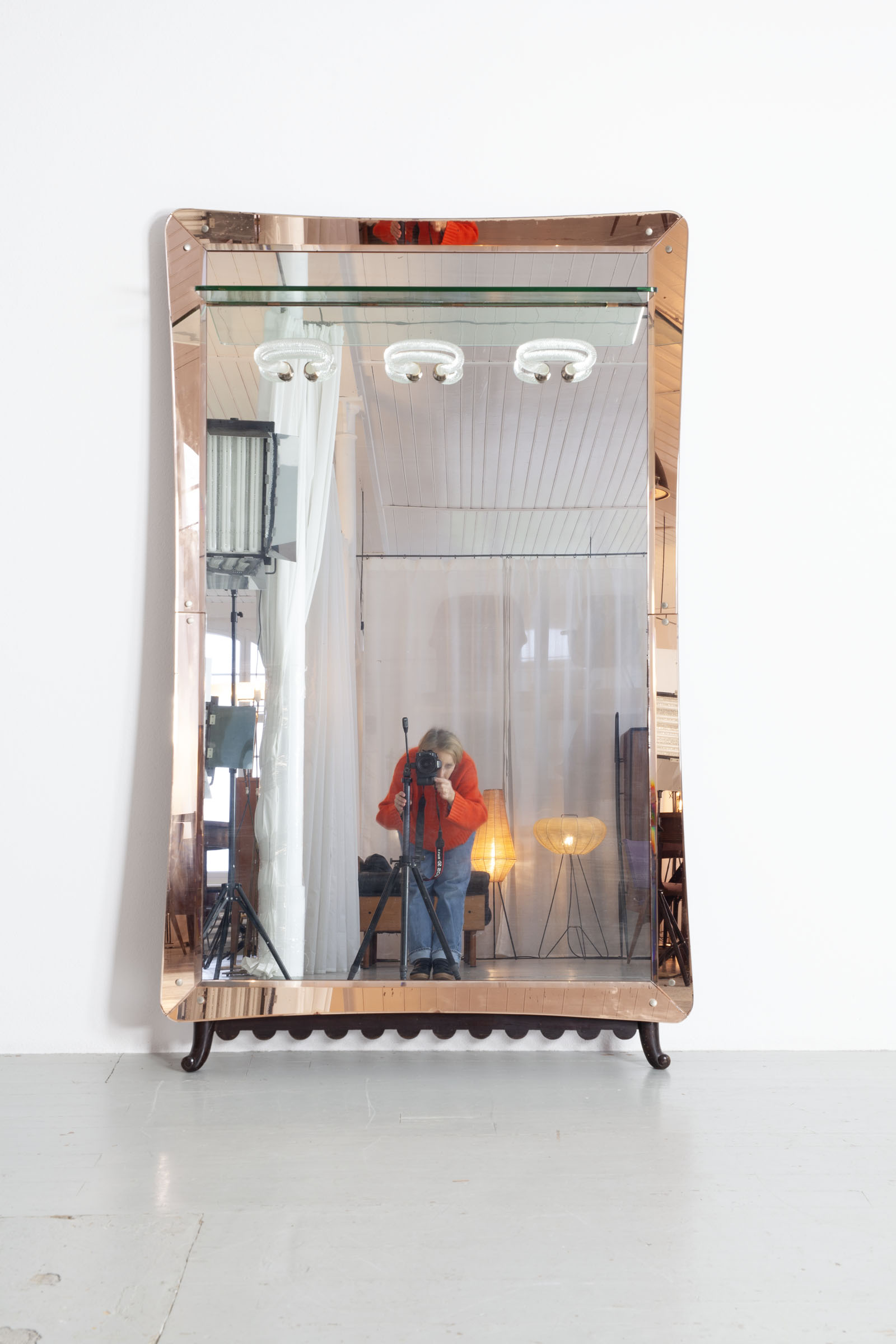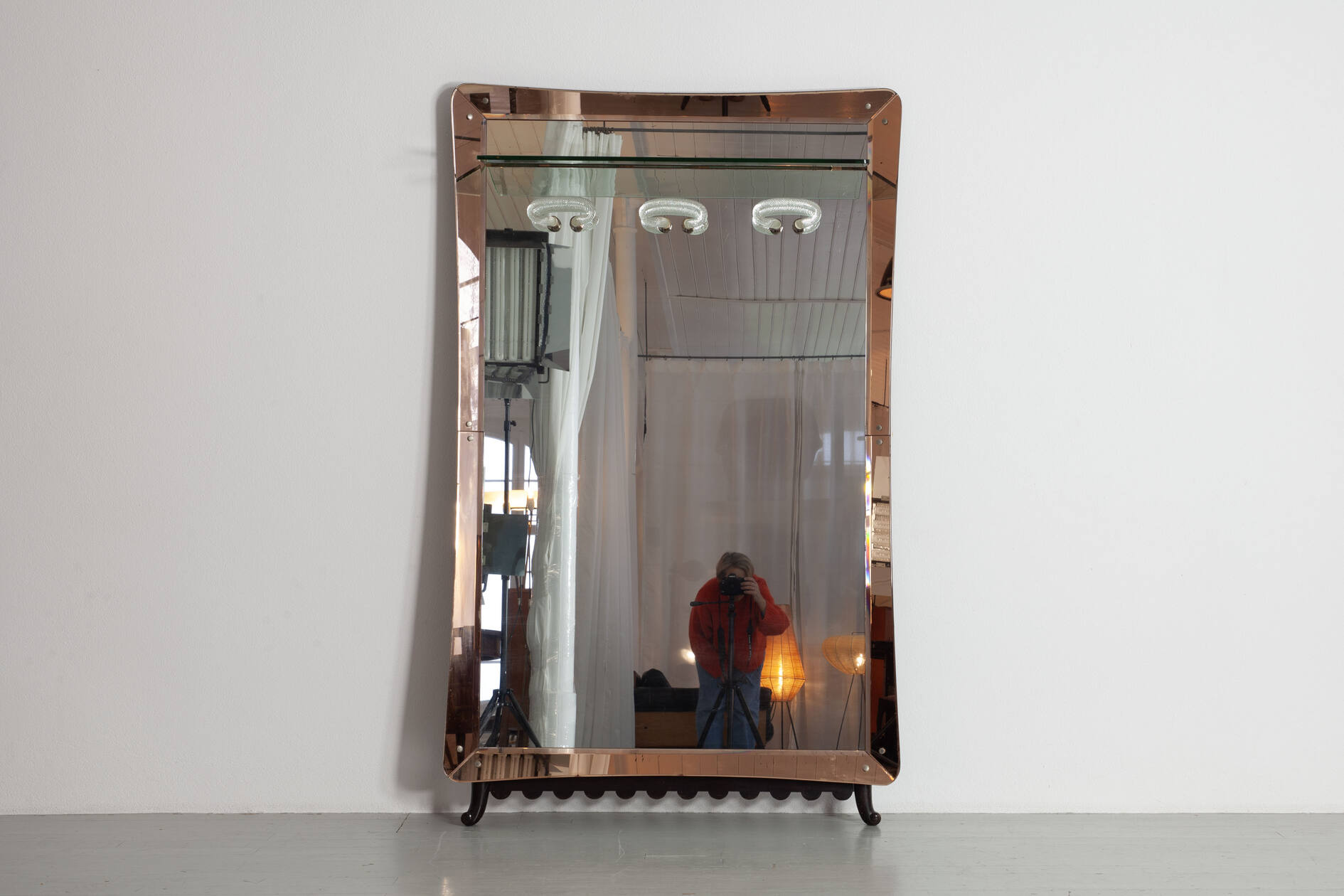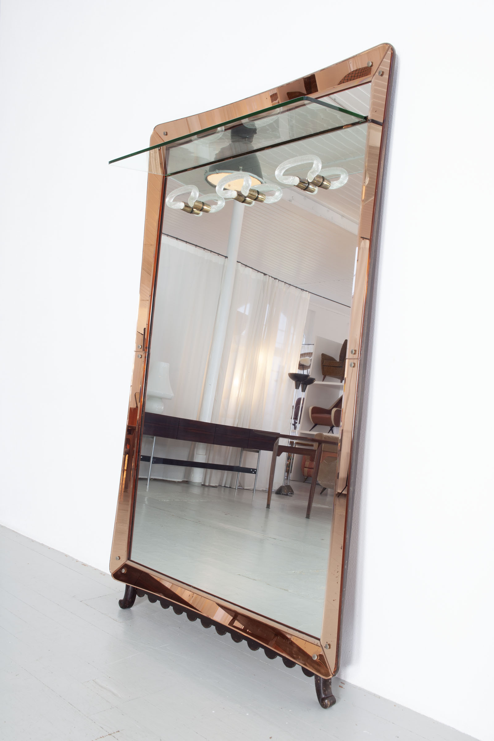 Großformatiger Standspiegel aus den 1940er Jahren. Rechteckige Form mit facettiertem Spiegelglas, gerahmt von versilbertem, teils farbig getöntem Kristallglas. Mit integrierter Glasablage im oberen Bereich und Kleiderhacken aus Kristallglas. Holzstruktur mit geschwungenen Füßen.