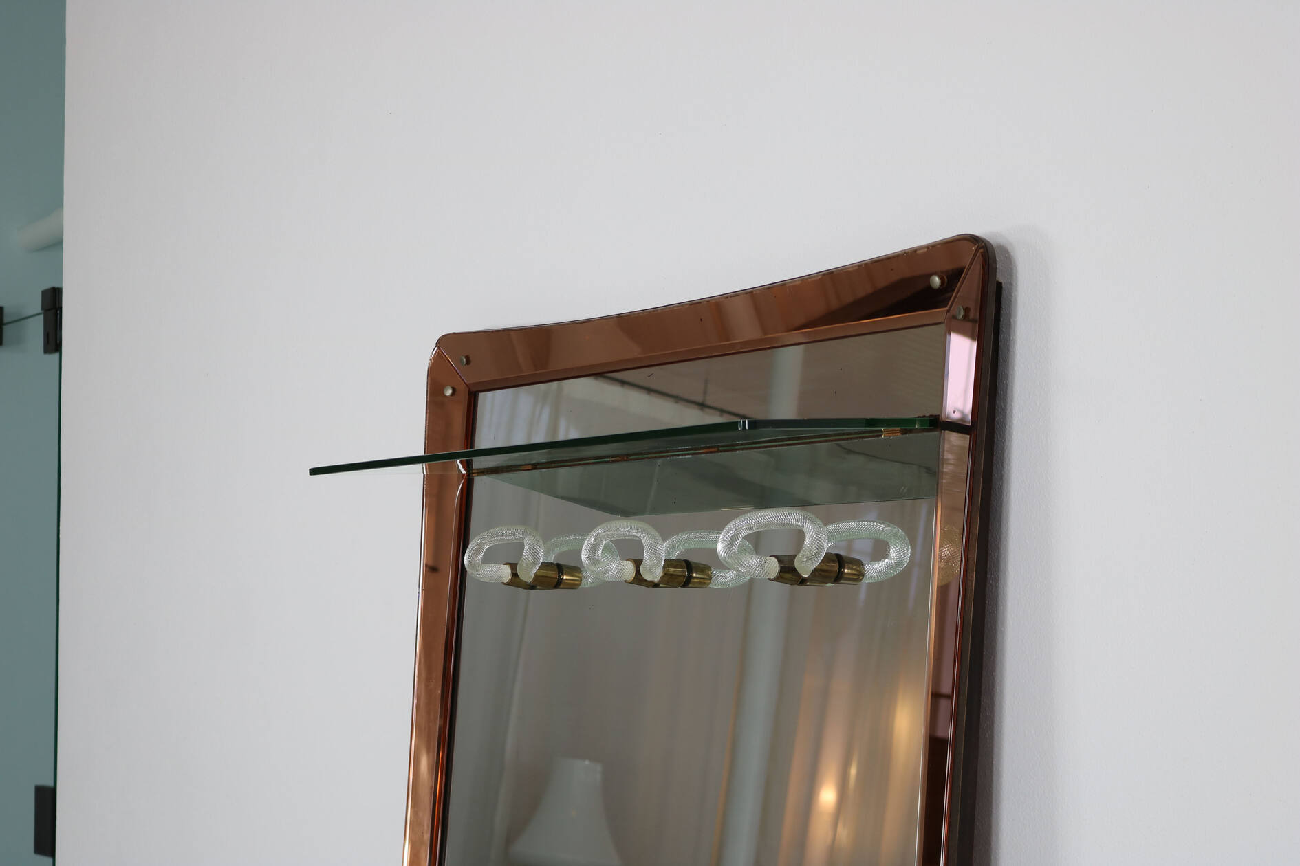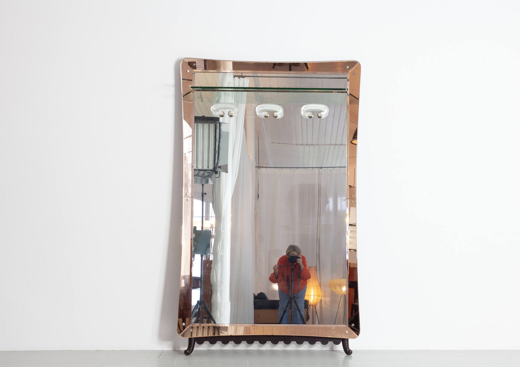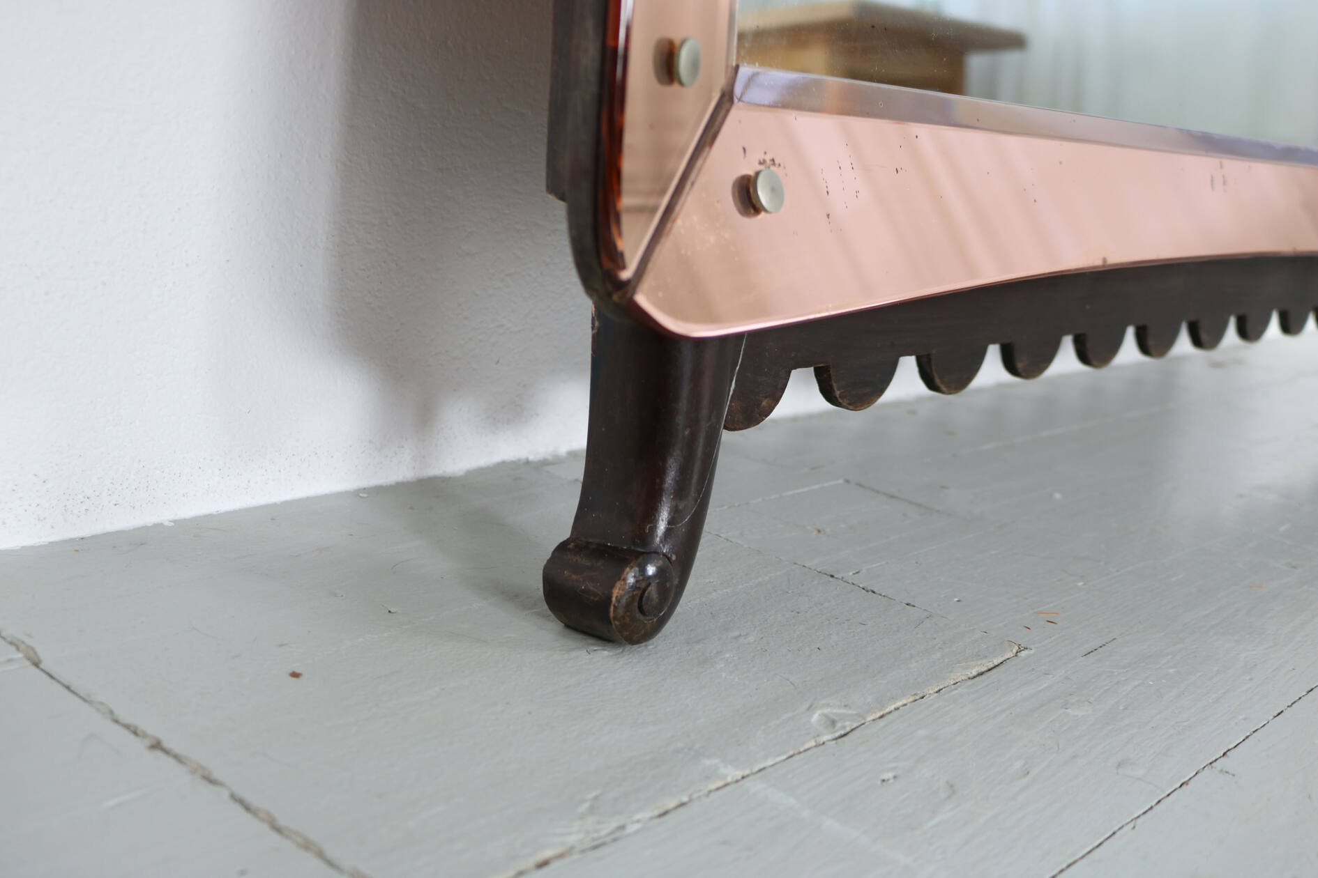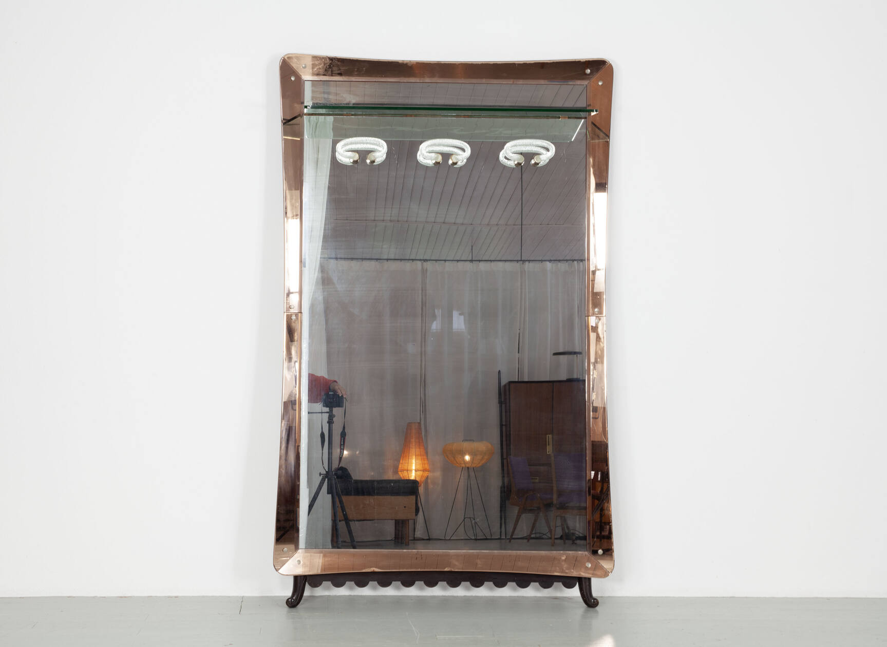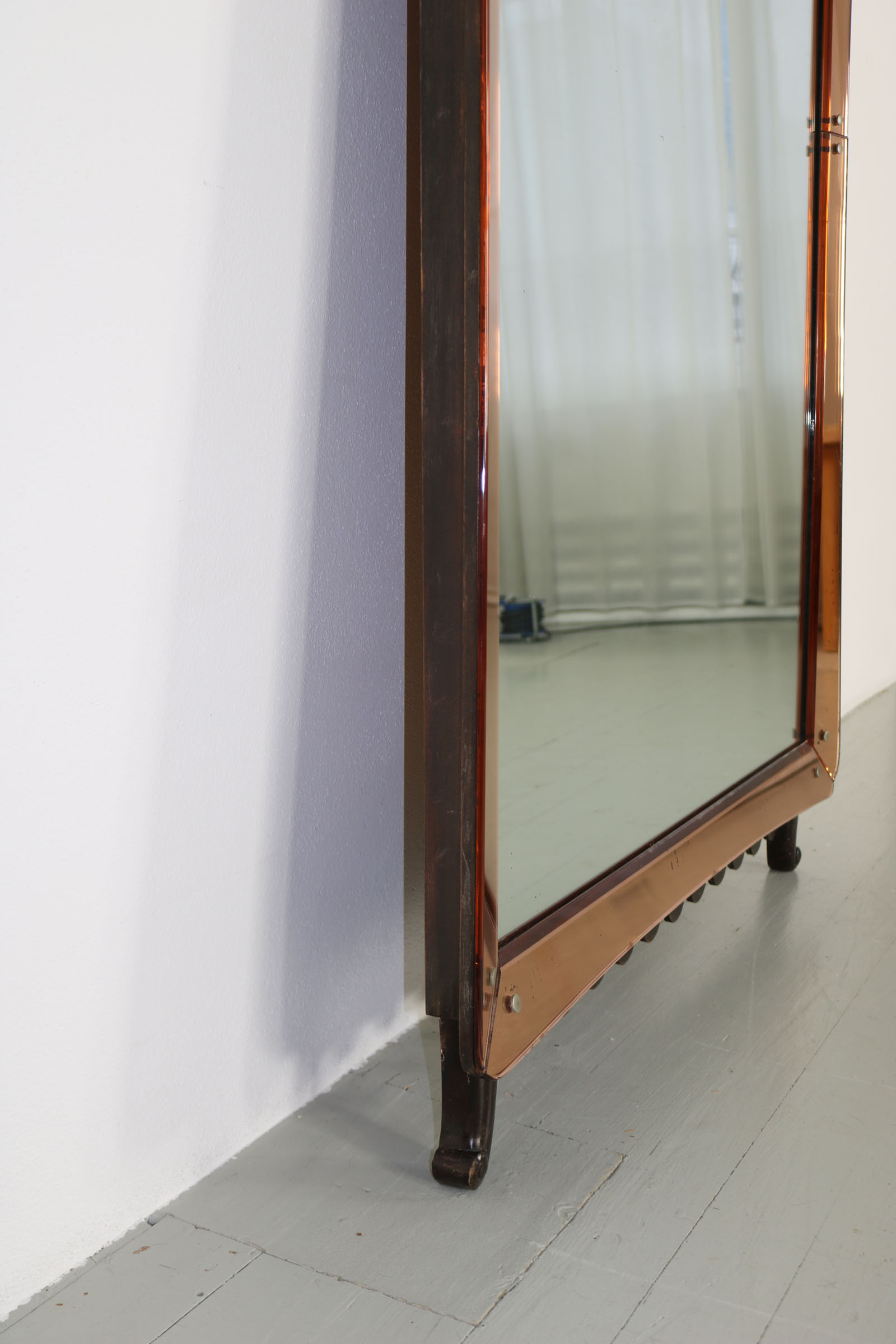 Großformatiger Standspiegel aus den 1940er Jahren. Rechteckige Form mit facettiertem Spiegelglas, gerahmt von versilbertem, teils farbig getöntem Kristallglas. Mit integrierter Glasablage im oberen Bereich und Kleiderhacken aus Kristallglas. Holzstruktur mit geschwungenen Füßen.