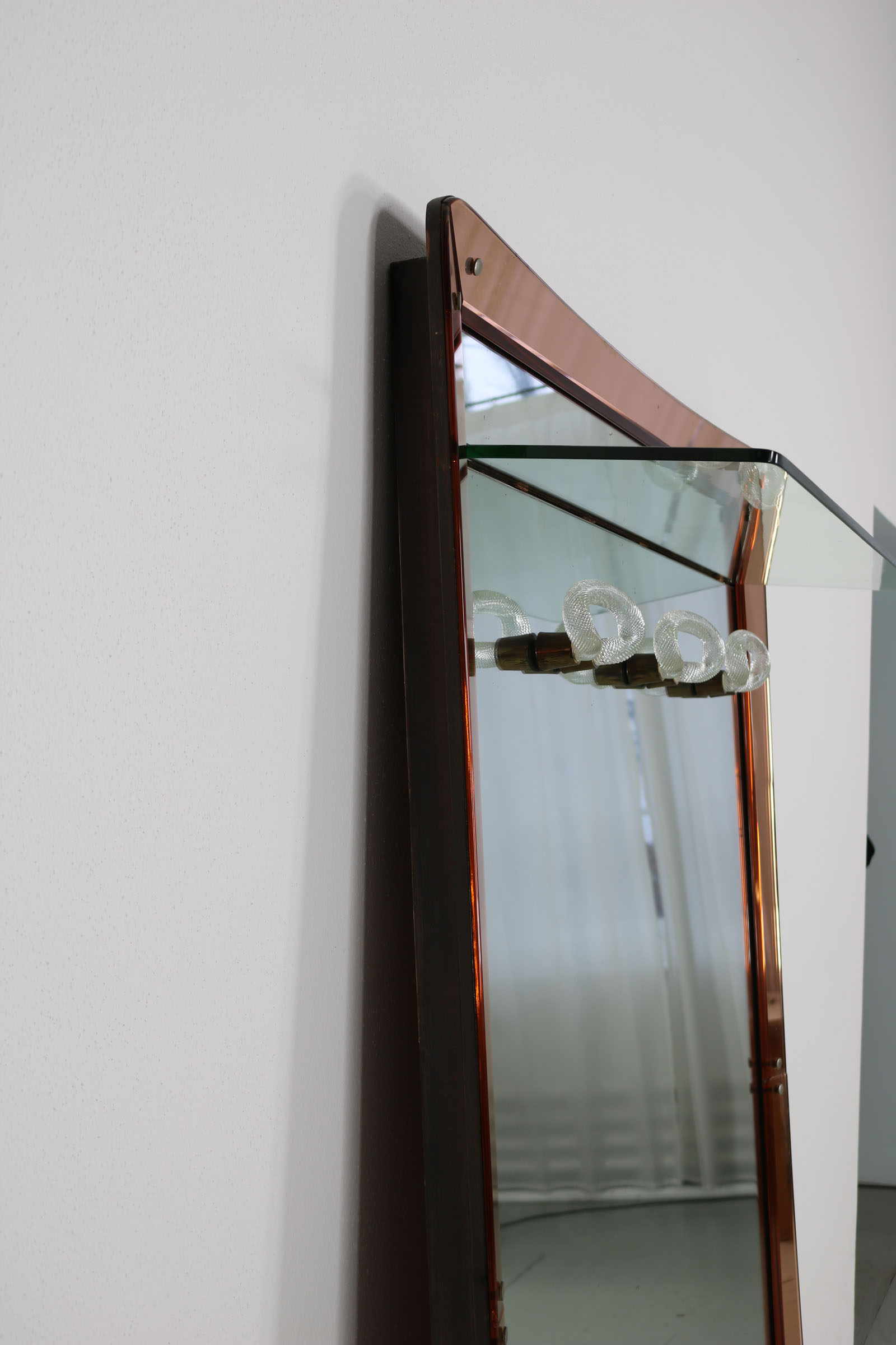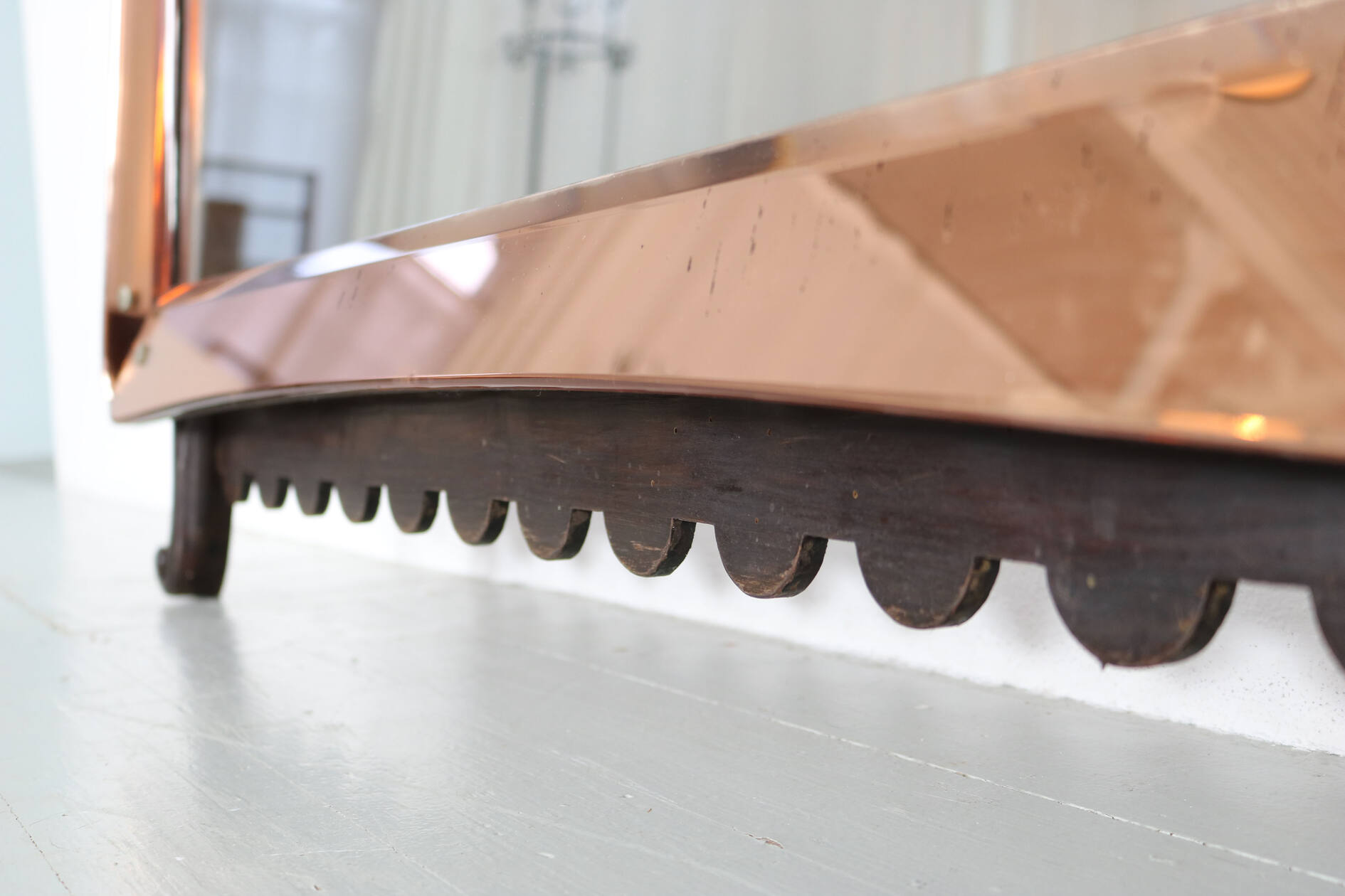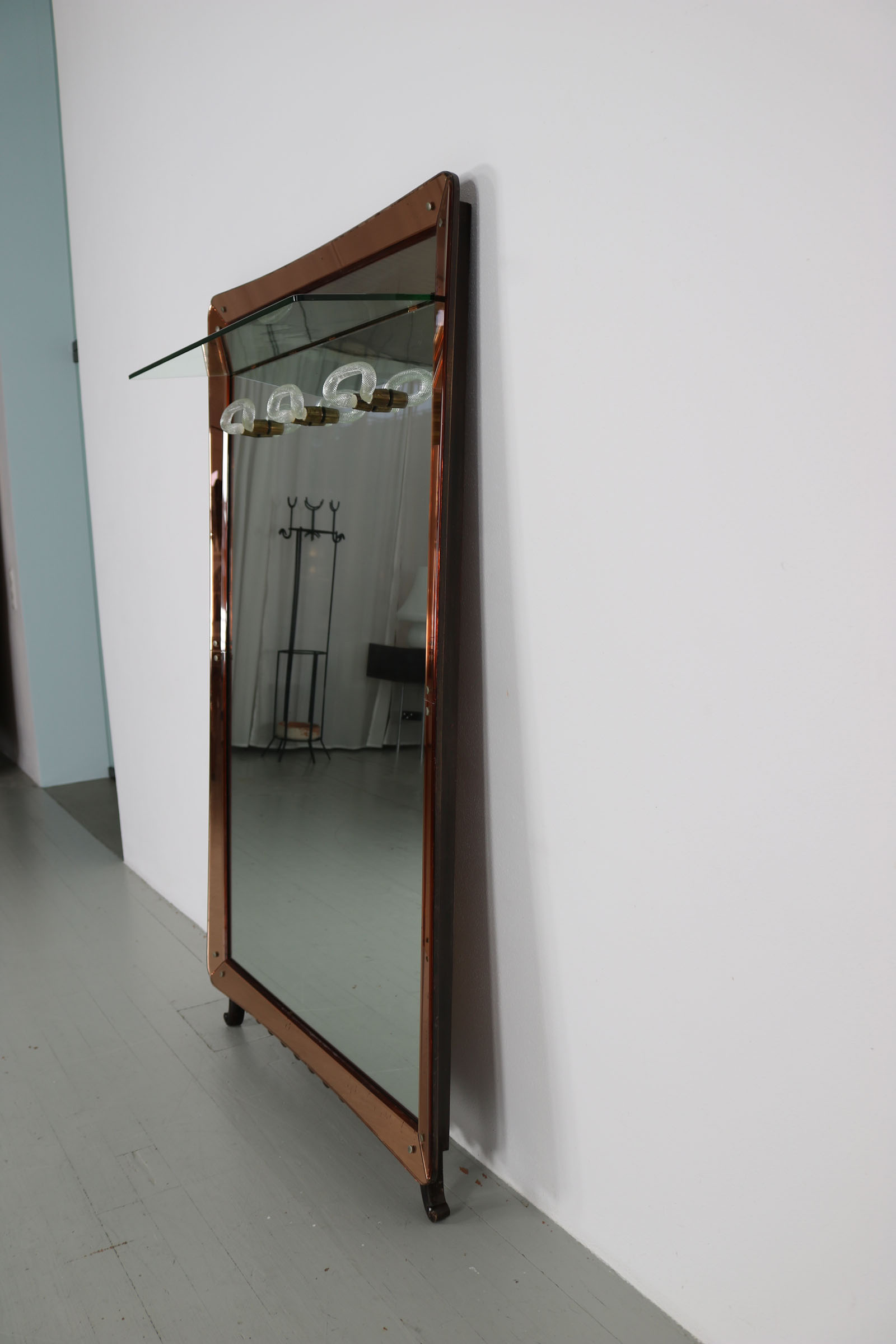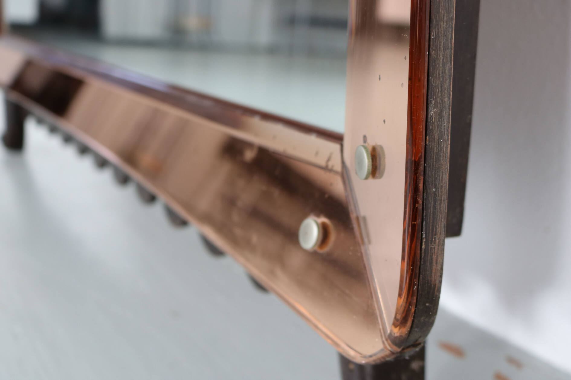 Großformatiger Standspiegel aus den 1940er Jahren. Rechteckige Form mit facettiertem Spiegelglas, gerahmt von versilbertem, teils farbig getöntem Kristallglas. Mit integrierter Glasablage im oberen Bereich und Kleiderhacken aus Kristallglas. Holzstruktur mit geschwungenen Füßen.