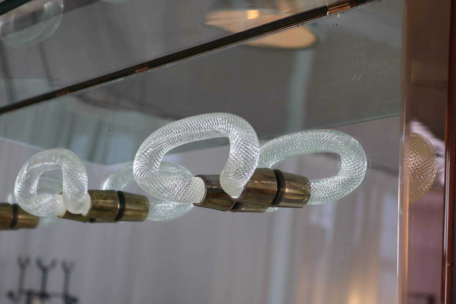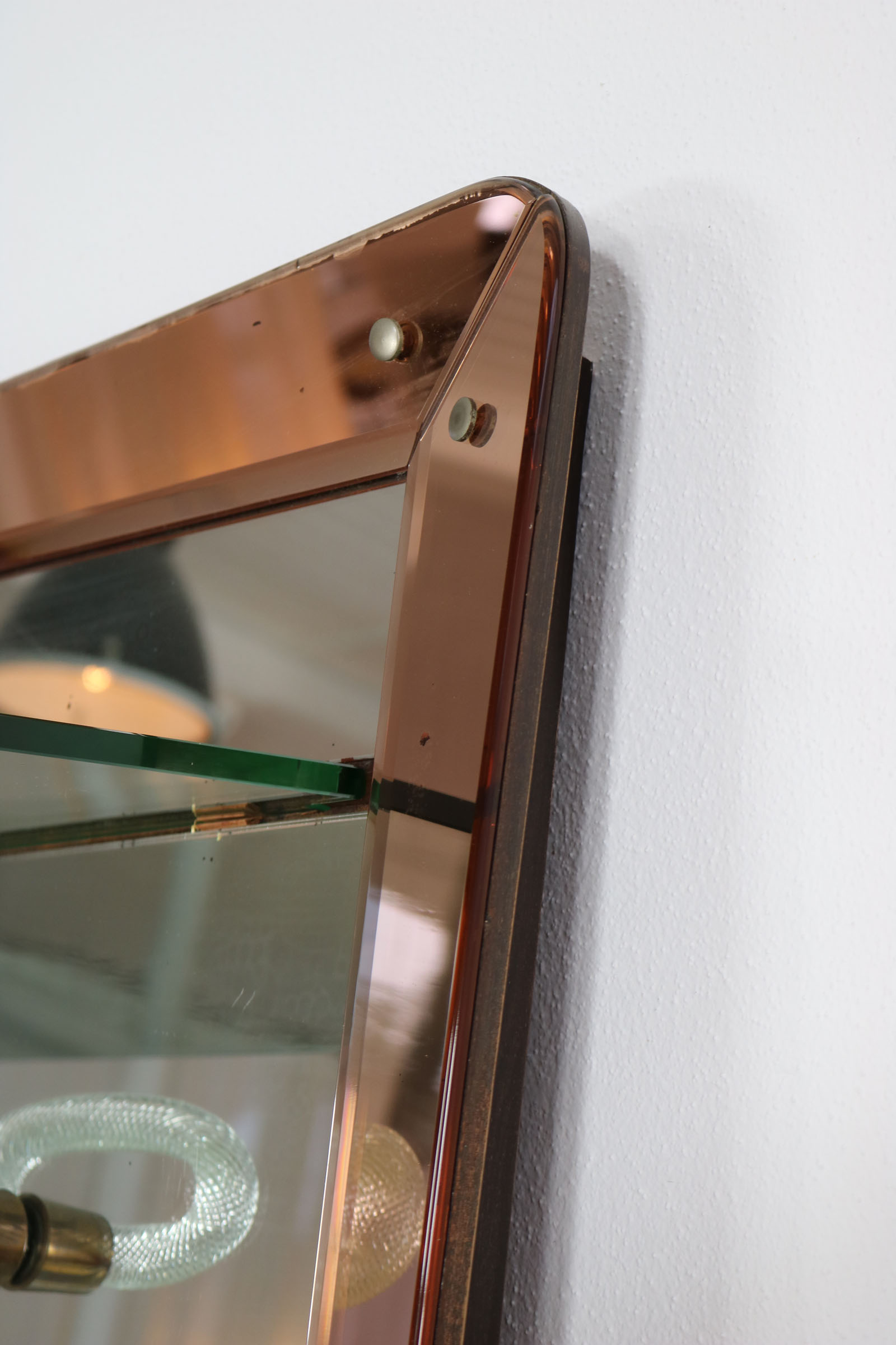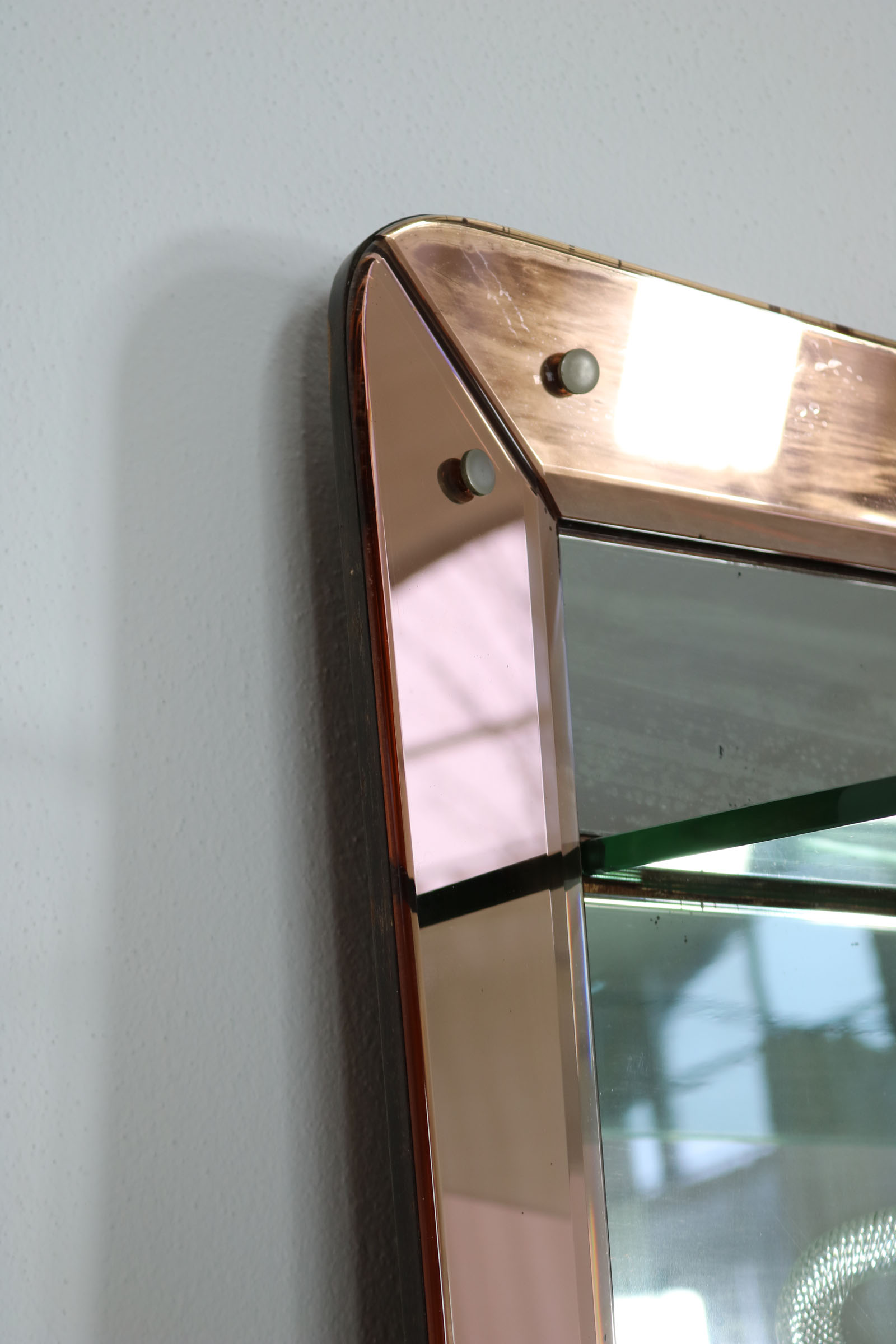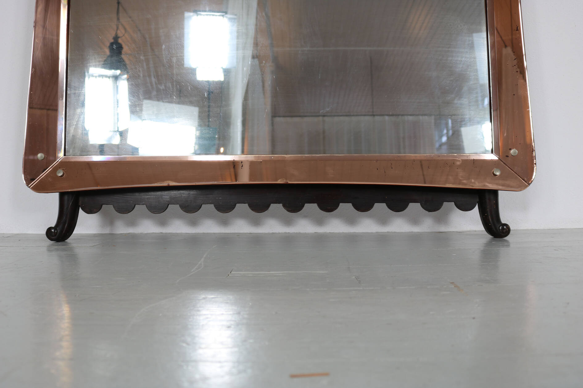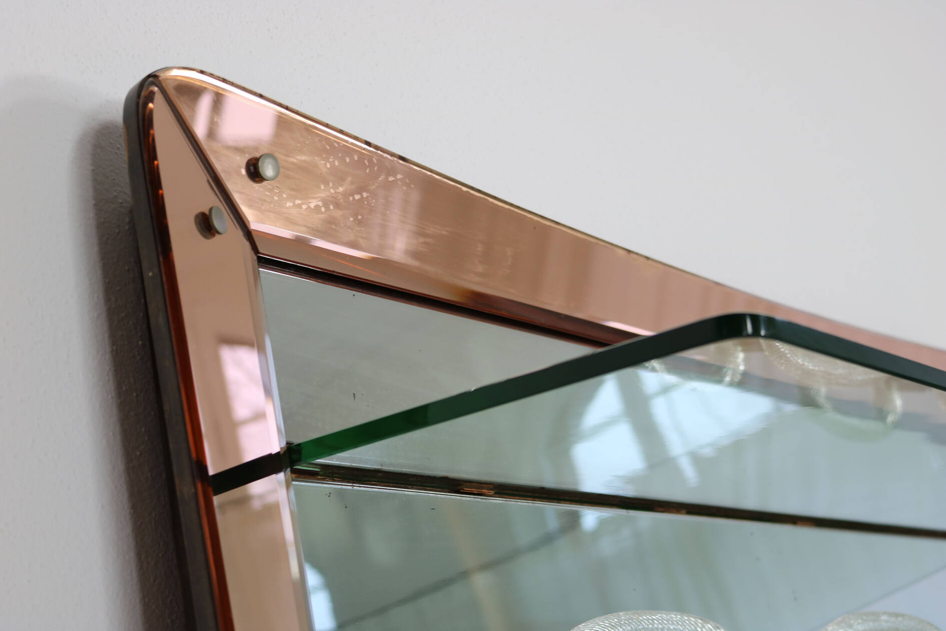 Großformatiger Standspiegel aus den 1940er Jahren. Rechteckige Form mit facettiertem Spiegelglas, gerahmt von versilbertem, teils farbig getöntem Kristallglas. Mit integrierter Glasablage im oberen Bereich und Kleiderhacken aus Kristallglas. Holzstruktur mit geschwungenen Füßen.