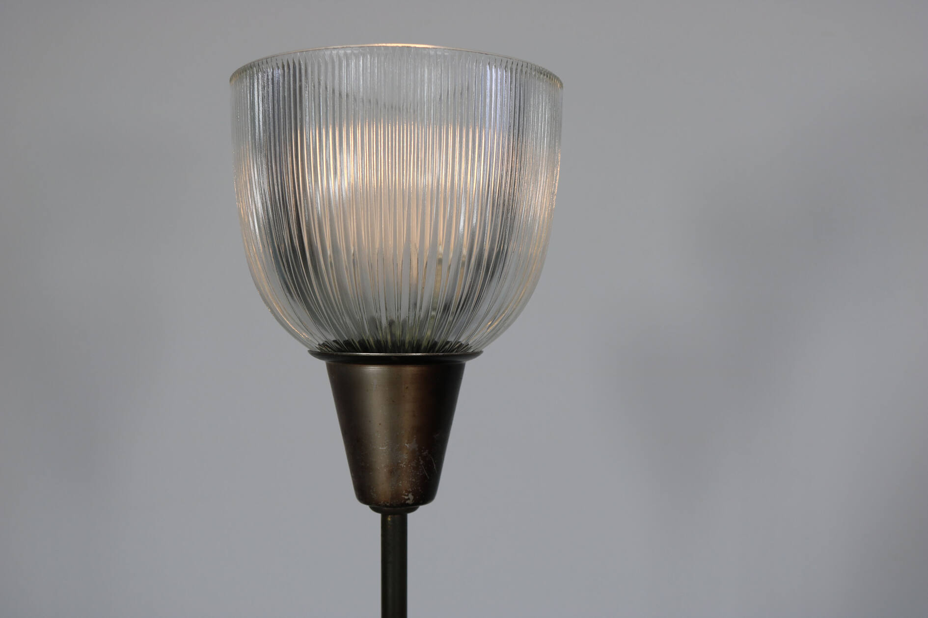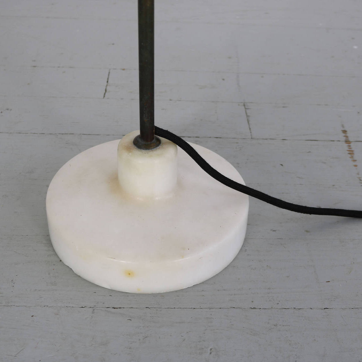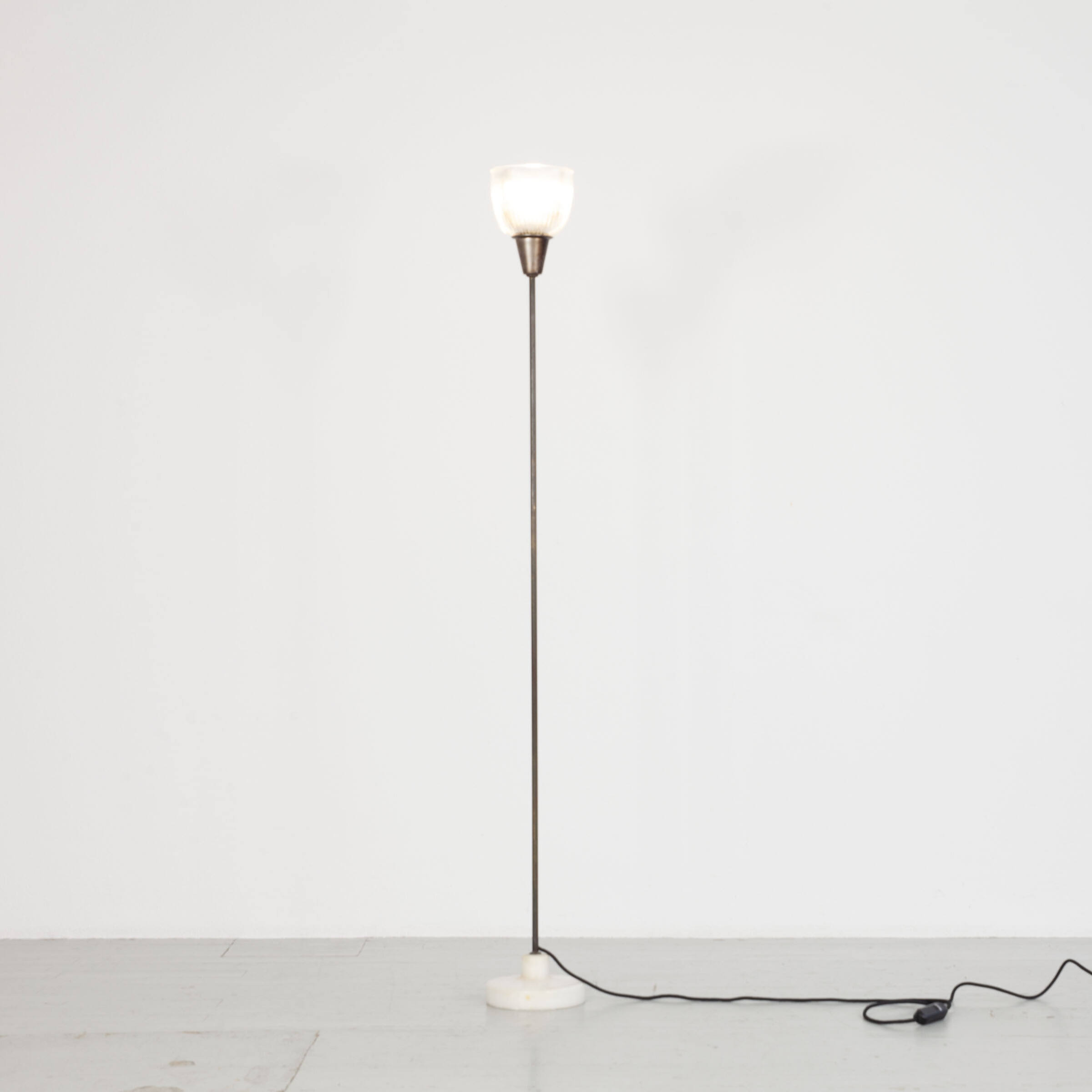 Diese italienische Stehleuchte aus 1954 wurde designed von Ignazio Gardella und hergestellt von Azucena. Es handelt sich um das Modell LTE 6. Die Leuchte besteht aus einem Messinggestell auf einem Marmorsockel und einem Lampenschirm aus geripptem Glas. Sie hat eine E27 Fassung und befindet sich, bis auf altersbedingte Patina in gutem Zustand.