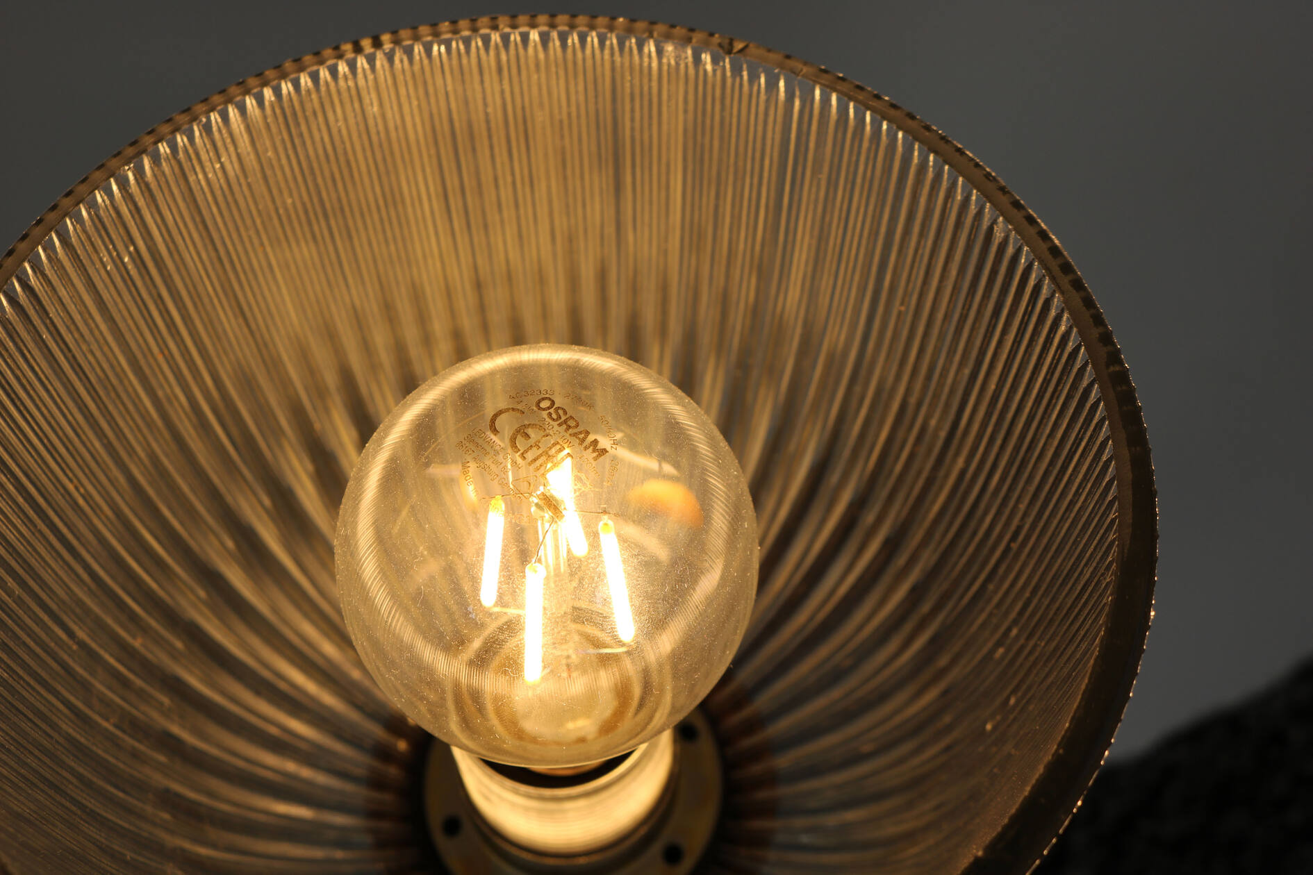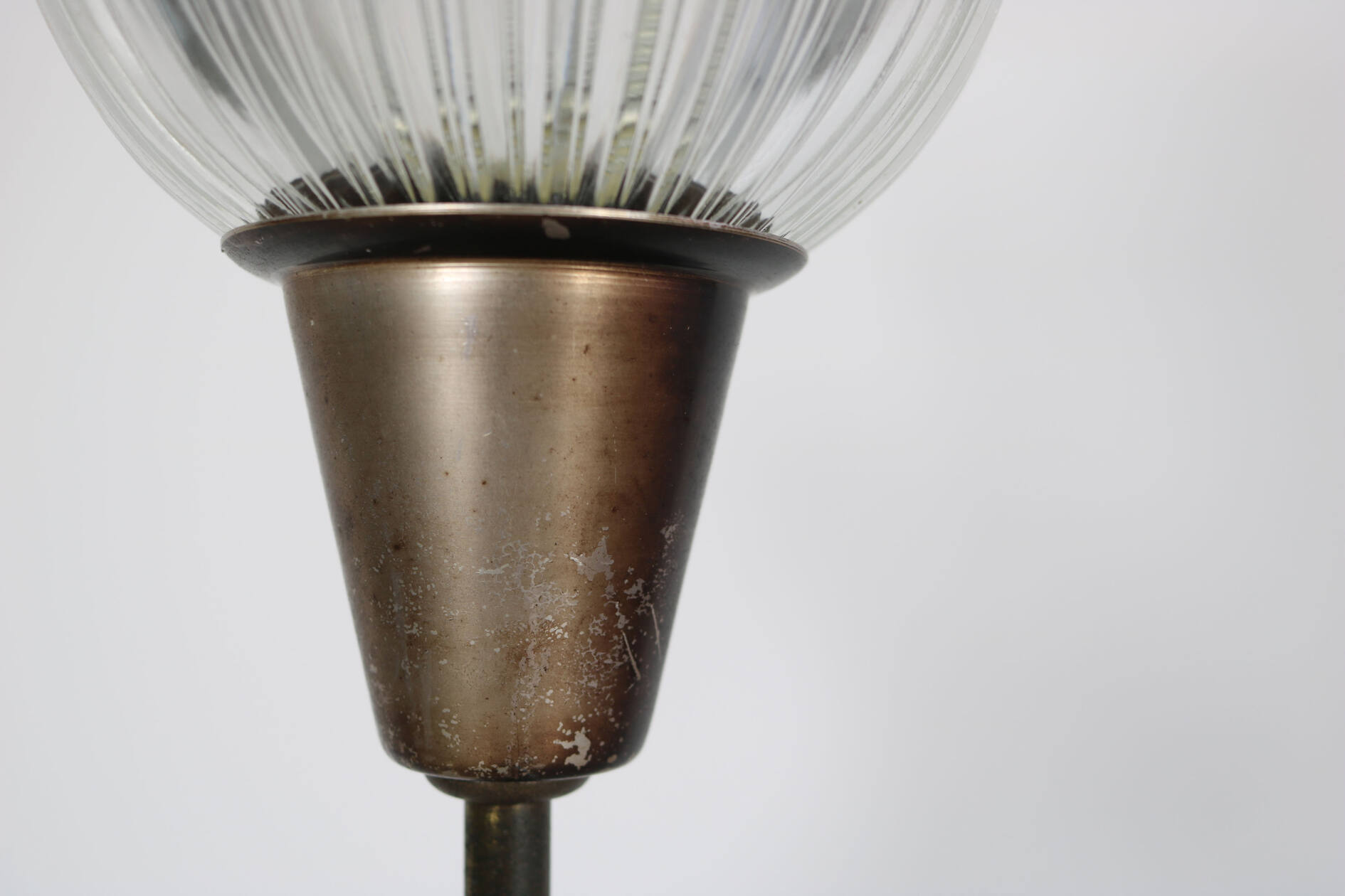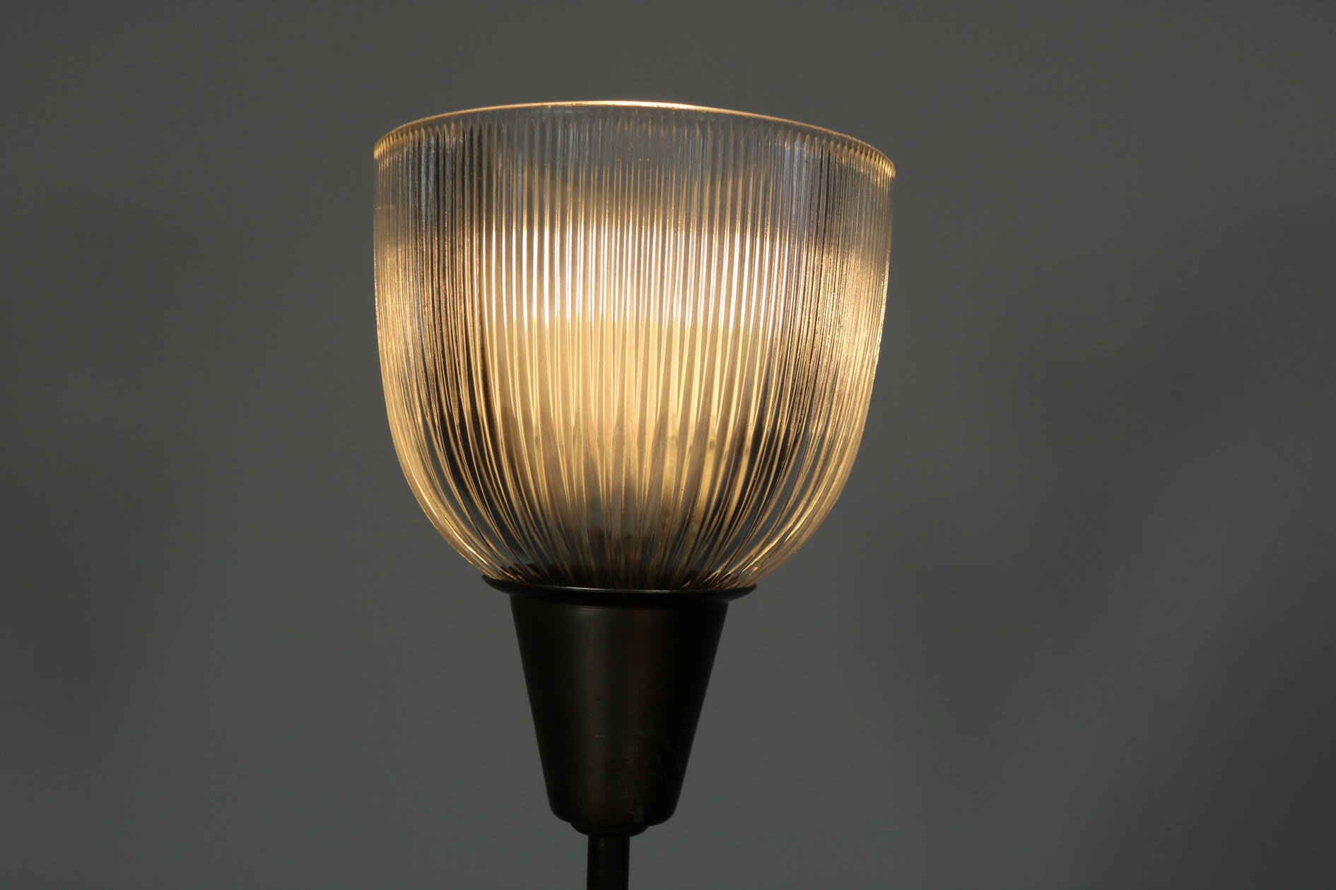 Diese italienische Stehleuchte aus 1954 wurde designed von Ignazio Gardella und hergestellt von Azucena. Es handelt sich um das Modell LTE 6. Die Leuchte besteht aus einem Messinggestell auf einem Marmorsockel und einem Lampenschirm aus geripptem Glas. Sie hat eine E27 Fassung und befindet sich, bis auf altersbedingte Patina in gutem Zustand.