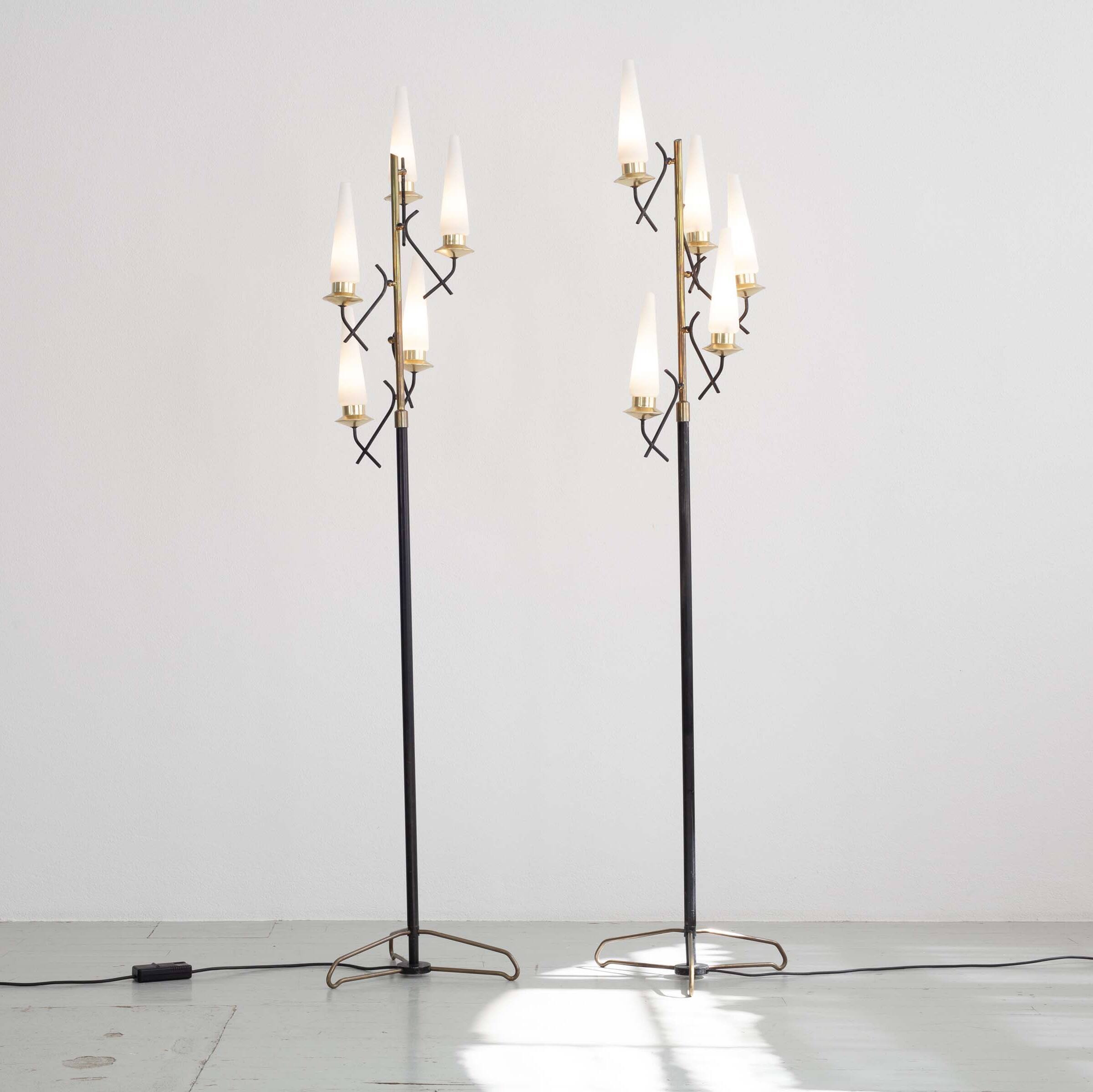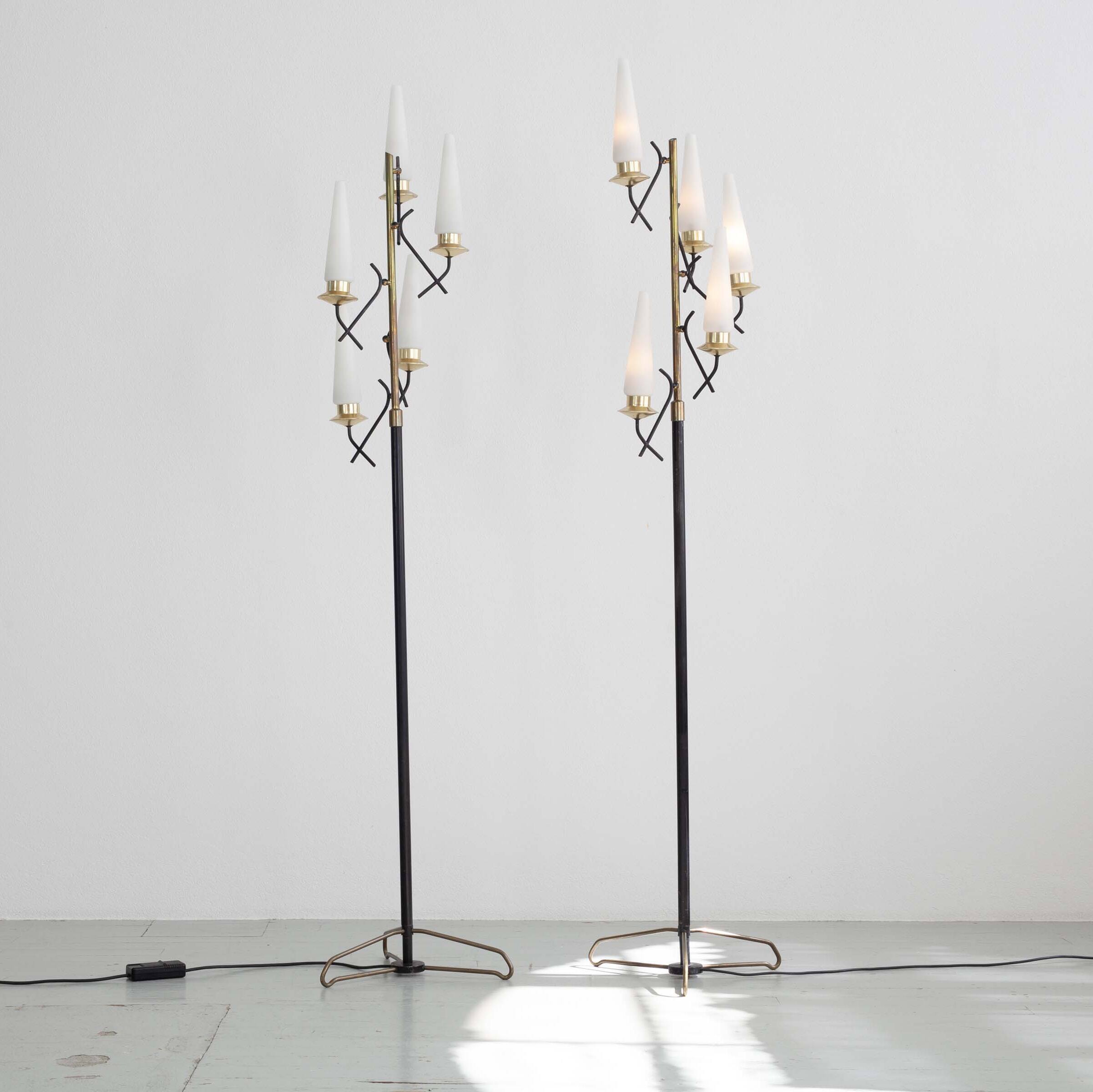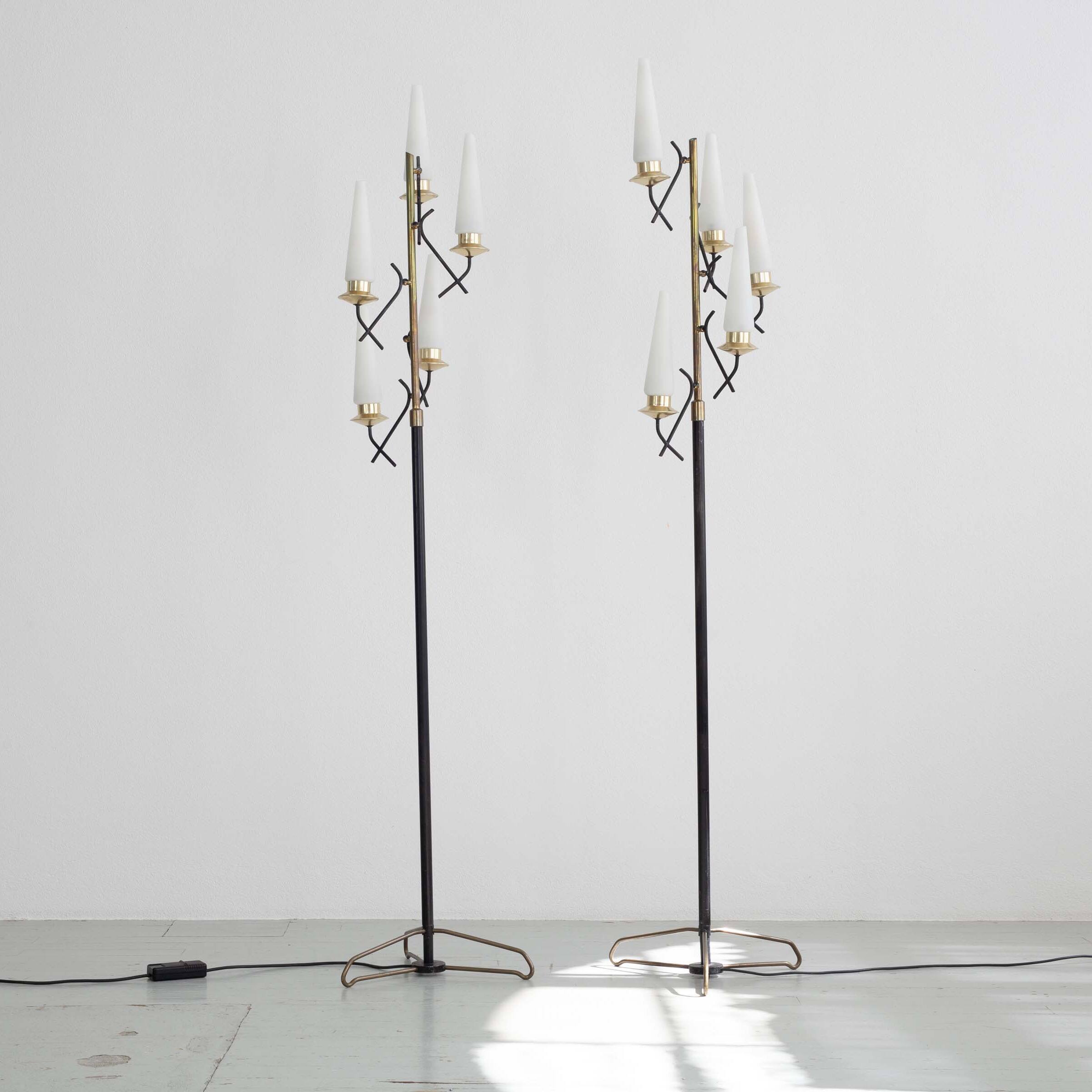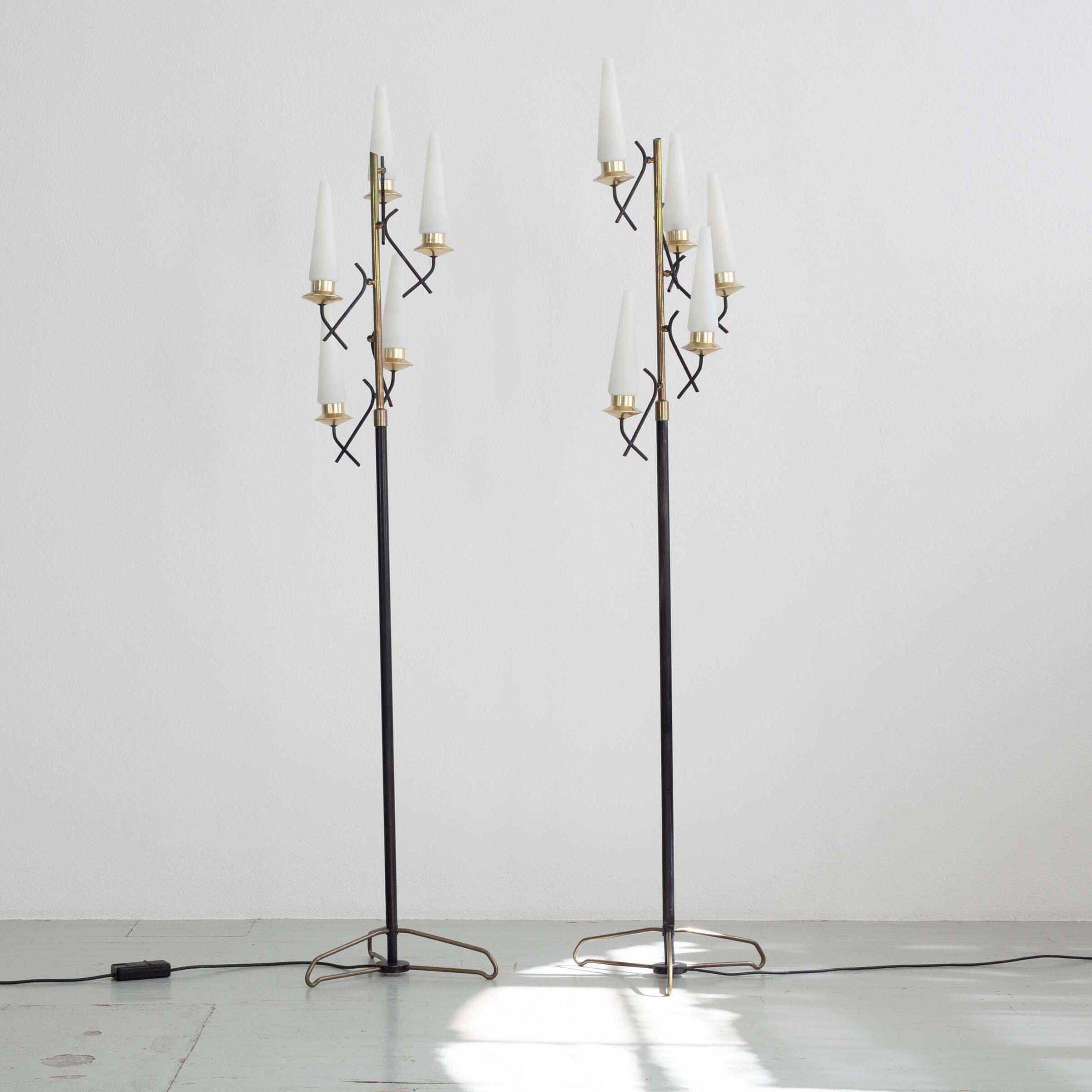 Elegantes Paar italienischer Stehleuchten aus den 1950er Jahren. Jede Leuchte verfügt über fünf schwenkbare Arme aus poliertem Messing mit opalweißen Glasschirmen.