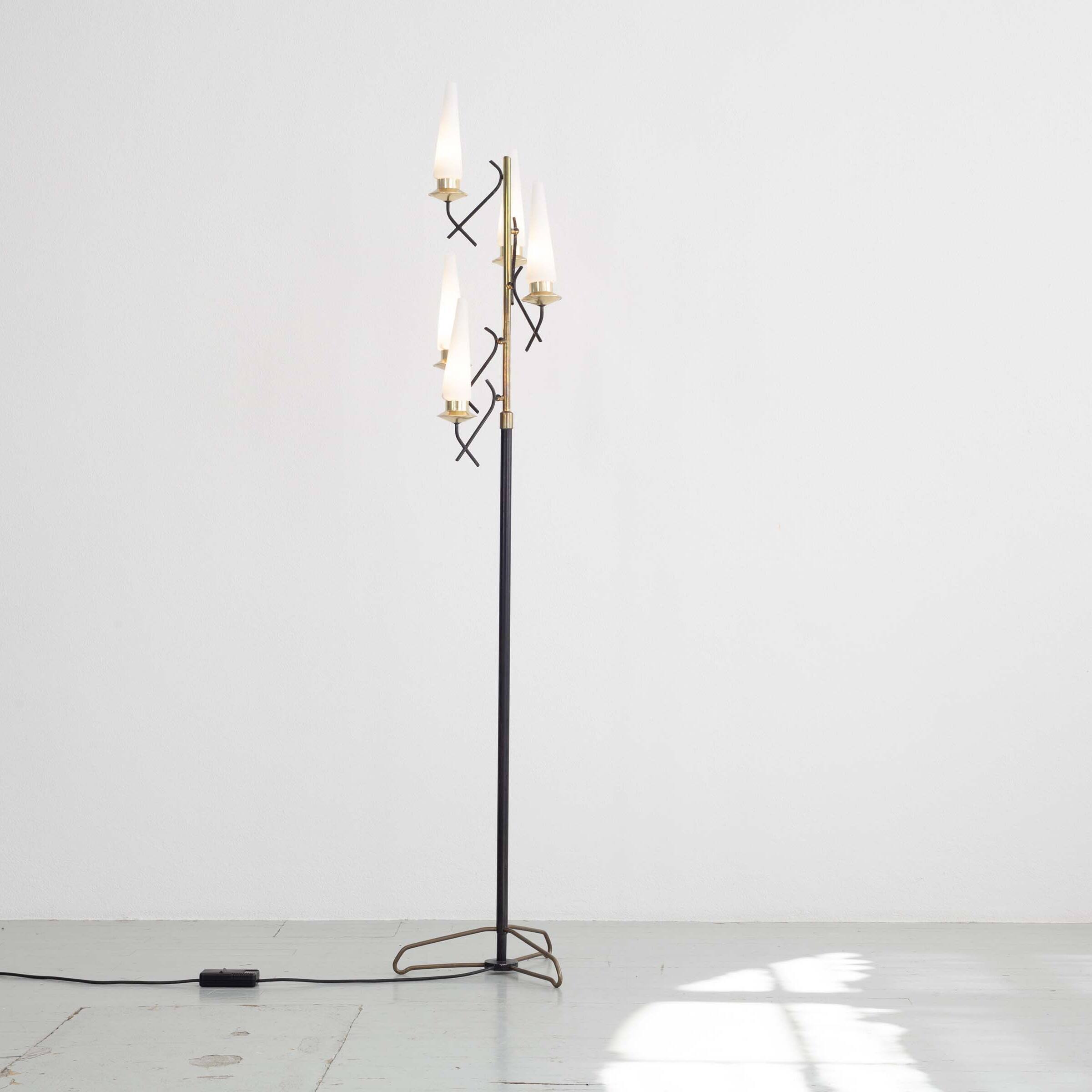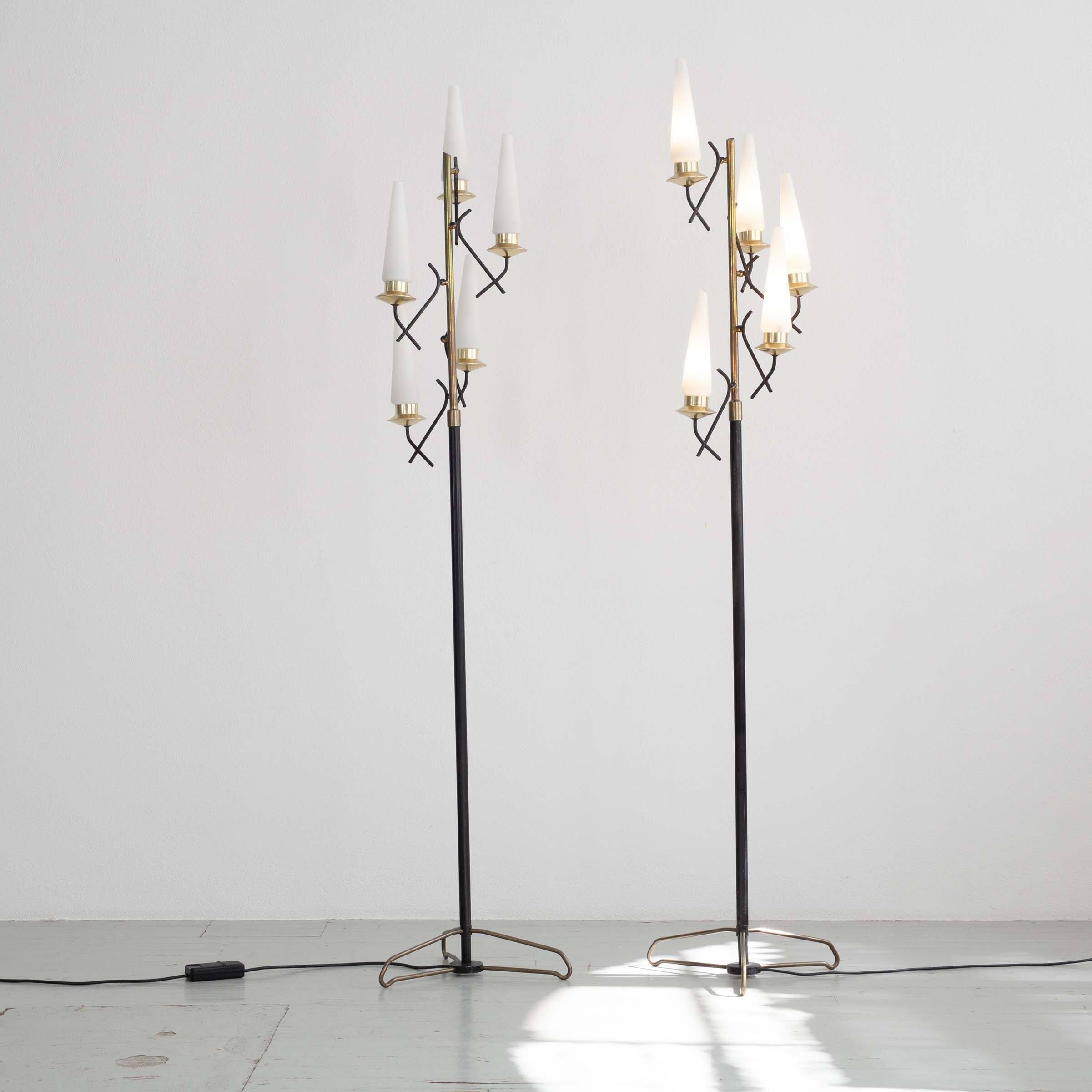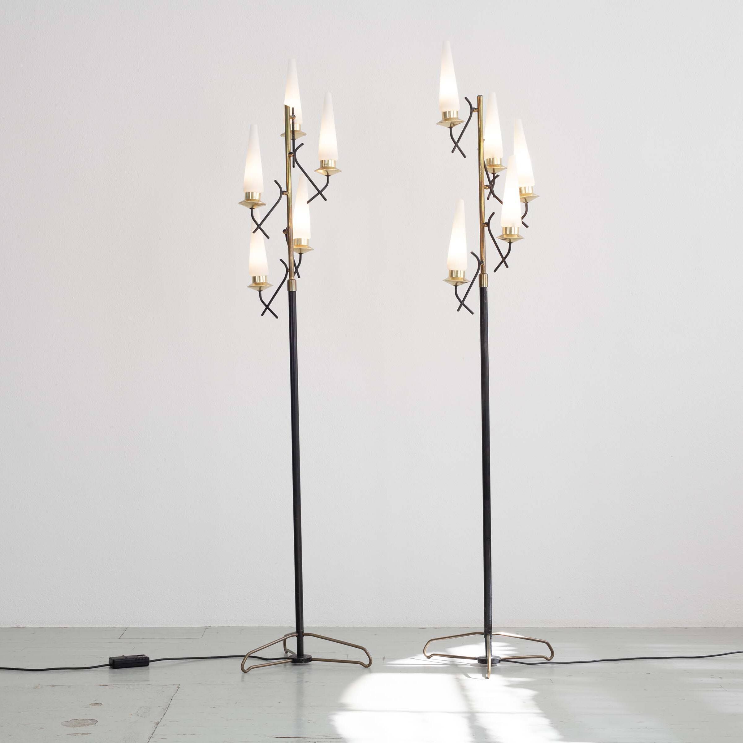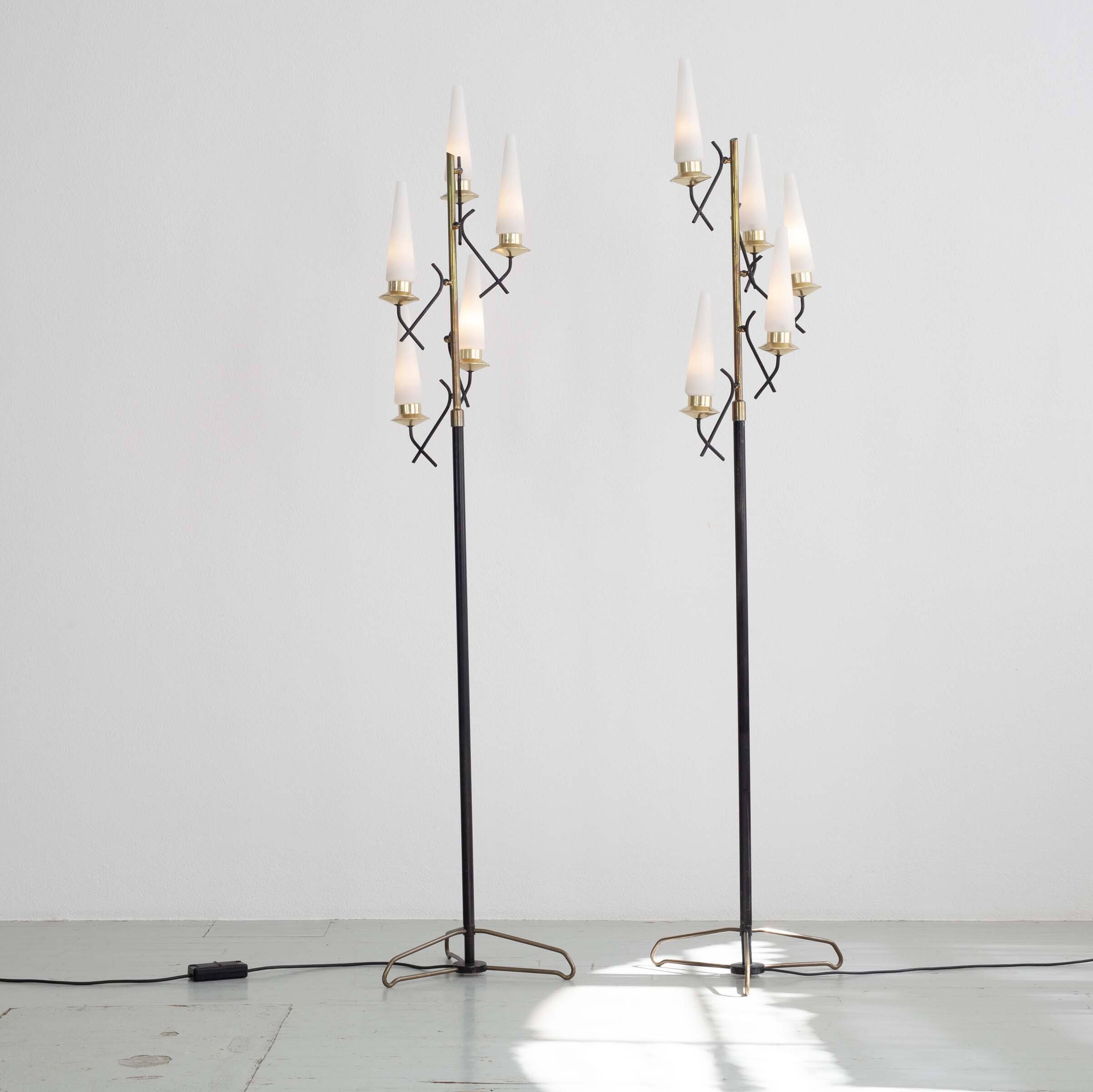 Elegantes Paar italienischer Stehleuchten aus den 1950er Jahren. Jede Leuchte verfügt über fünf schwenkbare Arme aus poliertem Messing mit opalweißen Glasschirmen.