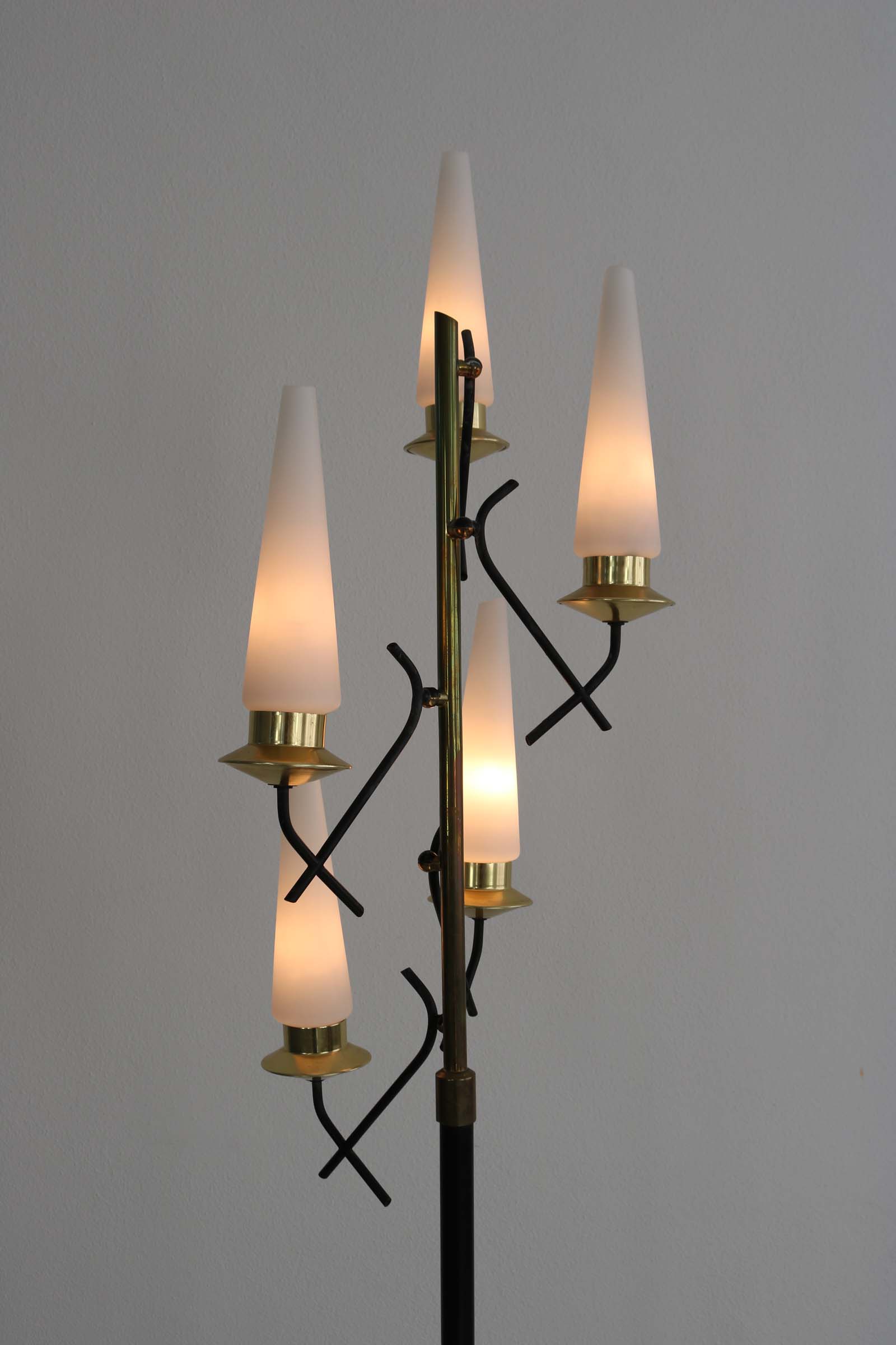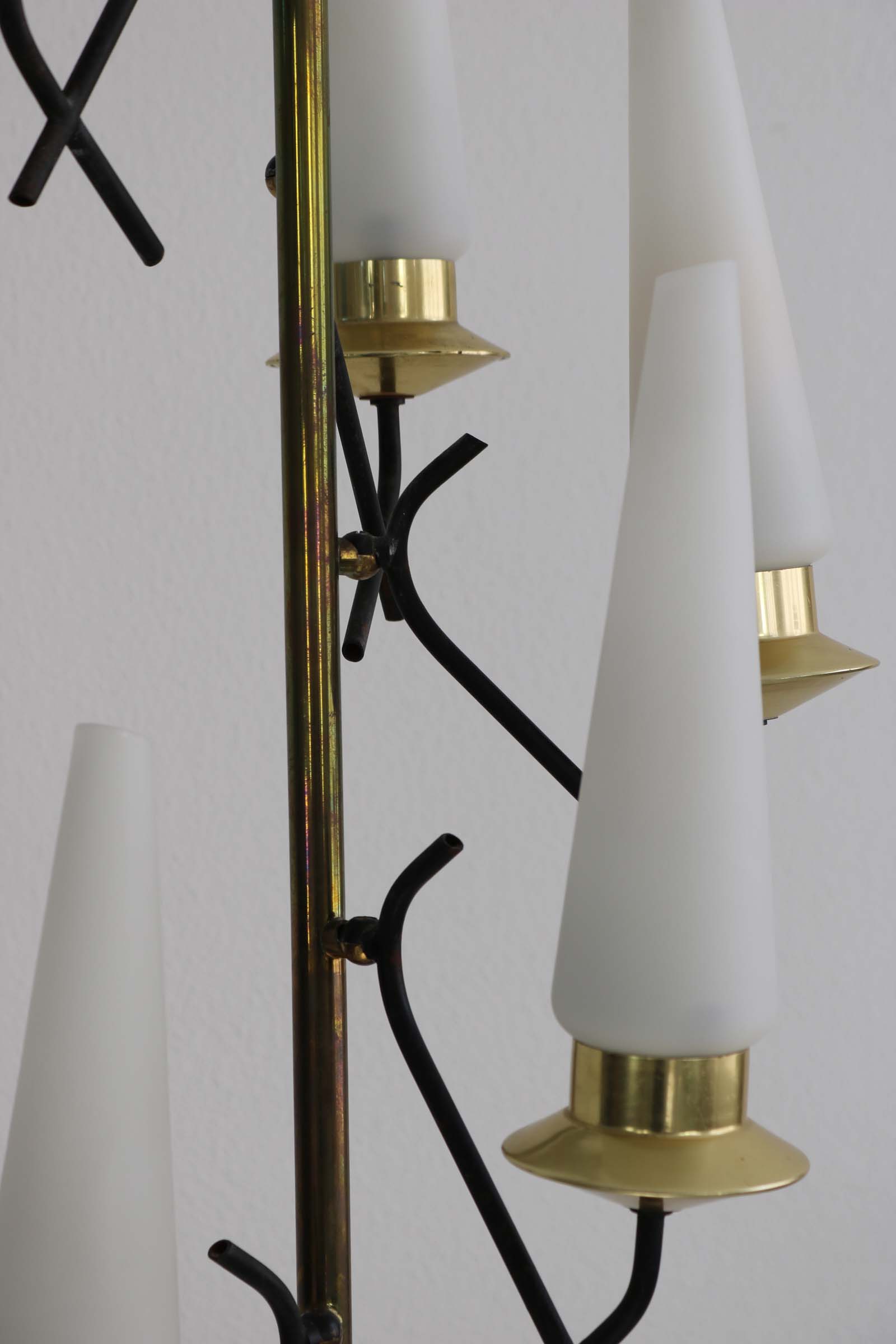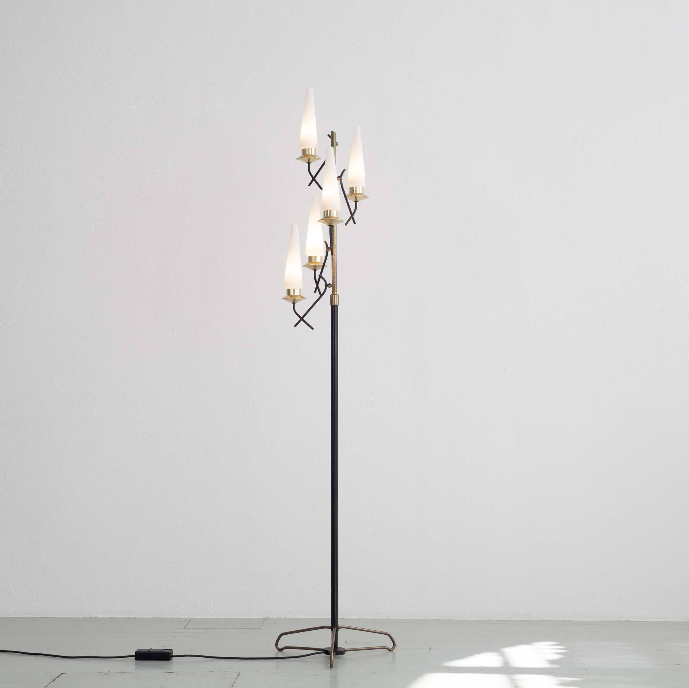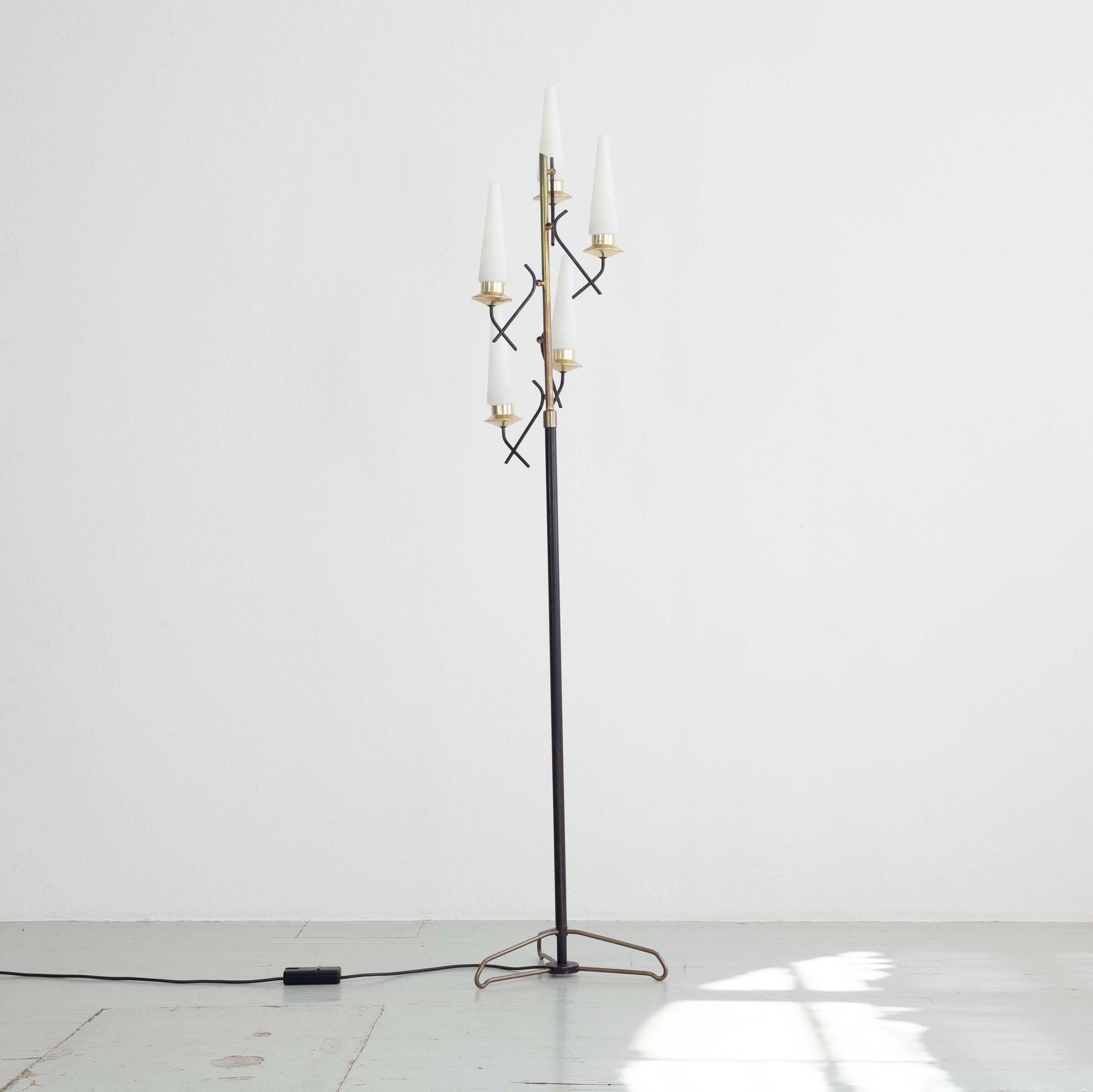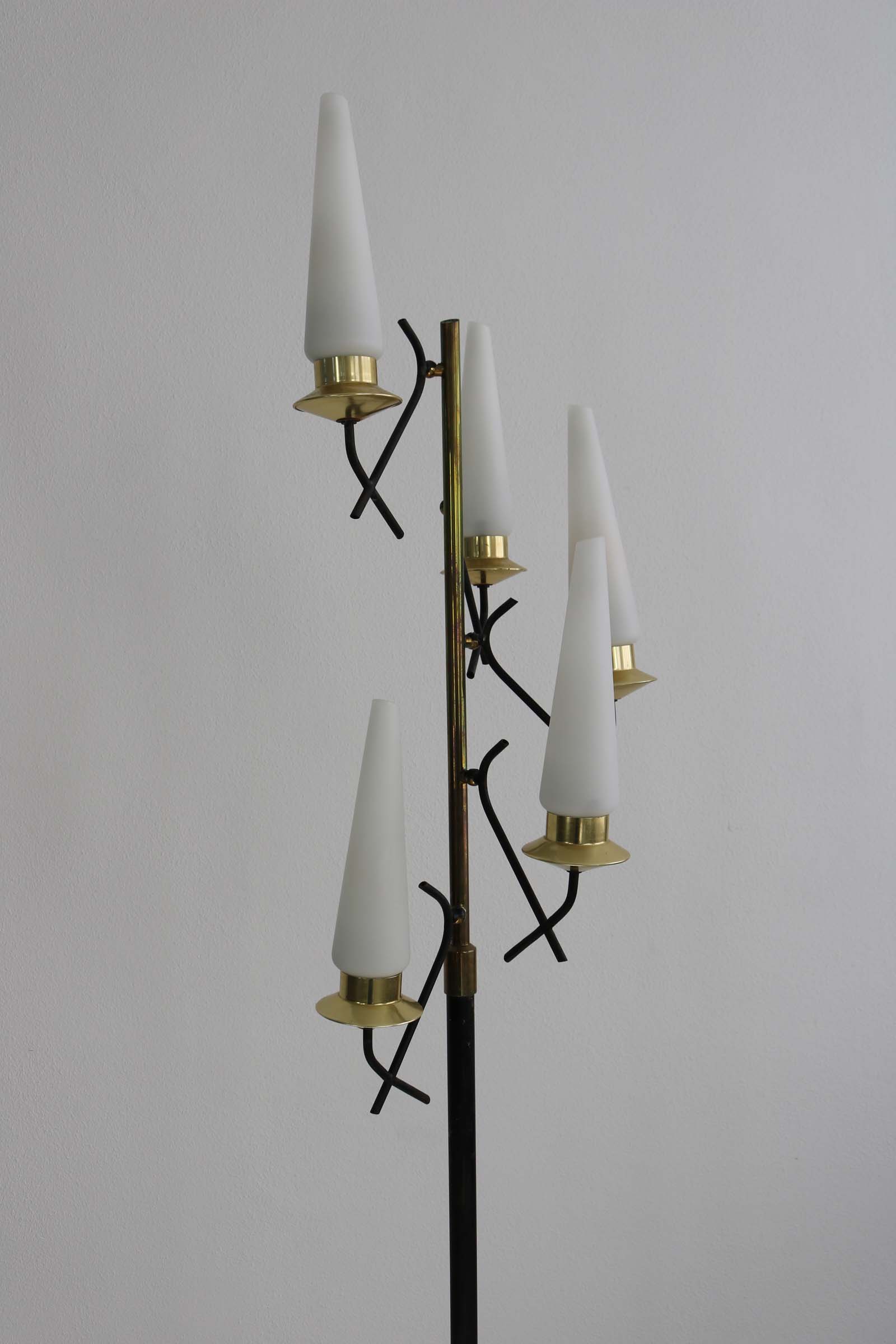 Elegantes Paar italienischer Stehleuchten aus den 1950er Jahren. Jede Leuchte verfügt über fünf schwenkbare Arme aus poliertem Messing mit opalweißen Glasschirmen.
