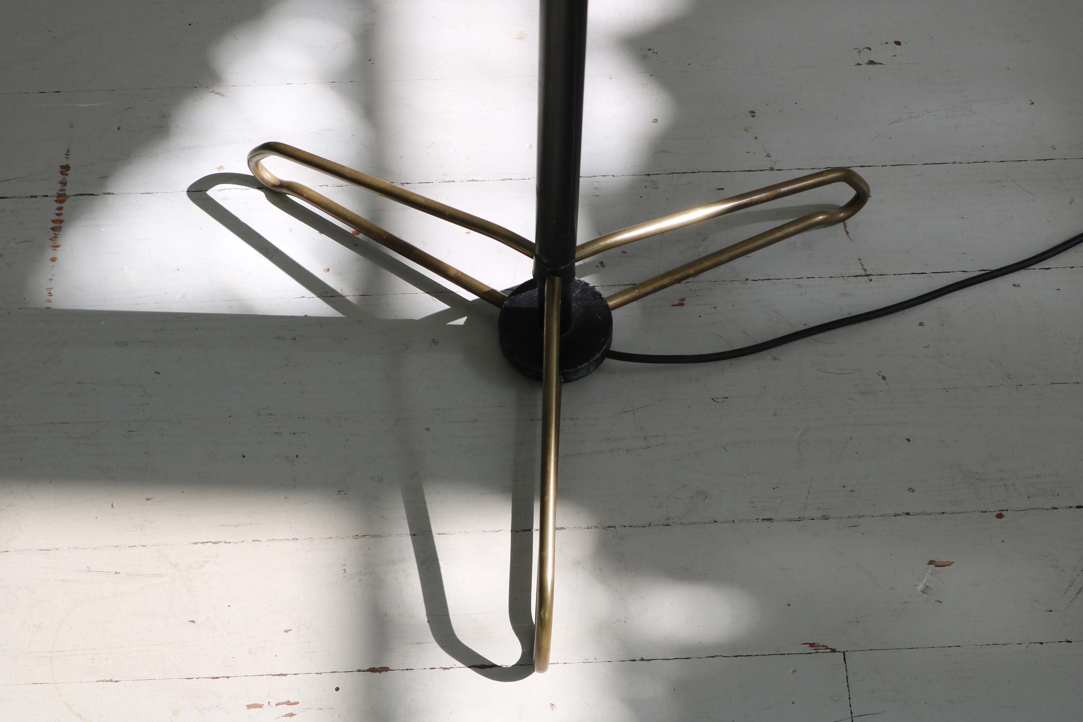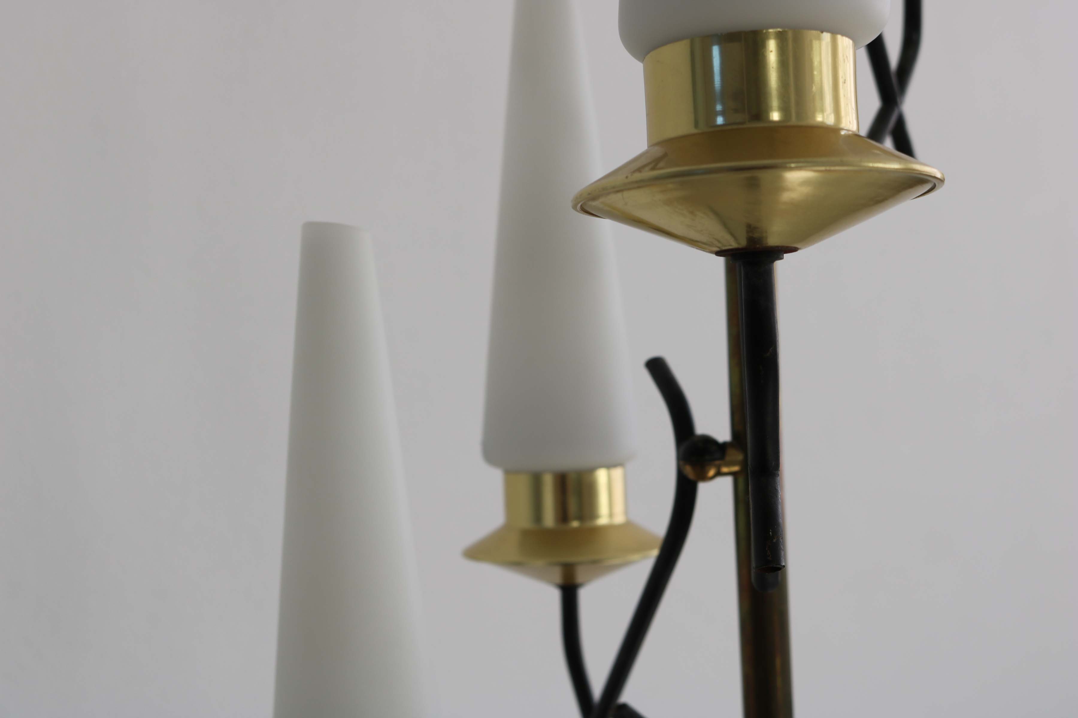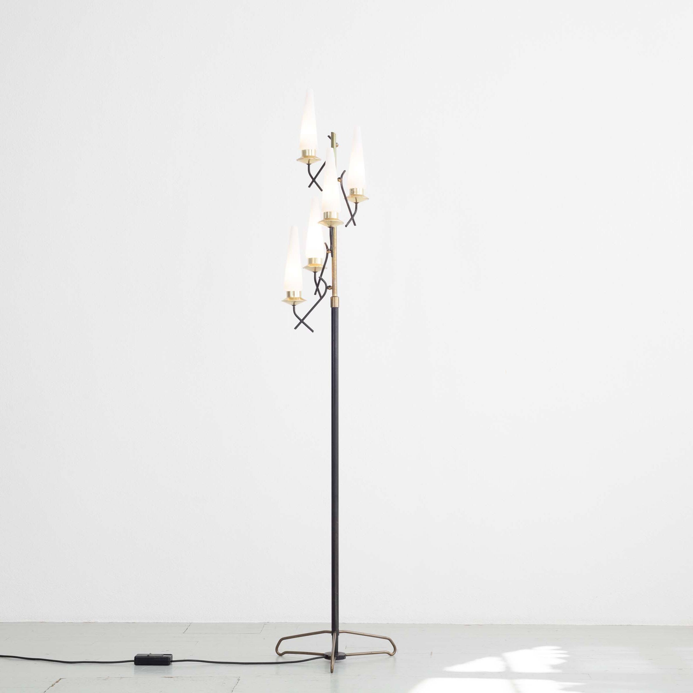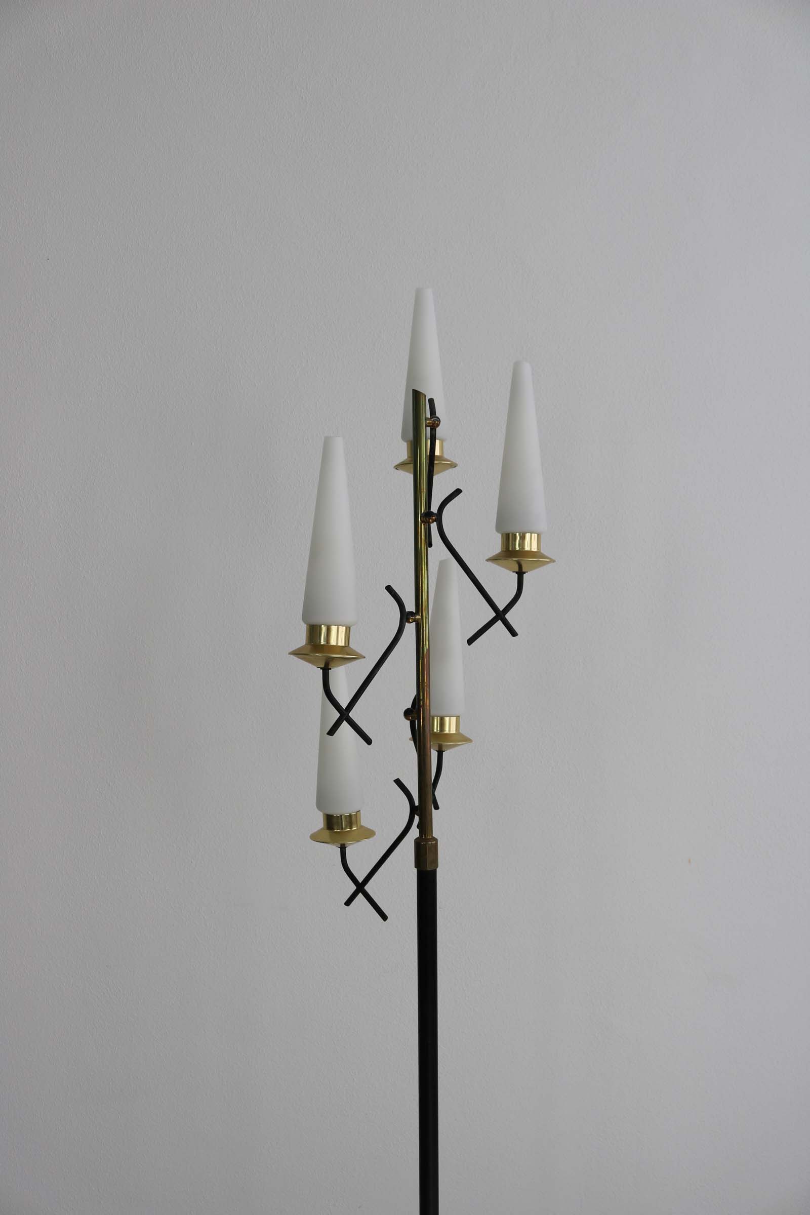 Elegantes Paar italienischer Stehleuchten aus den 1950er Jahren. Jede Leuchte verfügt über fünf schwenkbare Arme aus poliertem Messing mit opalweißen Glasschirmen.