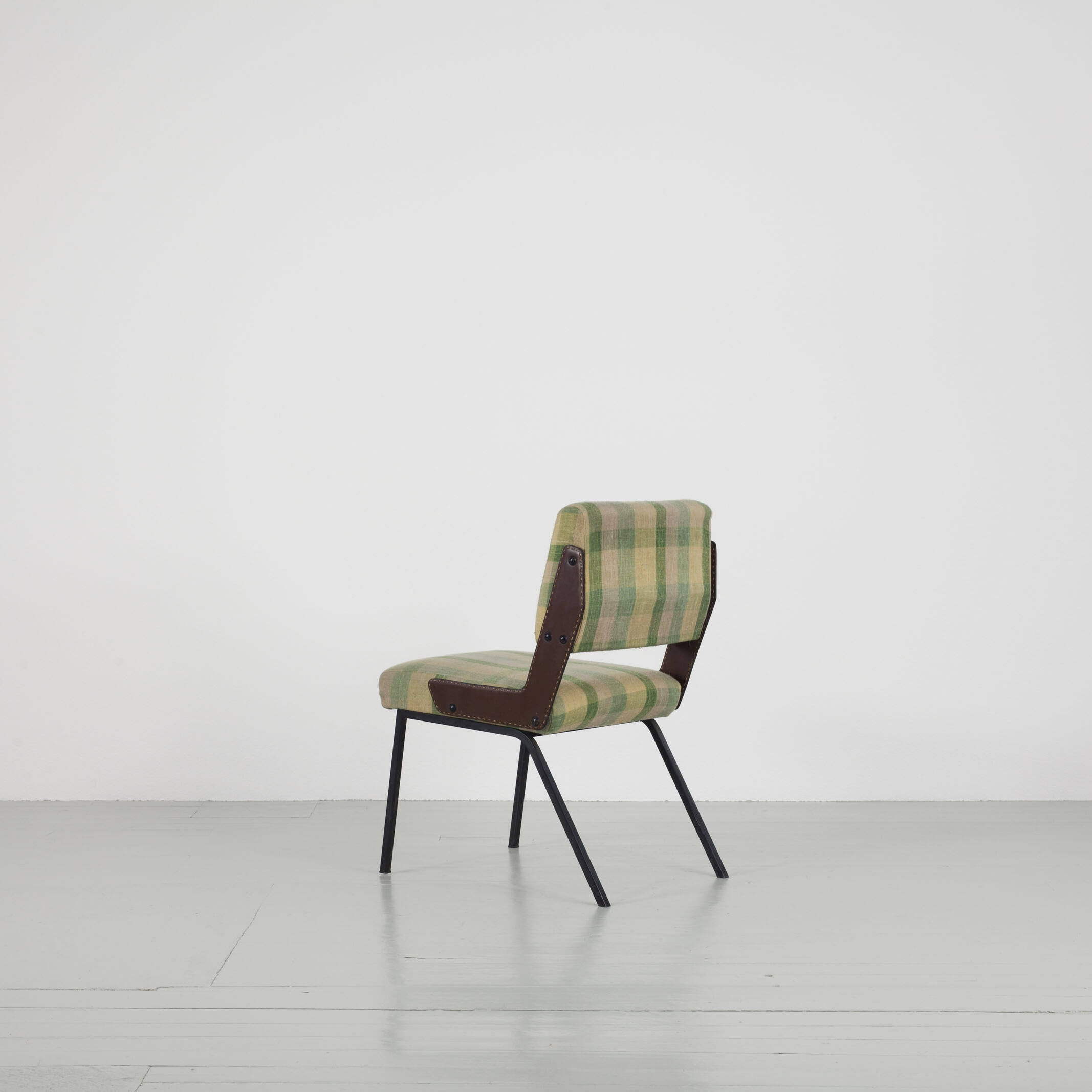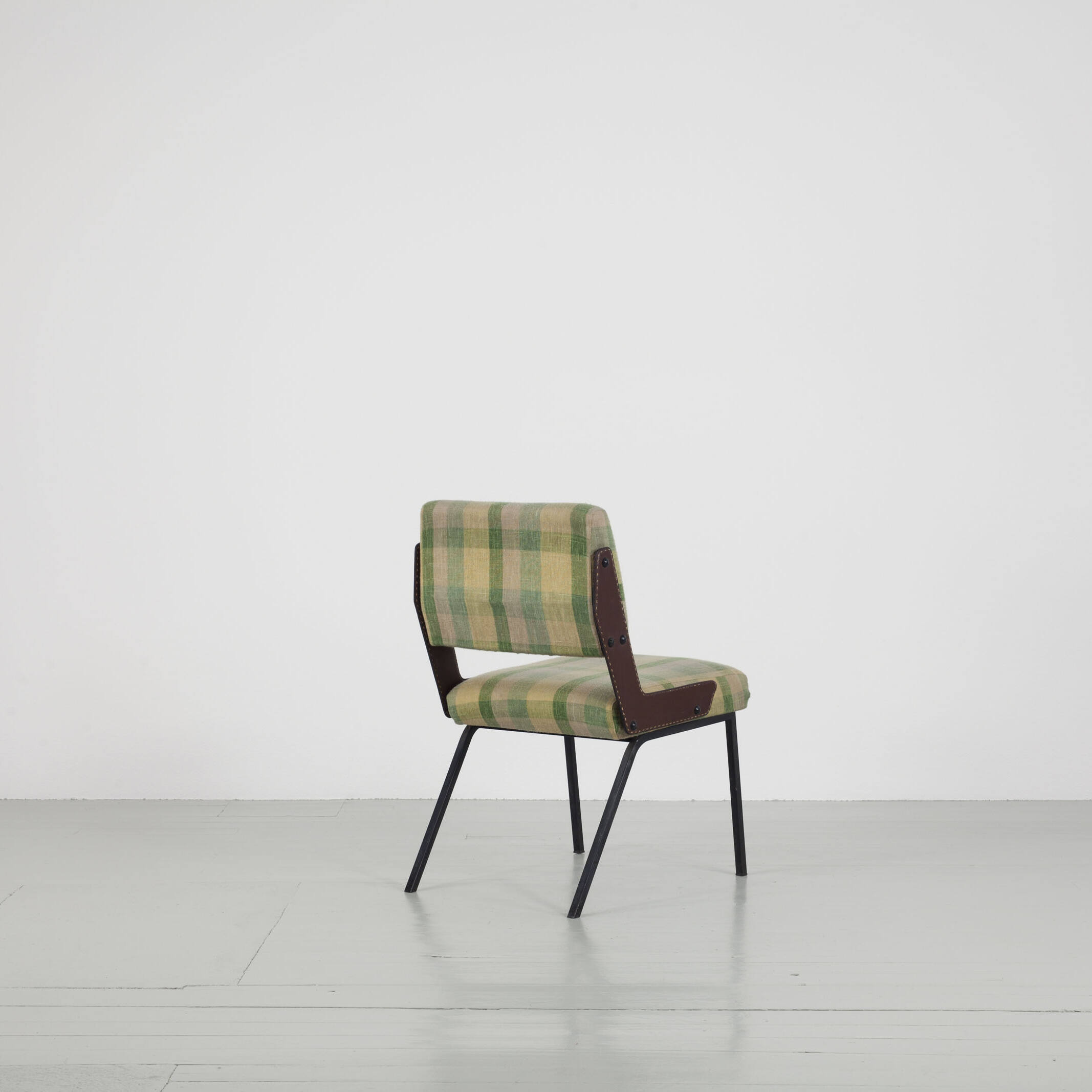 Dieser italienische Esszimmerstuhl wurde 1955 von Gustavo Pulitzer-Finali entworfen und von Arflex hergestellt. Dieses Modell wurde für die Ausstattung eines italienischen Kreuzfahrtschiffs konstruiert. Er verfügt über einen lackierten Metallrahmen und Seiten aus geformtem Metallblech mit dunkelbraunem Leder überzogen. Die Sitz- und Rückfläche besteht aus Schaumstoff, der von einem außergewöhnlichen Stoff bezogen ist. Die Farben und verwendeten Materialien machen das Möbelstück zu einem ausgewogenen Entwurf, welcher sich in schönem Originalzustand befindet.