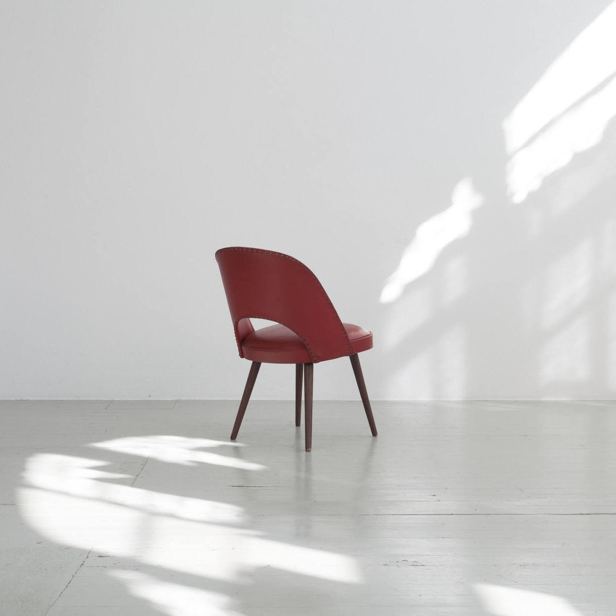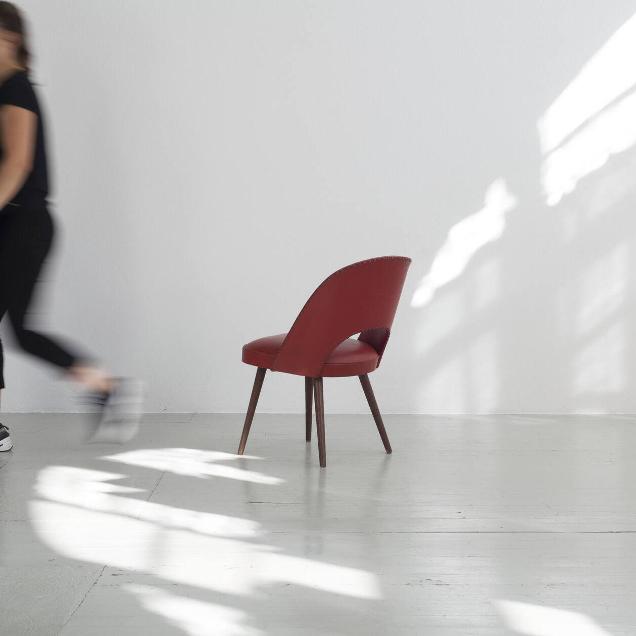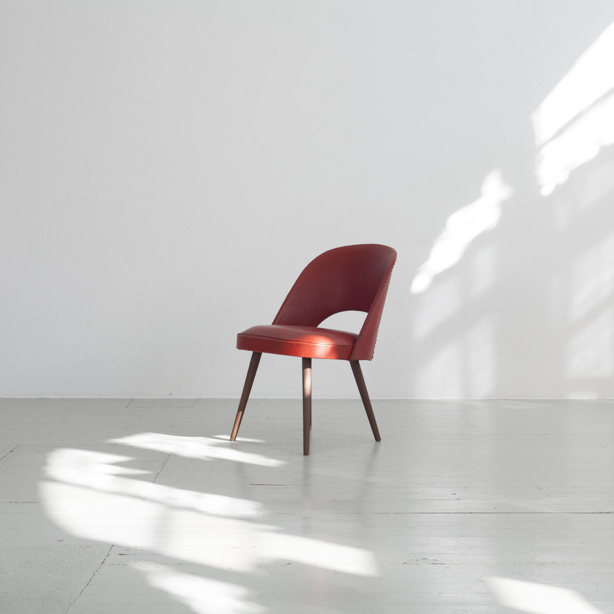 Der relativ kleine Cocktailstuhl mit einem festen Vinylbezug überzogen, dessen Nähte durch eine Kederleiste stabilisiert werden. Die Rückenlehne ist nicht nur mit Polsternägeln im unteren Bogen verziert, sondern auch verstärkt. Die Stühle stehen stabil auf hellen Buchenholzbeinen. Die federnde Polsterung der Sitzfläche macht diese Stühle sehr bequem.