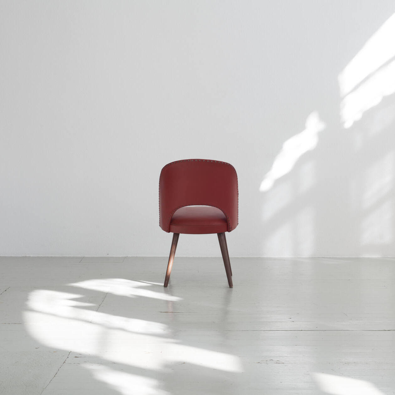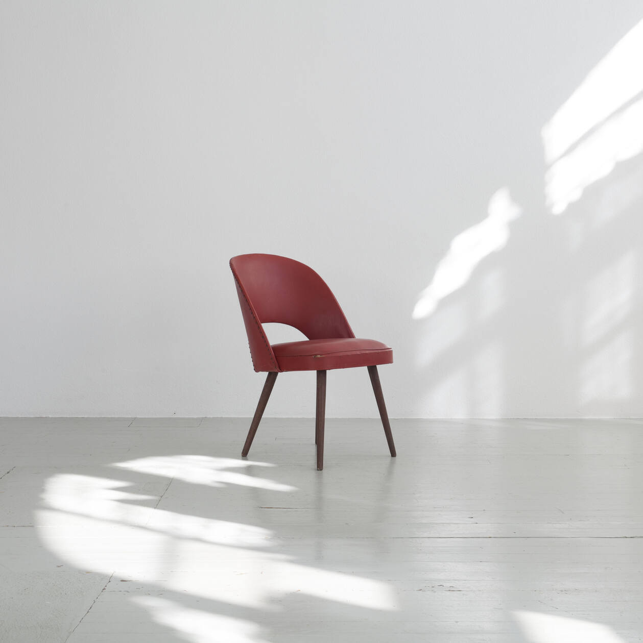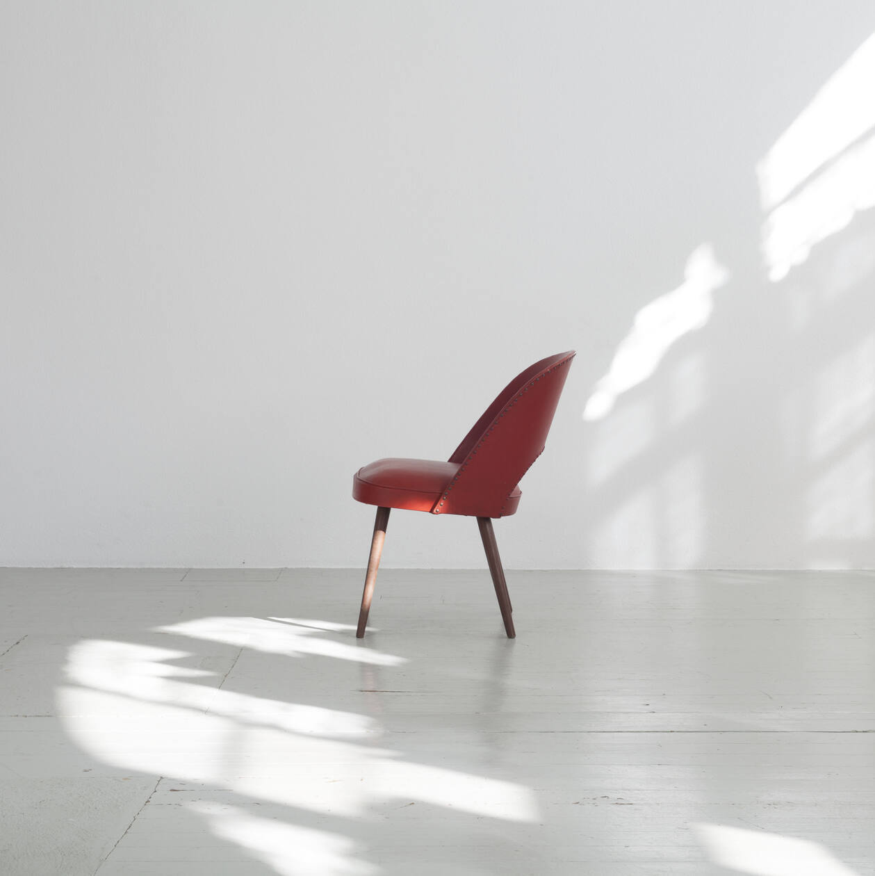 Der relativ kleine Cocktailstuhl mit einem festen Vinylbezug überzogen, dessen Nähte durch eine Kederleiste stabilisiert werden. Die Rückenlehne ist nicht nur mit Polsternägeln im unteren Bogen verziert, sondern auch verstärkt. Die Stühle stehen stabil auf hellen Buchenholzbeinen. Die federnde Polsterung der Sitzfläche macht diese Stühle sehr bequem.