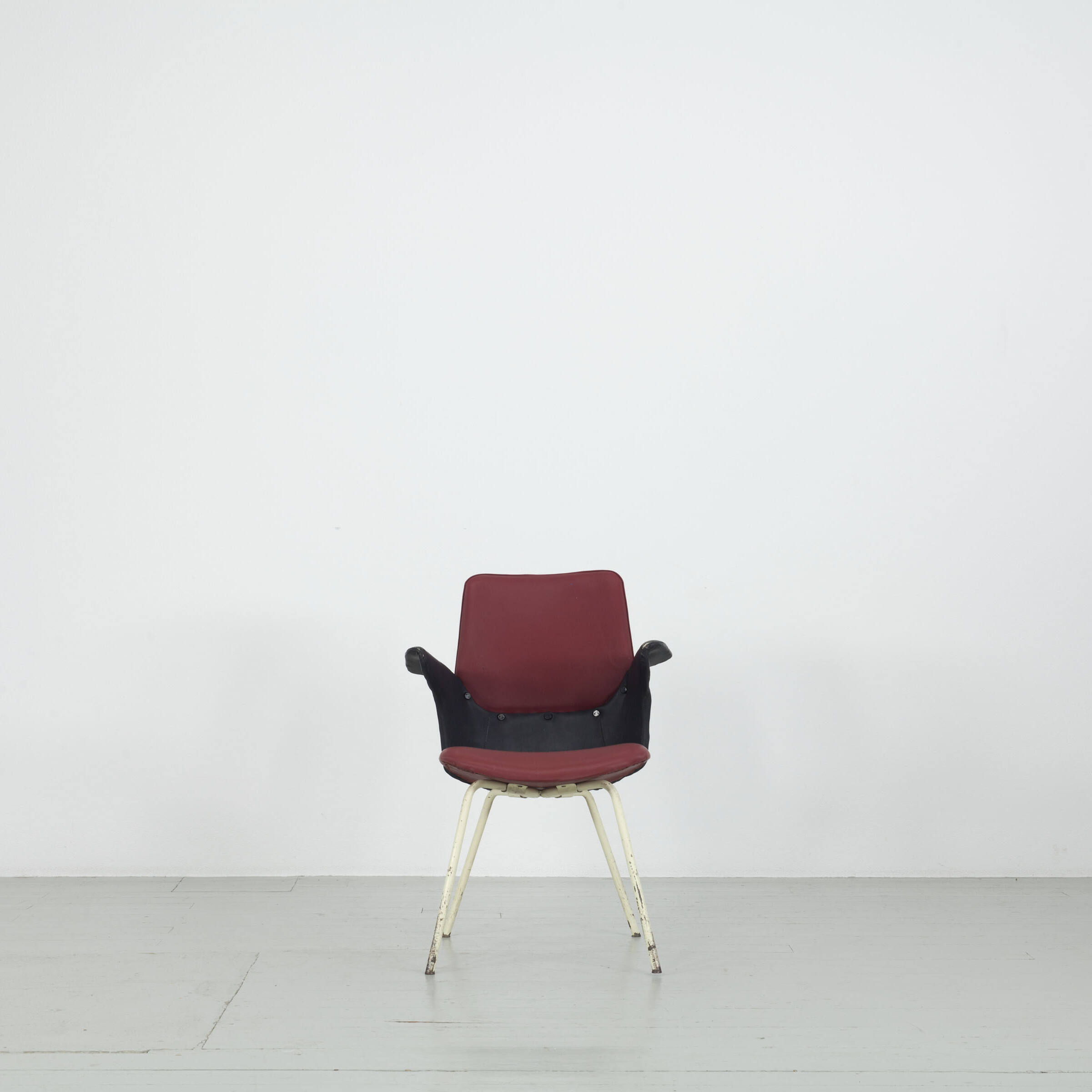 Der von zweifarbigem Kunstleder bezogene Stuhl „Modell Du 20“ wurde in den 1950iger Jahre von Gastone Rinaldi entworfen und von Rima in Italien hergestellt. Ein Markenzeichen des Herstellers ist auf dem Stuhl zu sehen, der sich im Originalzustand befindet, weshalb die hell lackierten Metallbeine Gebrauchsspuren und altersbedingte Patina aufweisen.