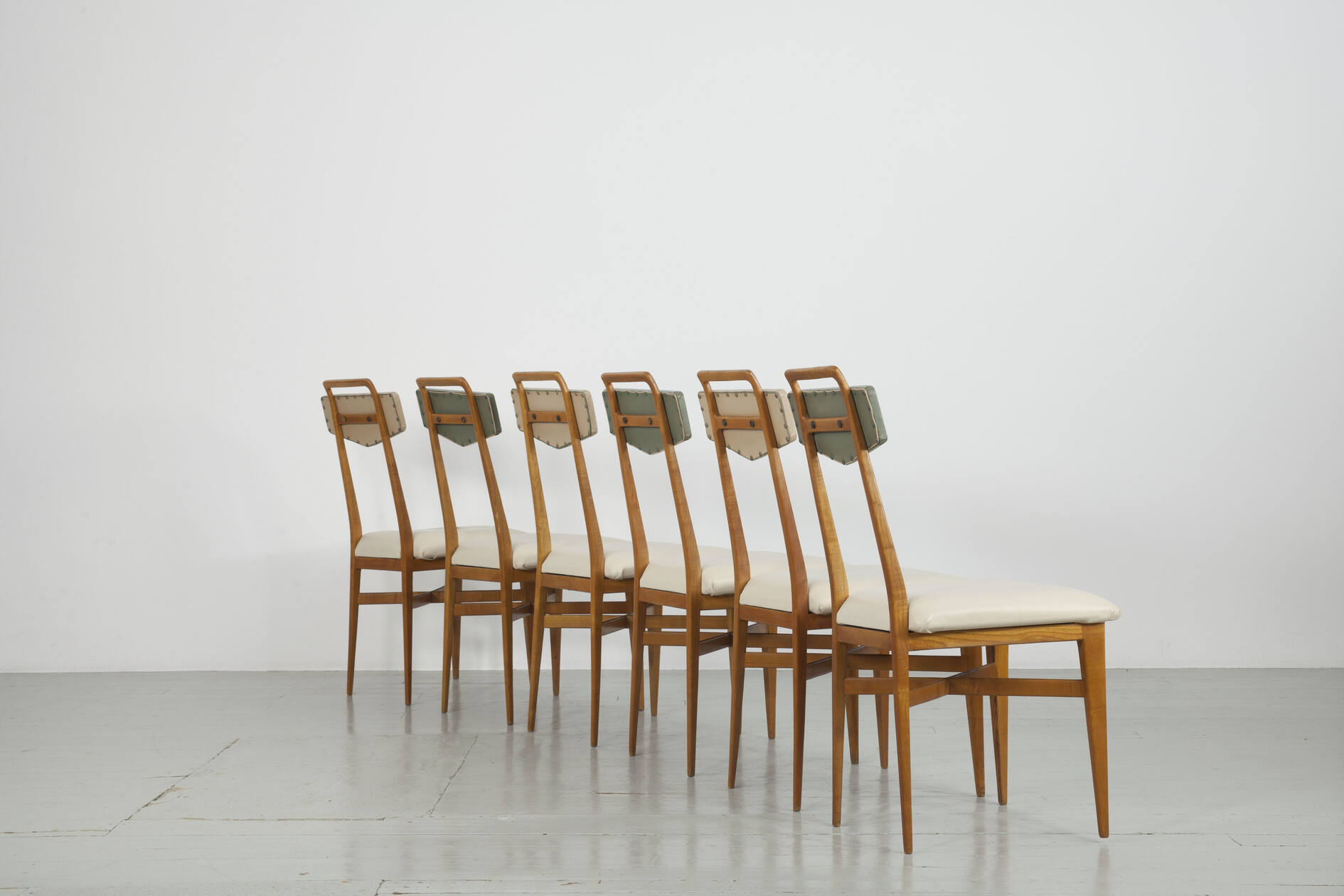 Dieses Set von sechs Stühlen mit Kunstlederbezug wurde in den 1950iger Jahren in Italien hergestellt. Während die Stühle alle aus demselben lackiertem Lärchenholz und im selben Stil hergestellt sind, unterscheiden sie sich in der Farbe der Rückenlehne, die entweder aus beigem oder olivfarbenem Kunstleder besteht. Eine Sitzfläche hat einen Riss, ansonsten befinden sich die Stühle in sehr gutem Zustand mit leichten Gebrauchsspuren auf dem Holz.