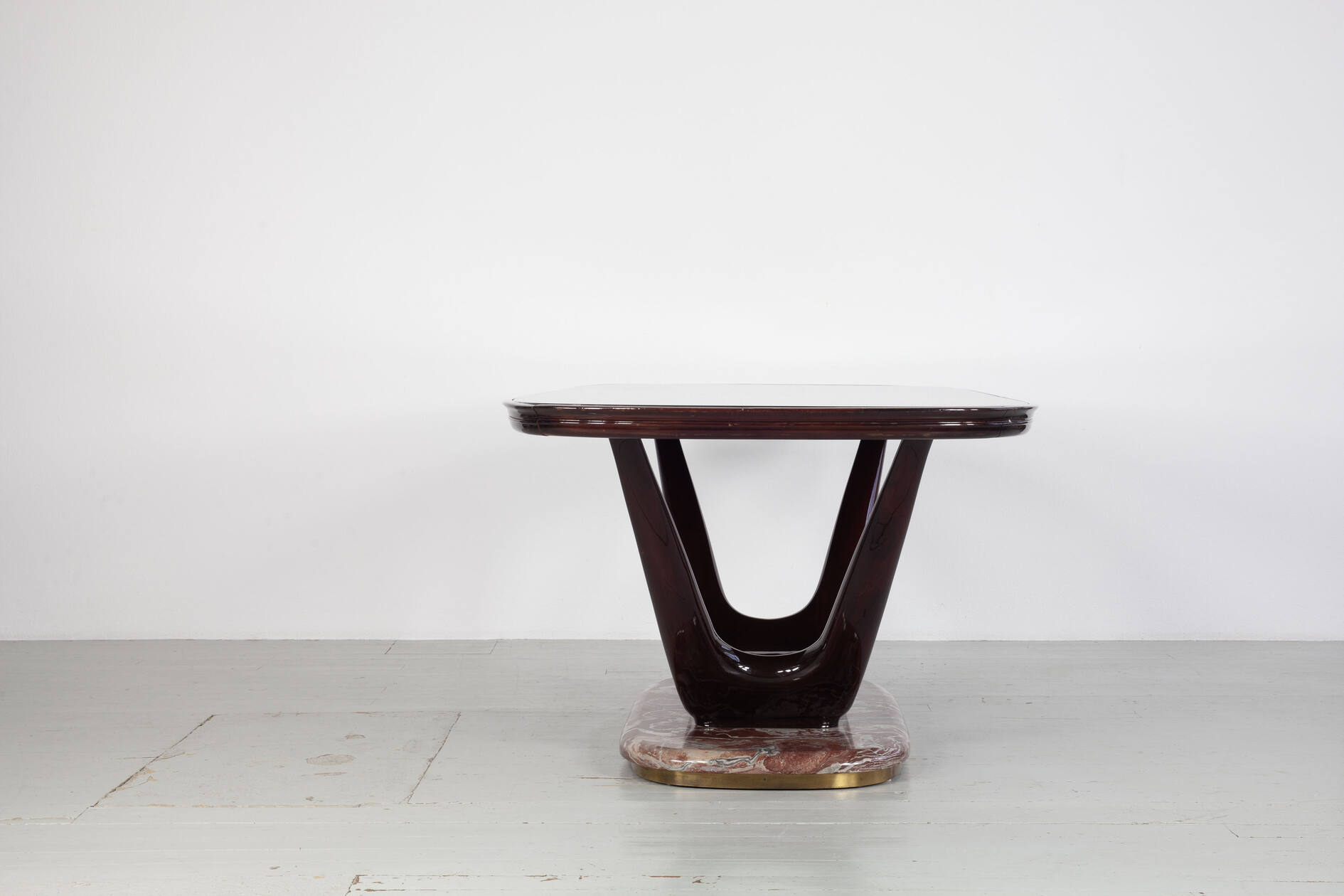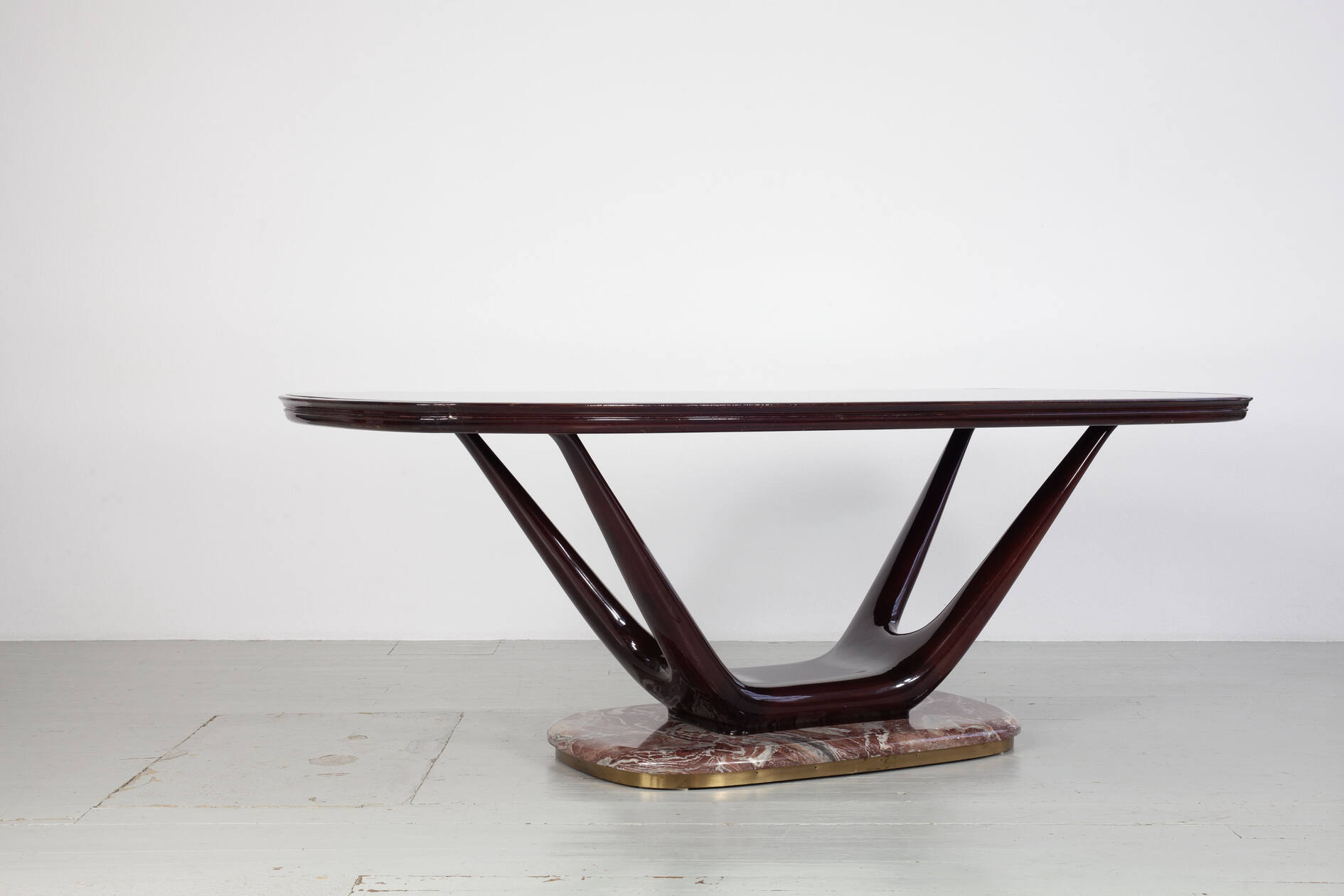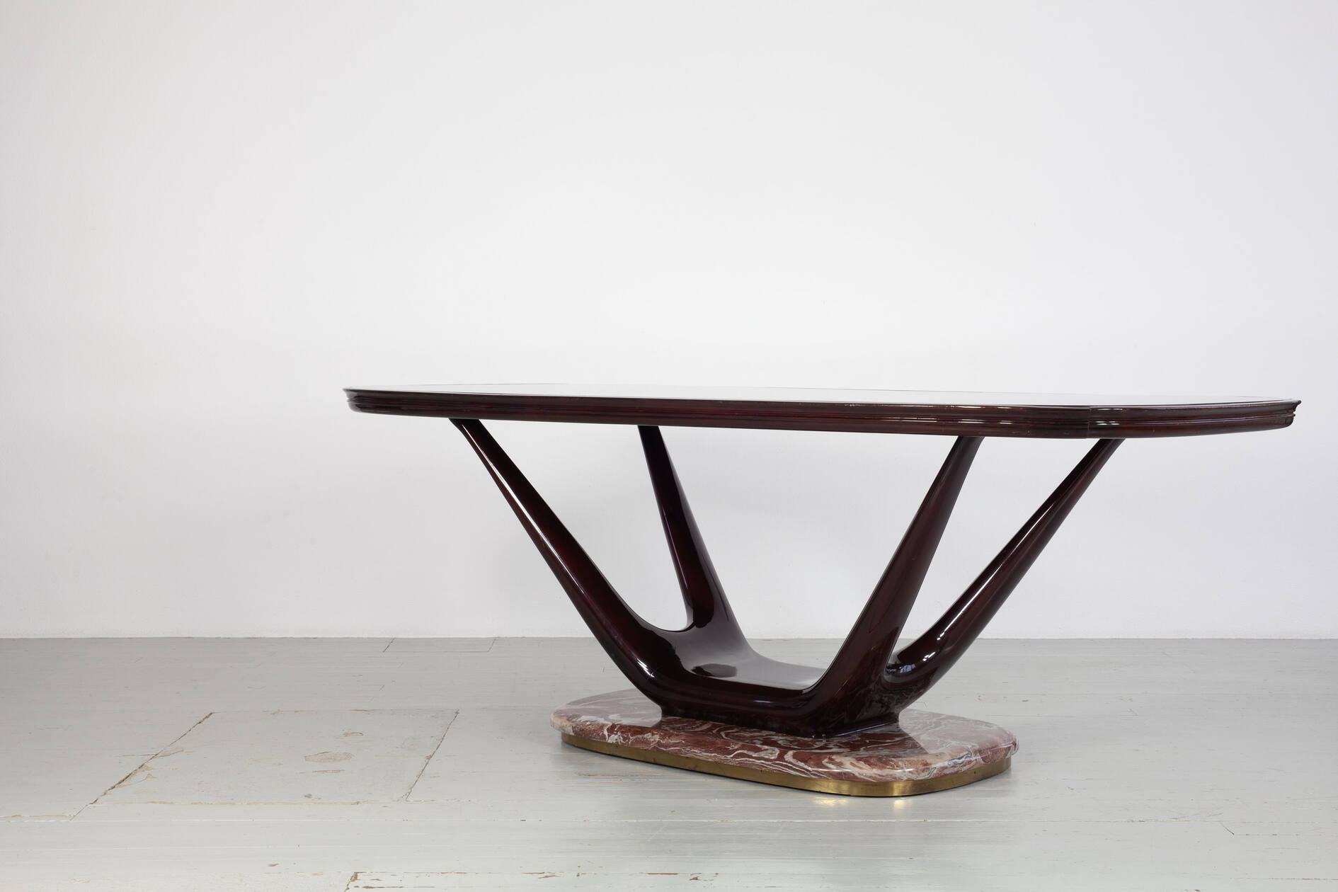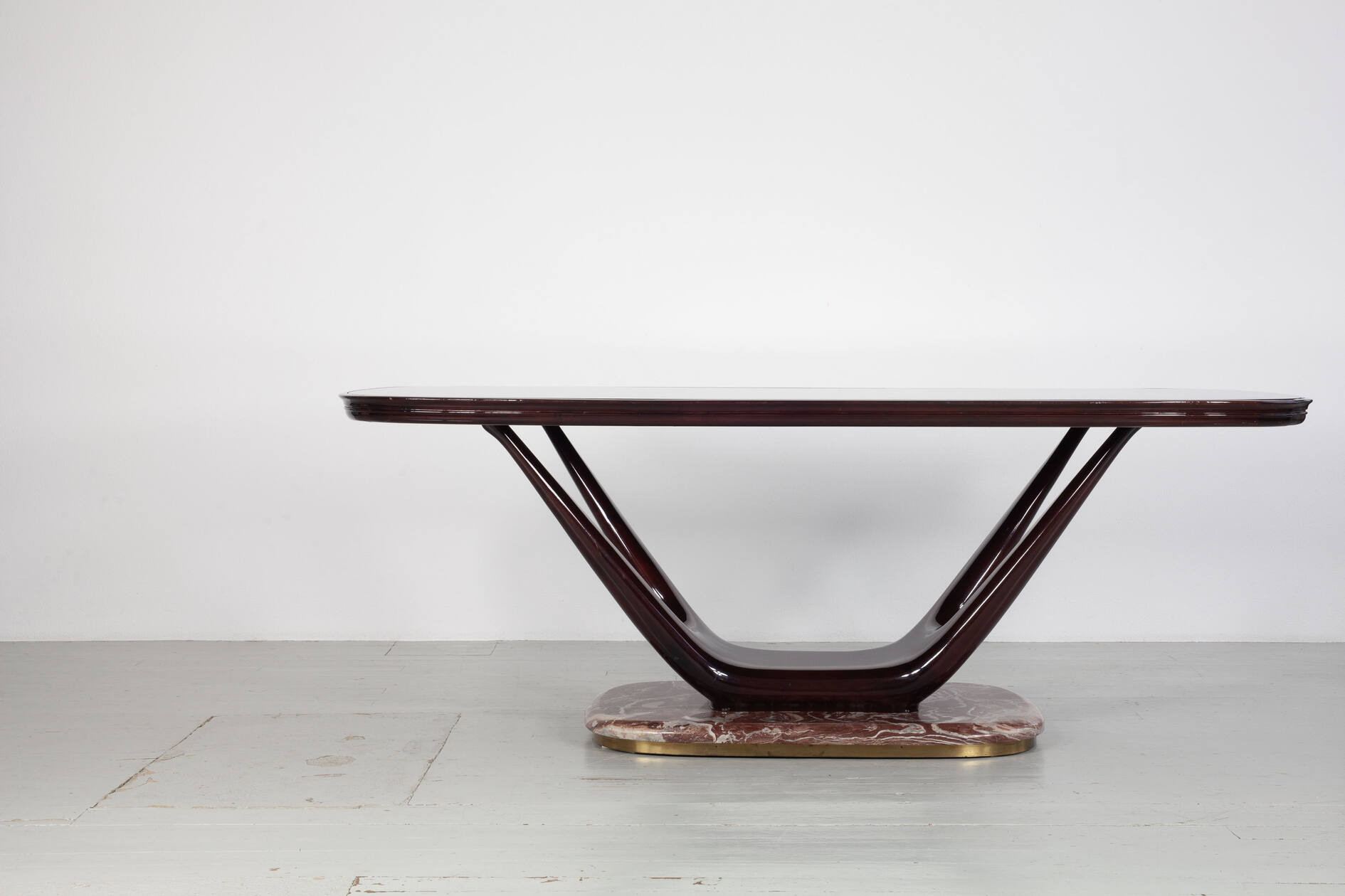 Eleganter Mid-Century-Esstisch mit einem Gestell aus dunkel lackierter, massiver Buche. In die Tischoberseite ist eine auberginenfarbene Glasplatte eingelassen, die dem Stück eine außergewöhnliche farbliche Tiefe verleiht. Der Tisch ruht auf einem markanten roten Marmorfuß mit umlaufendem Messingrand – ein charakteristisches Detail der hochwertigen italienischen Gestaltung der 1950er Jahre.