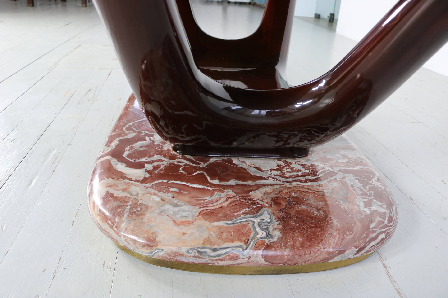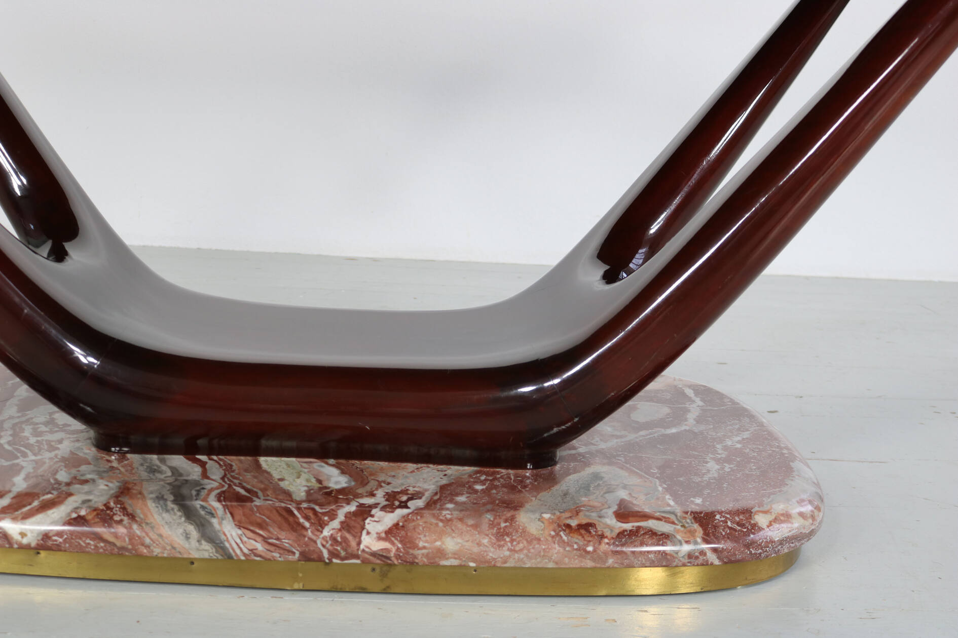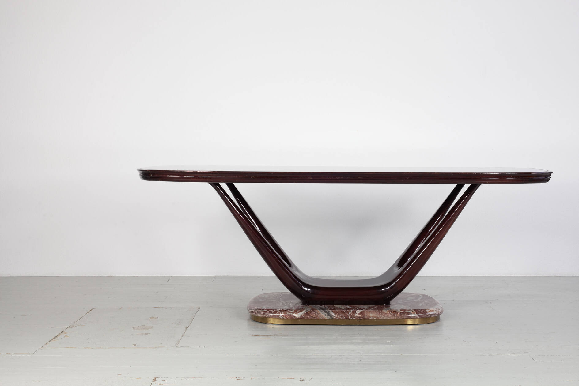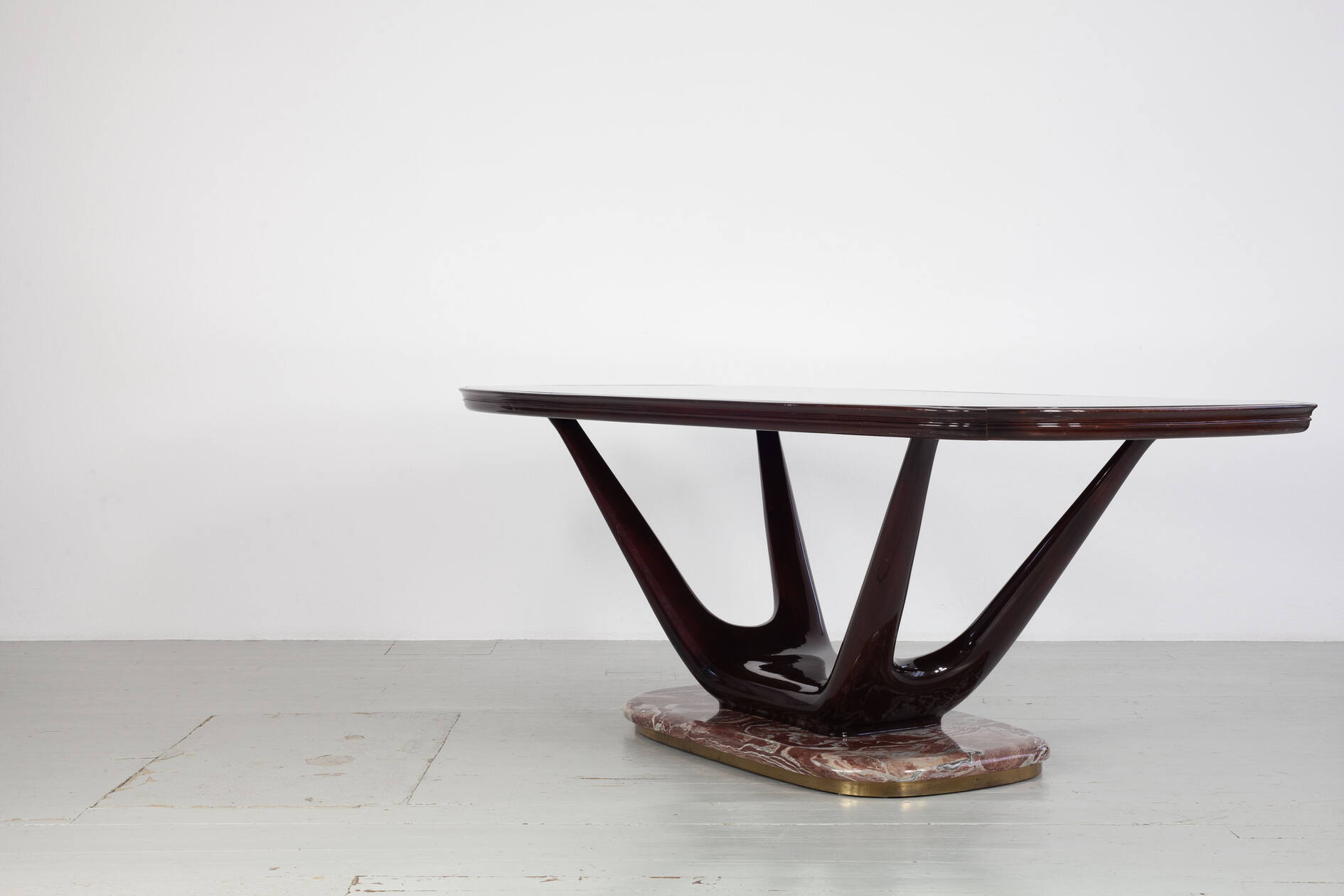 Eleganter Mid-Century-Esstisch mit einem Gestell aus dunkel lackierter, massiver Buche. In die Tischoberseite ist eine auberginenfarbene Glasplatte eingelassen, die dem Stück eine außergewöhnliche farbliche Tiefe verleiht. Der Tisch ruht auf einem markanten roten Marmorfuß mit umlaufendem Messingrand – ein charakteristisches Detail der hochwertigen italienischen Gestaltung der 1950er Jahre.