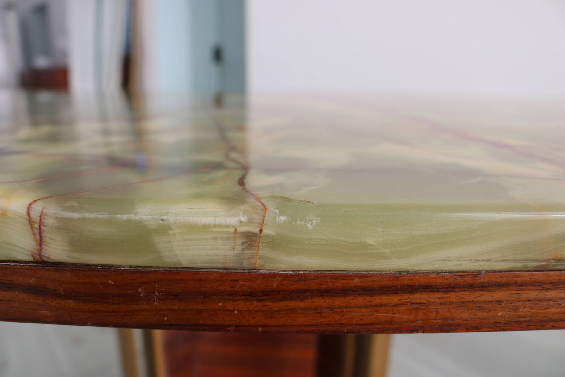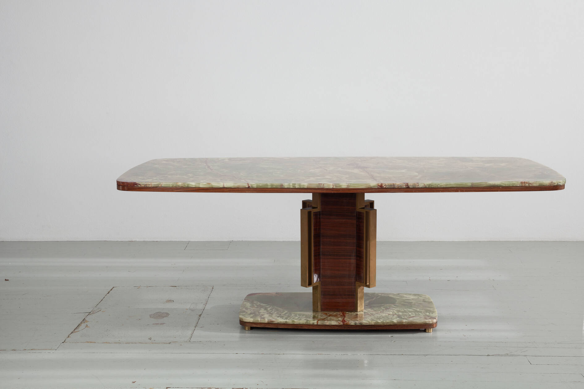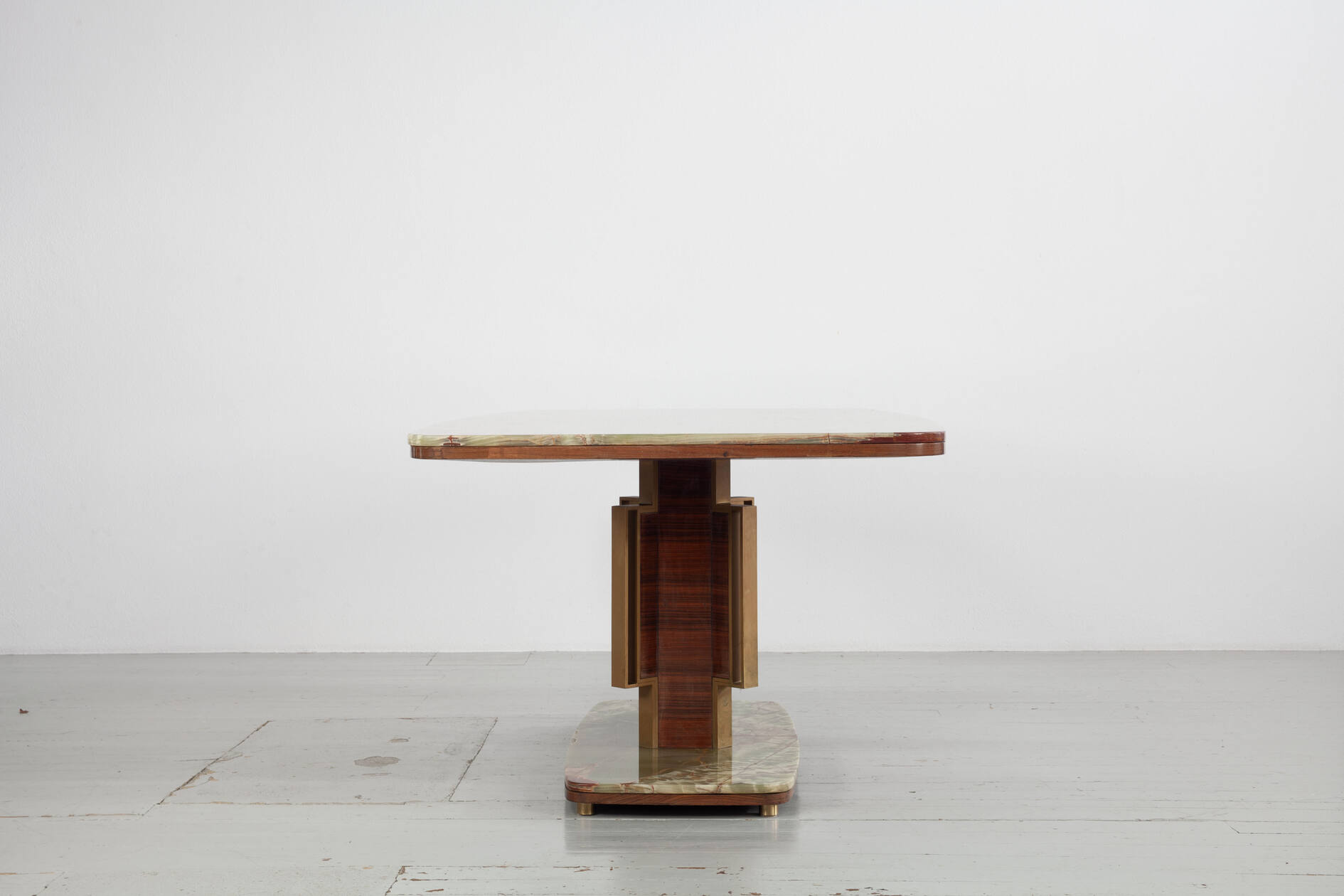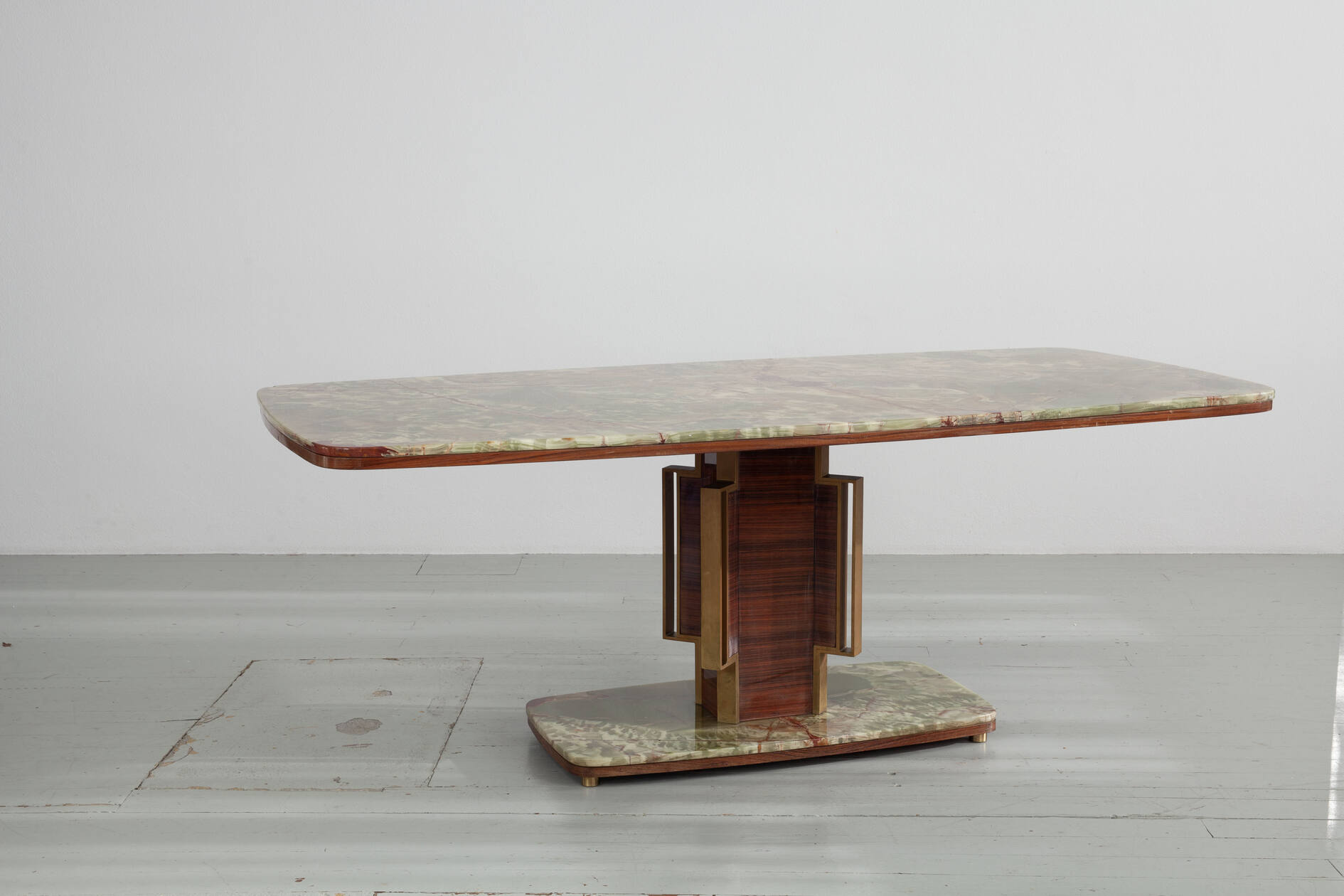Handgefertigter Tisch aus Cantù mit hochwertiger Verarbeitung. Das Gestell besteht aus exotischem Holzfurnier und ist durch dekorative Elemente aus messingfarbenem Metall veredelt. Die Tischplatte und der Sockel sind aus edlem Onyx gefertigt, was dem Tisch eine luxuriöse Ausstrahlung verleiht.