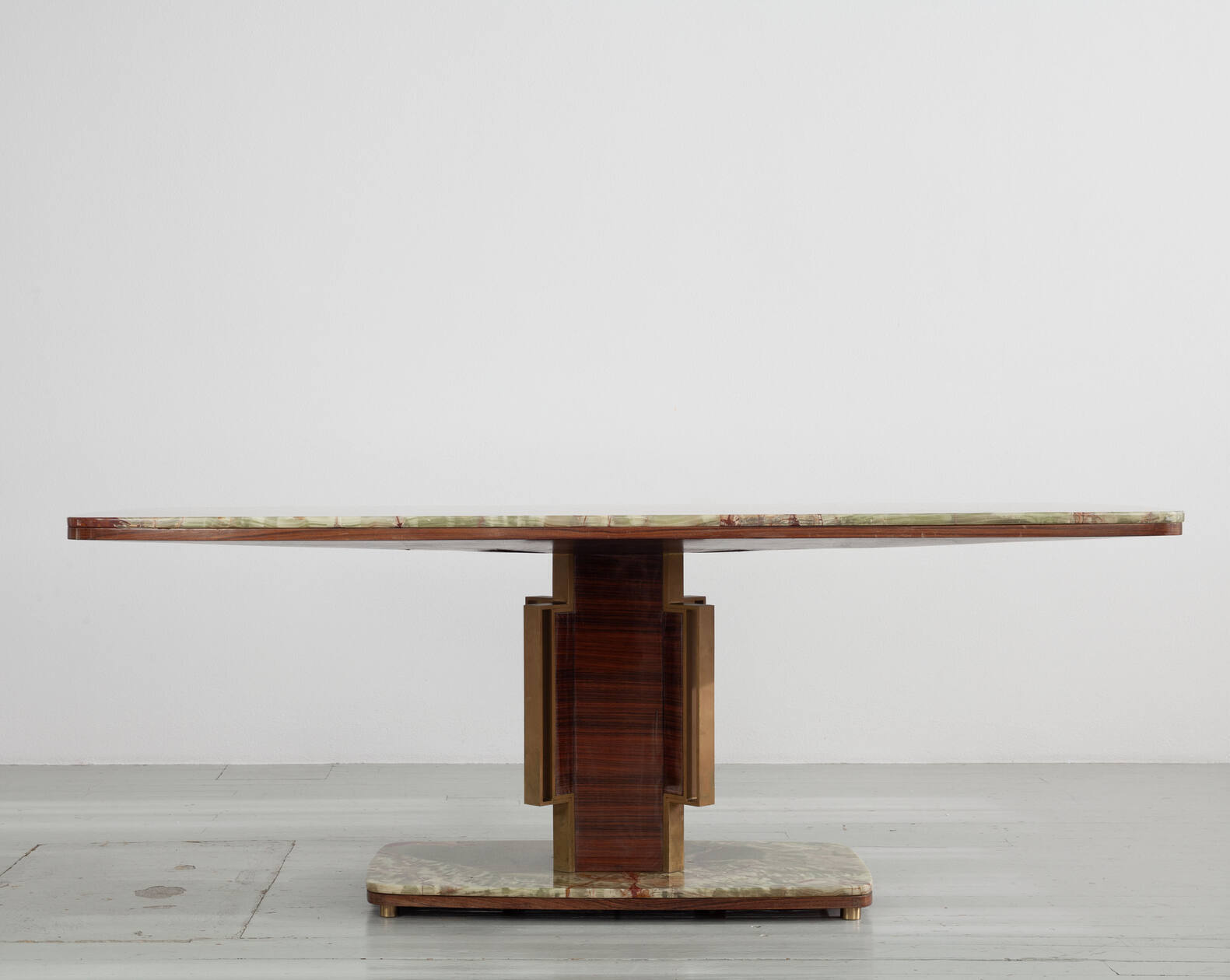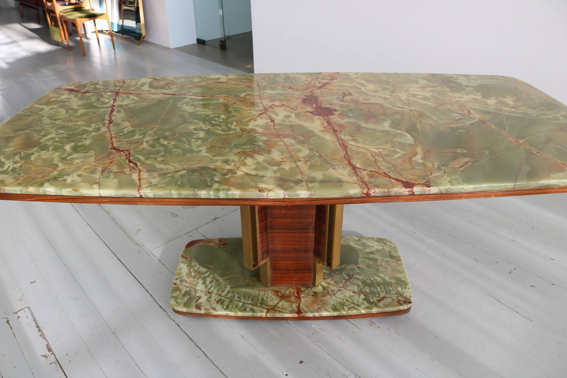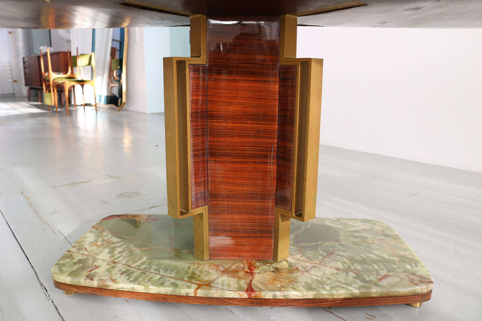 Handgefertigter Tisch aus Cantù mit hochwertiger Verarbeitung. Das Gestell besteht aus exotischem Holzfurnier und ist durch dekorative Elemente aus messingfarbenem Metall veredelt. Die Tischplatte und der Sockel sind aus edlem Onyx gefertigt, was dem Tisch eine luxuriöse Ausstrahlung verleiht.