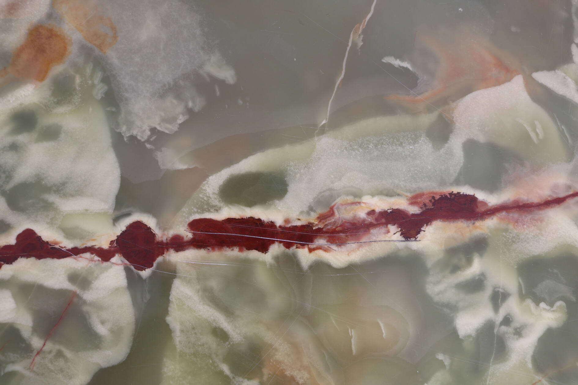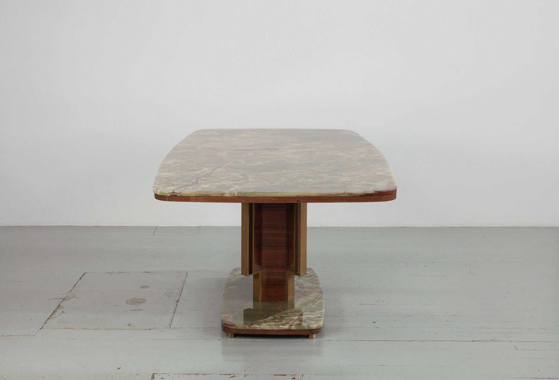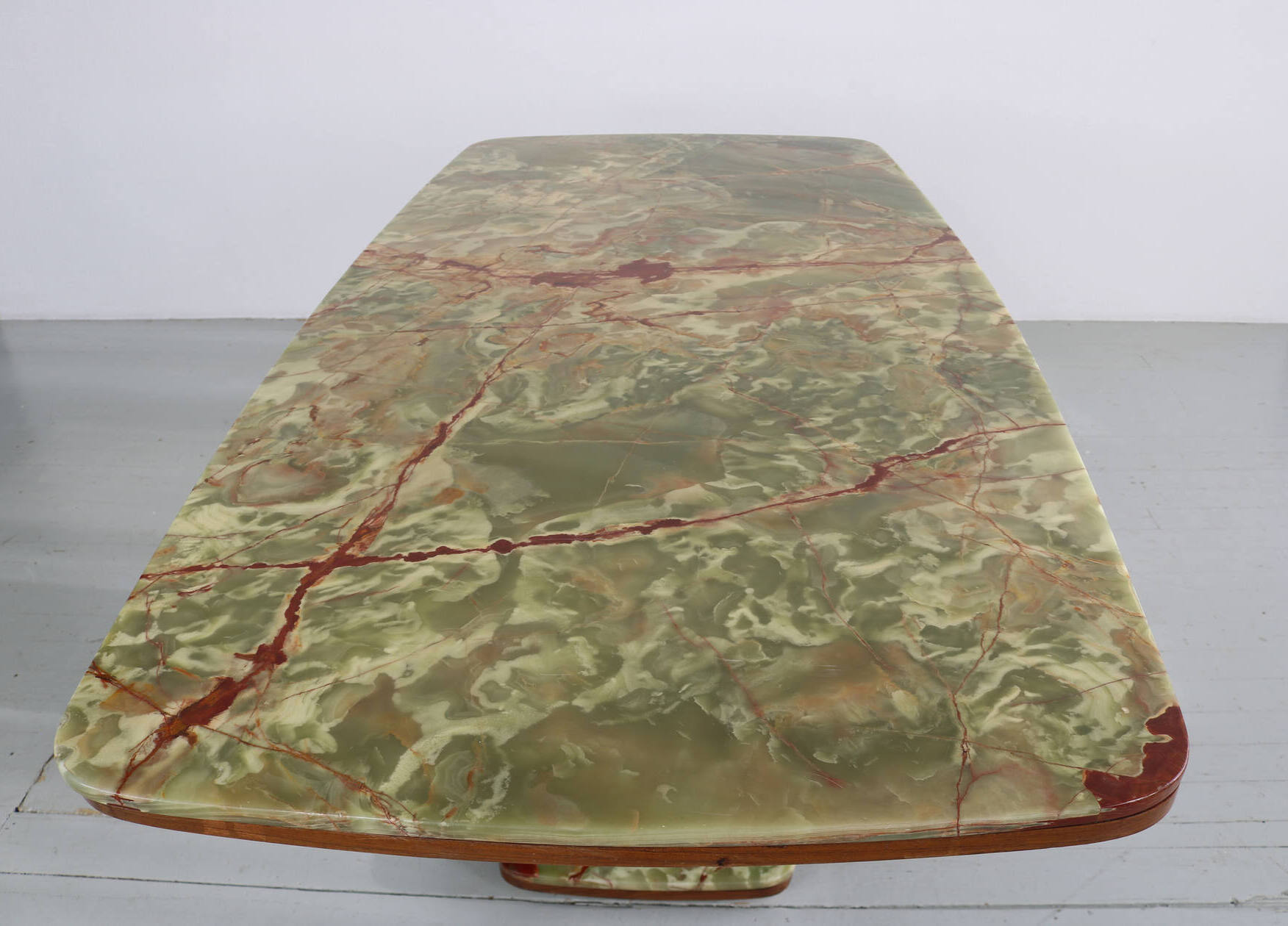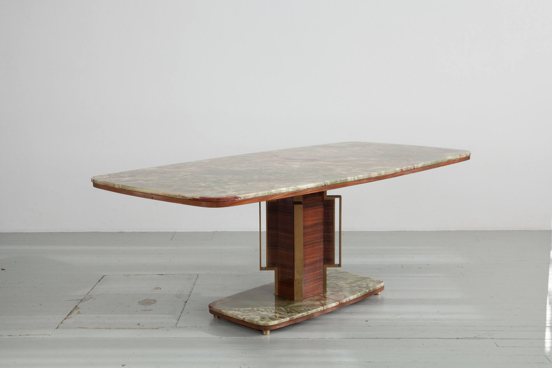 Handgefertigter Tisch aus Cantù mit hochwertiger Verarbeitung. Das Gestell besteht aus exotischem Holzfurnier und ist durch dekorative Elemente aus messingfarbenem Metall veredelt. Die Tischplatte und der Sockel sind aus edlem Onyx gefertigt, was dem Tisch eine luxuriöse Ausstrahlung verleiht.