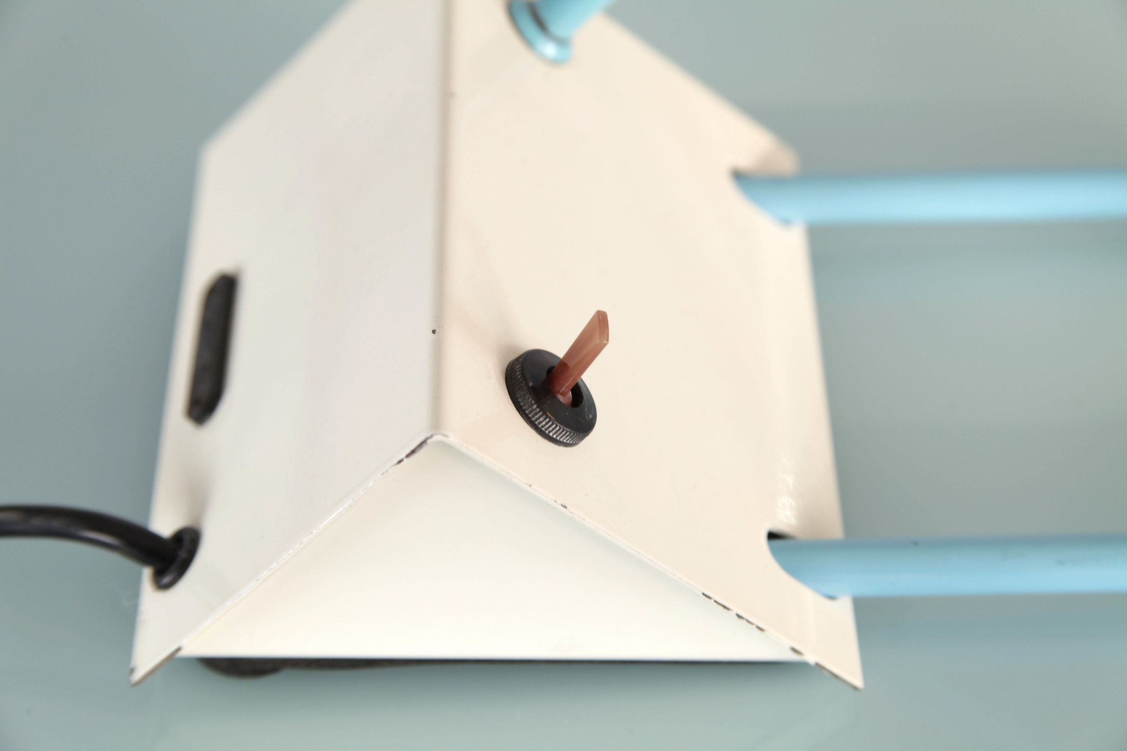Schreibtischleuchte, hergestellt von Candle. Die Leuchte verfügt über ein zweifarbig lackiertes Metallgehäuse, mit einem Lochblech im Bereich des Leuchtmittels.