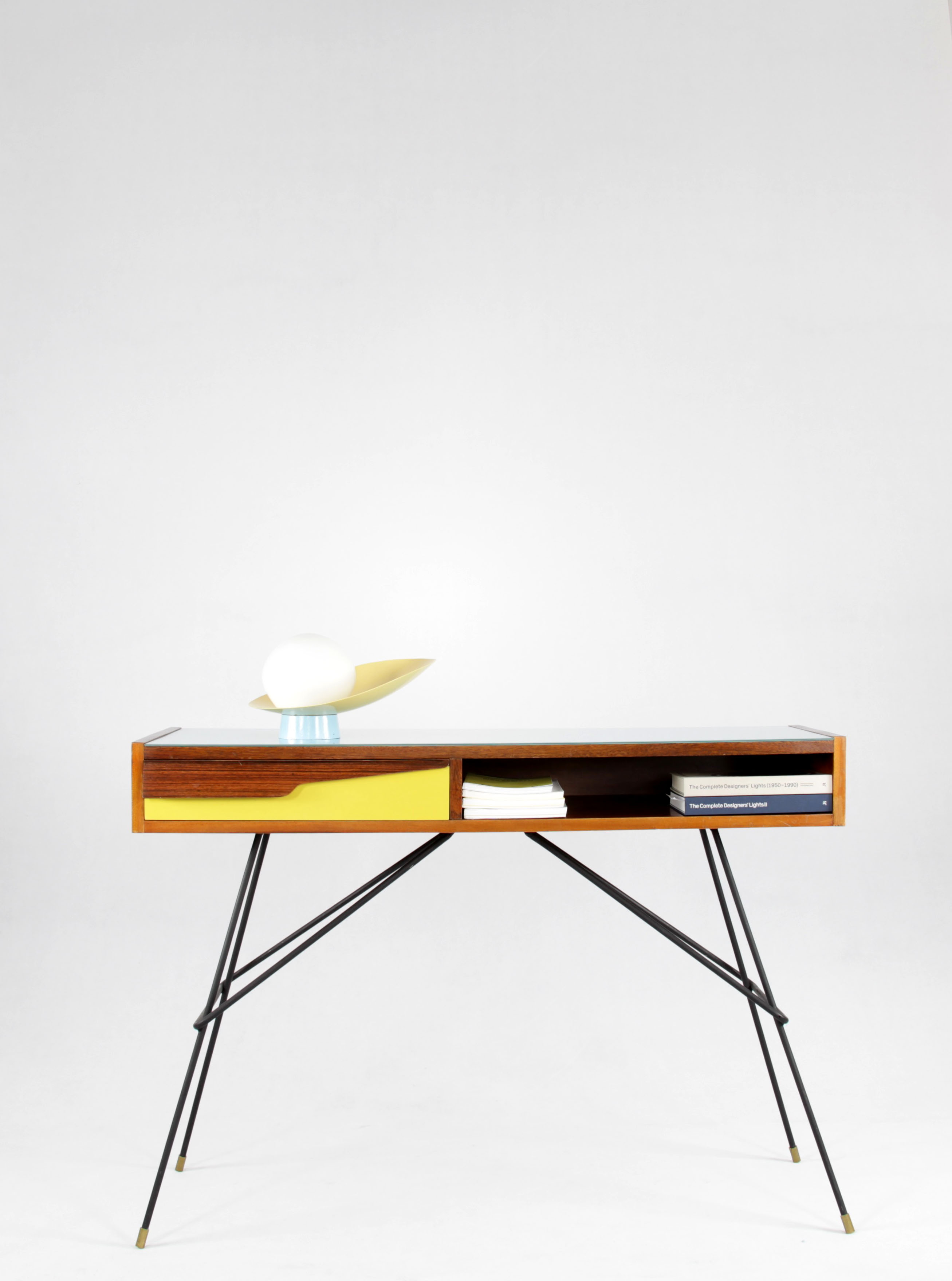 Italienische Wandleuchte aus den 60er Jahren. Der hellblaue Sockel der Leuchte ist ein Eisenguss der leichte Gebrauchsspuren vor allem an der Unterseite der Leuchte aufweist. Der gelbe Schirm der Lampe besteht aus Aluminium und die weiße Glaskugel im Zentrum der Wandleuchte fungiert als Leuchtkörper. Die Lampe befindet sich allgemein in einem guten Vintage Zustand und muss noch neu verkabelt werden.