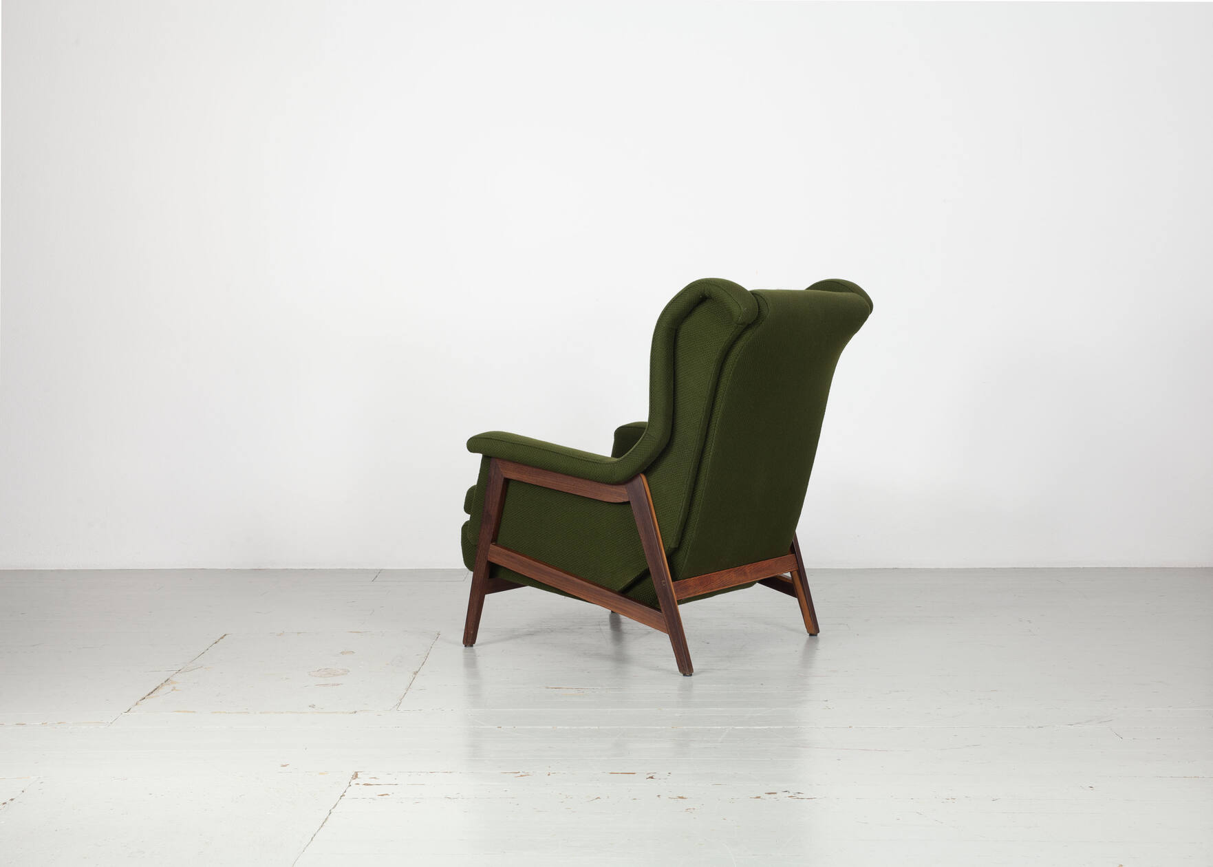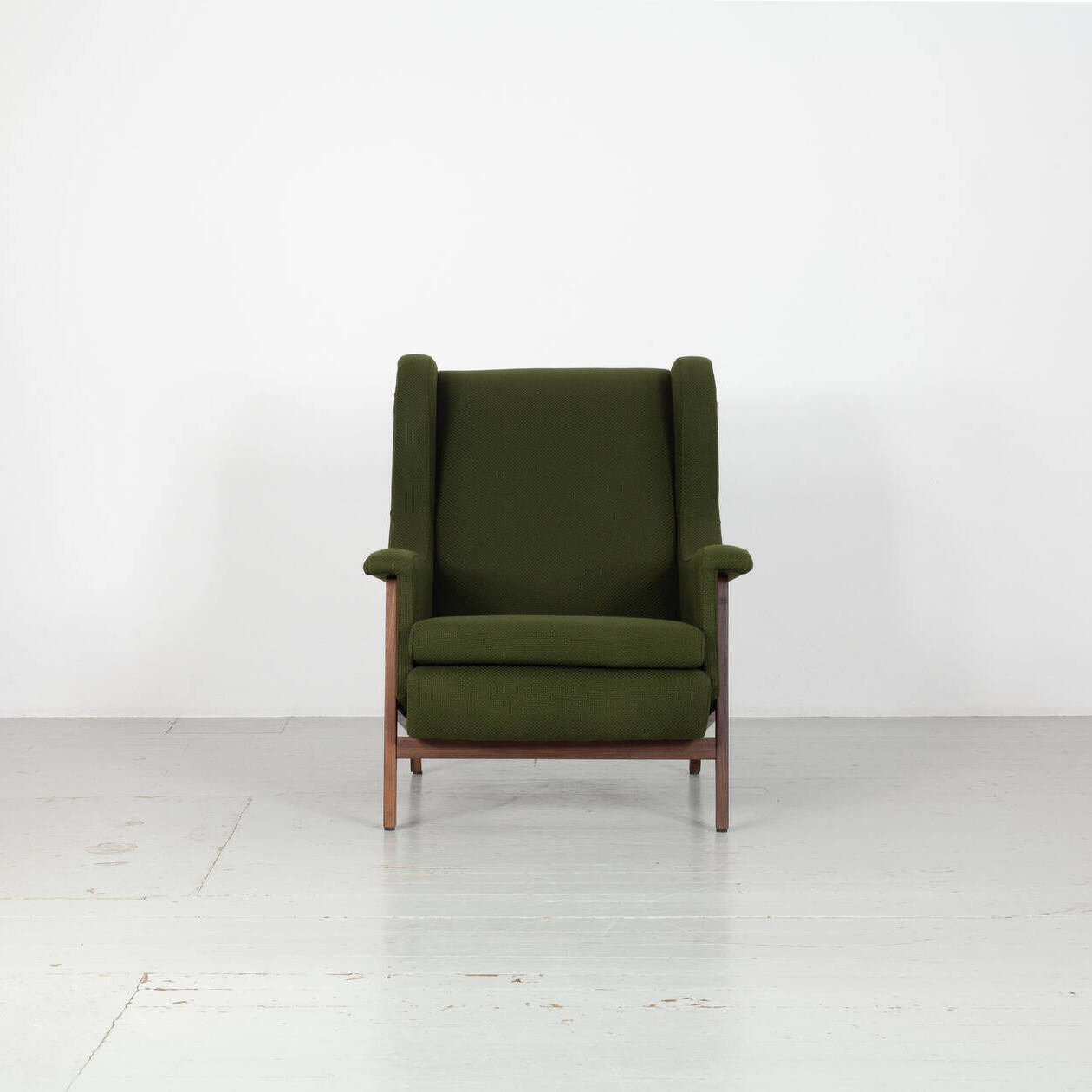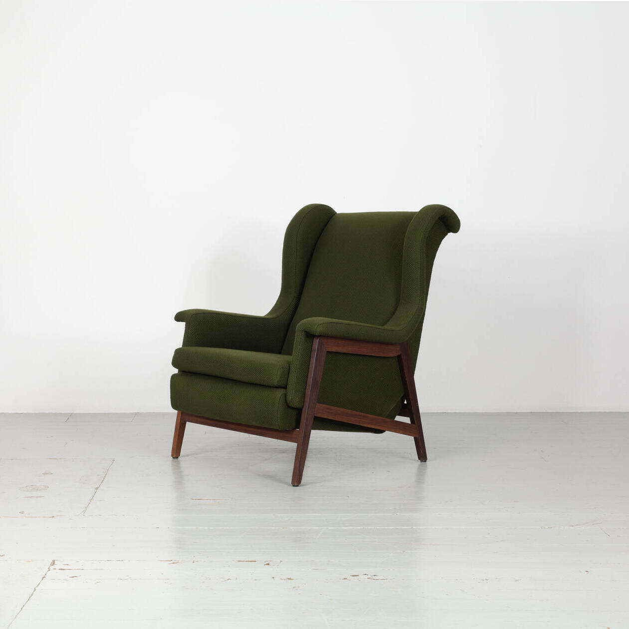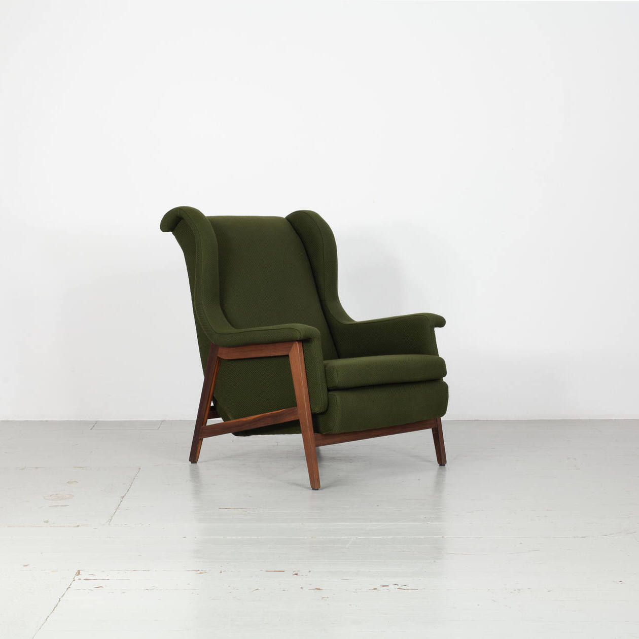 Italian wingchair in the manner of Gianfranco Frattini with a dark olive green vintage upholstery.