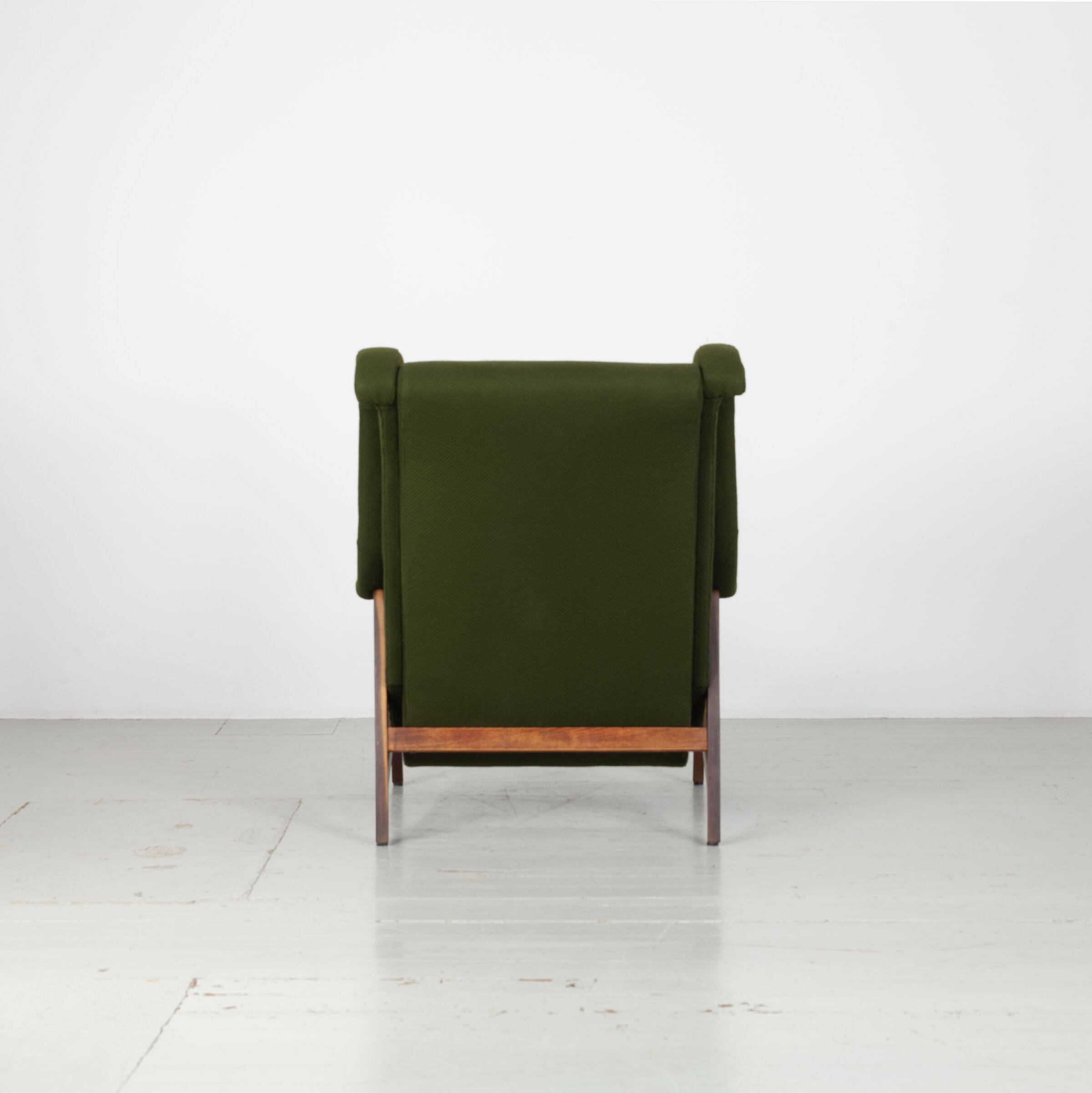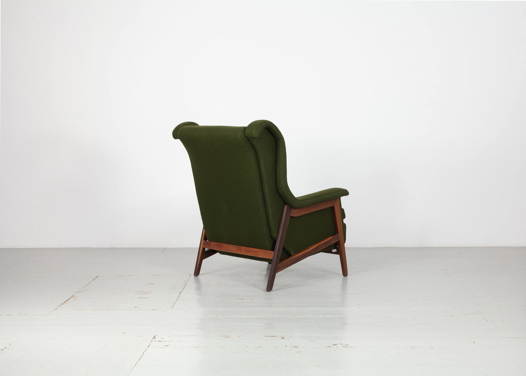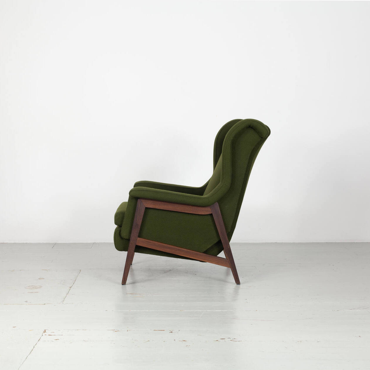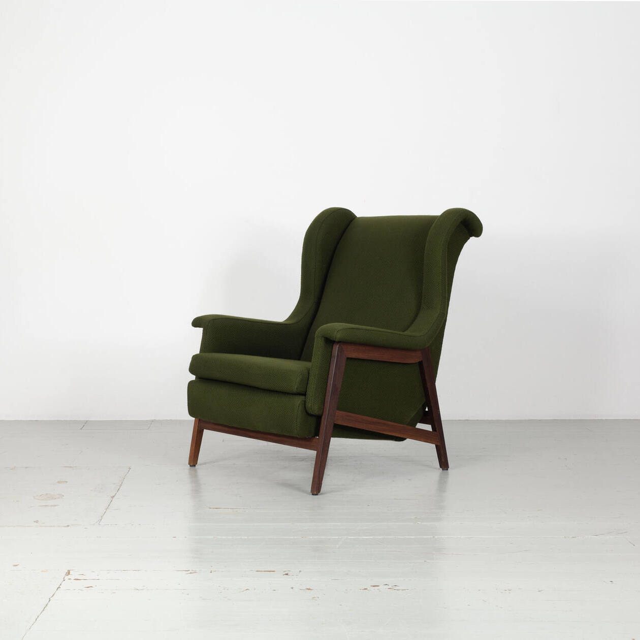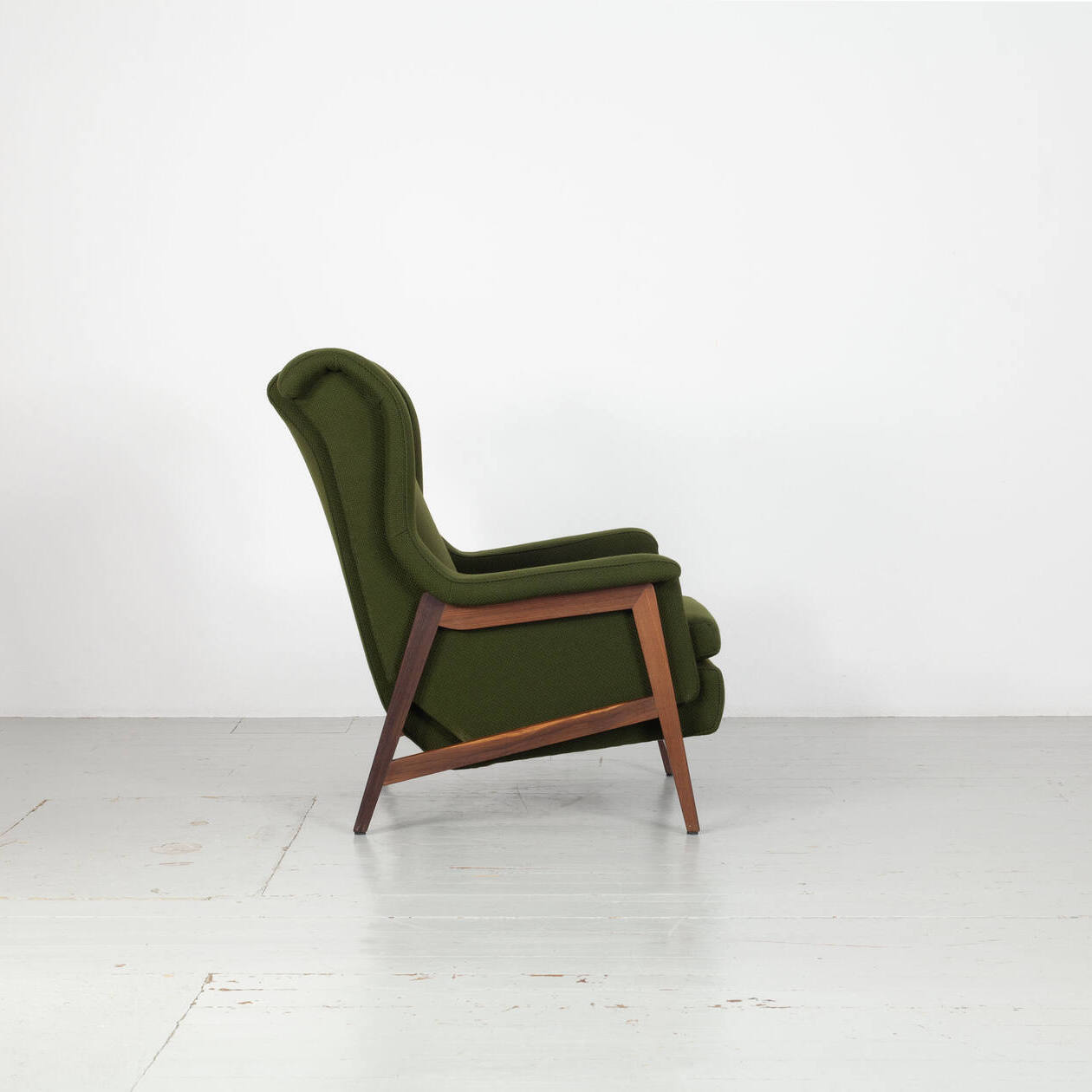 Italian wingchair in the manner of Gianfranco Frattini with a dark olive green vintage upholstery.