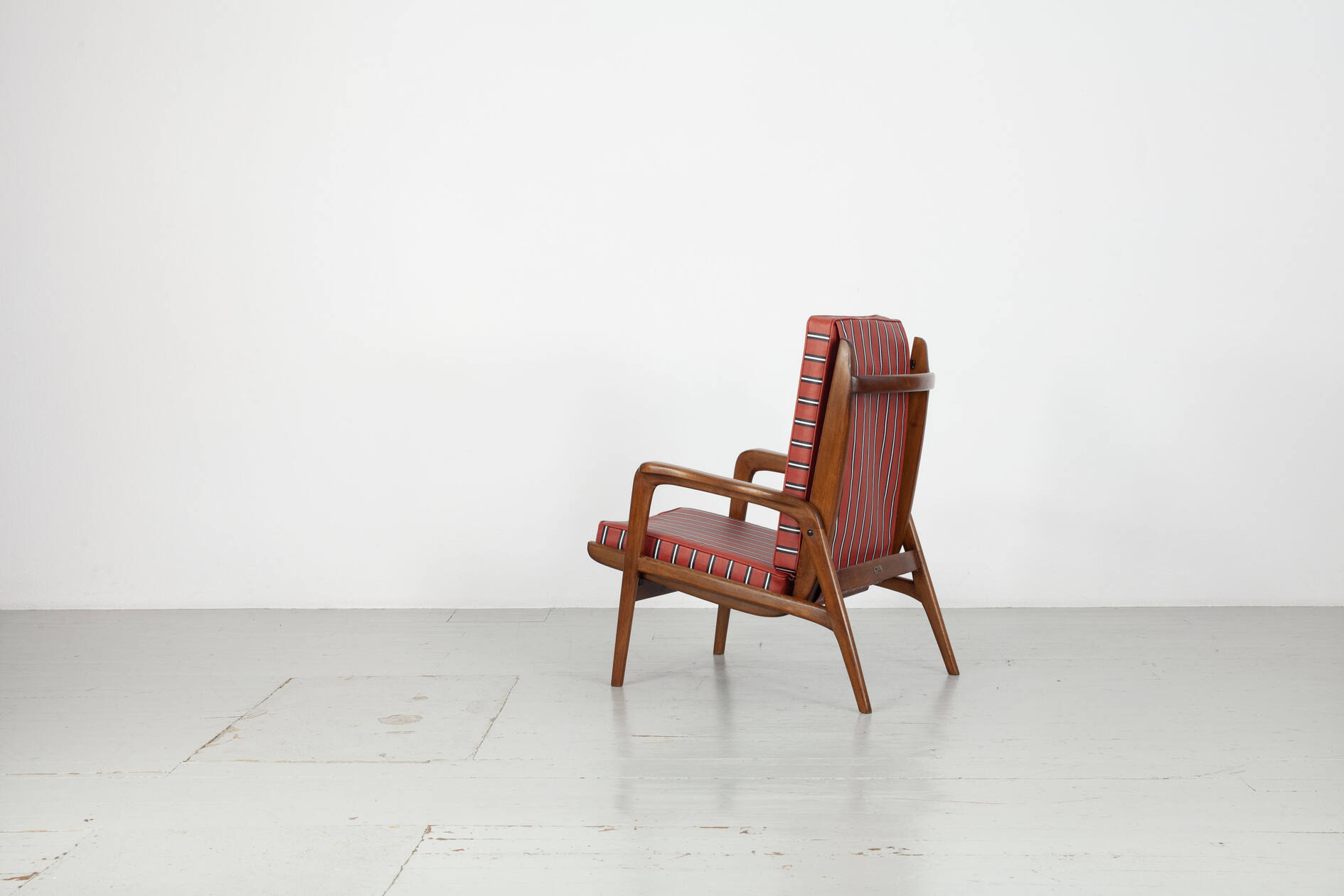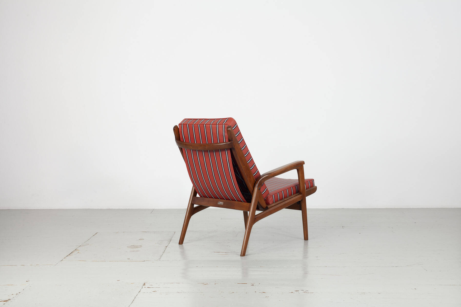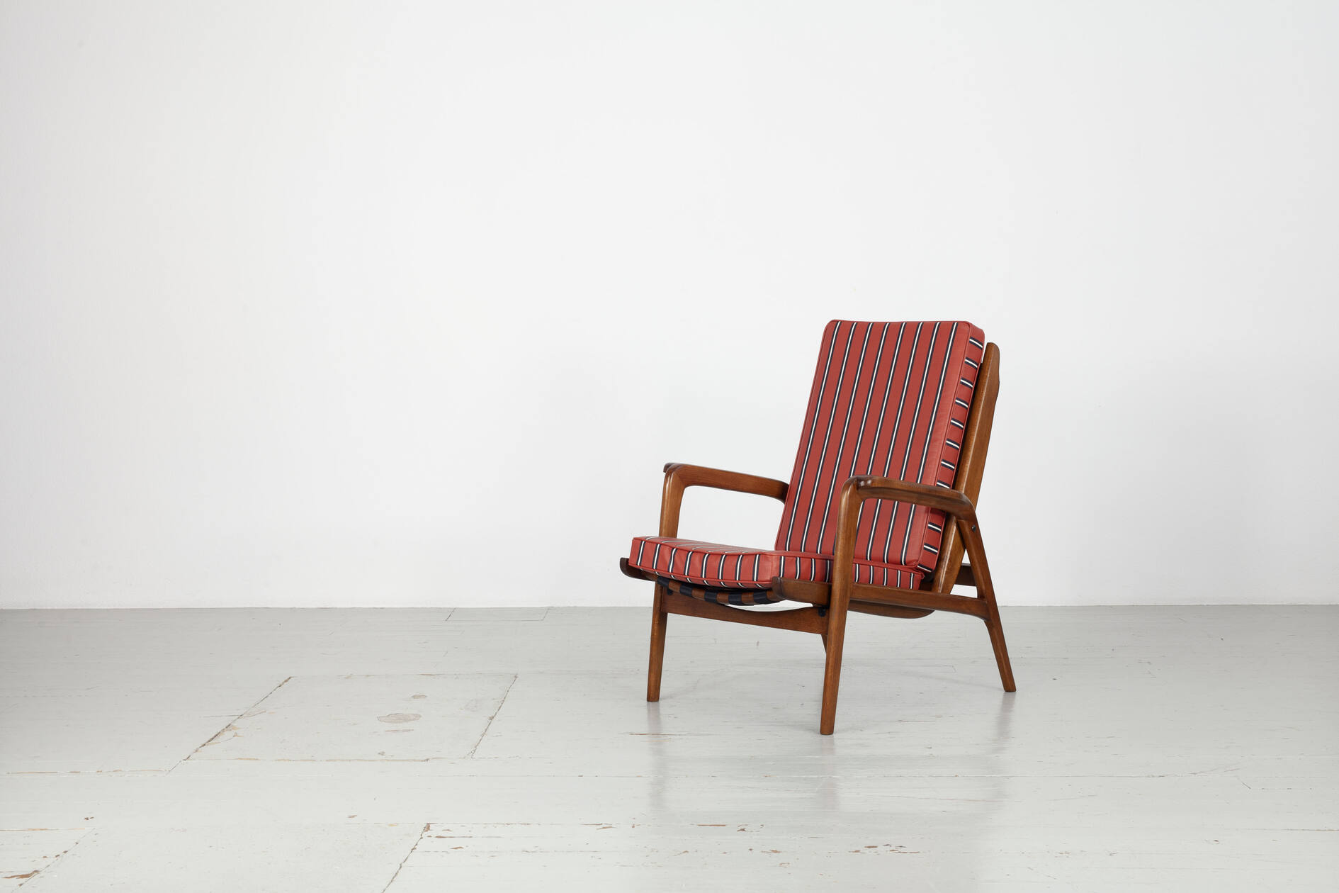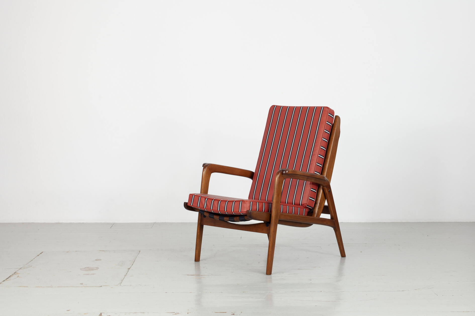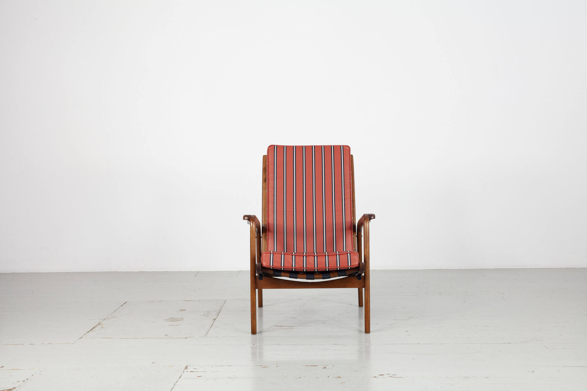 Armchair made of stained beech wood with metal and fabric straps, fitted with new foam cushions and a striped Dedar cover (SN Regimen col. Ruggine 004).