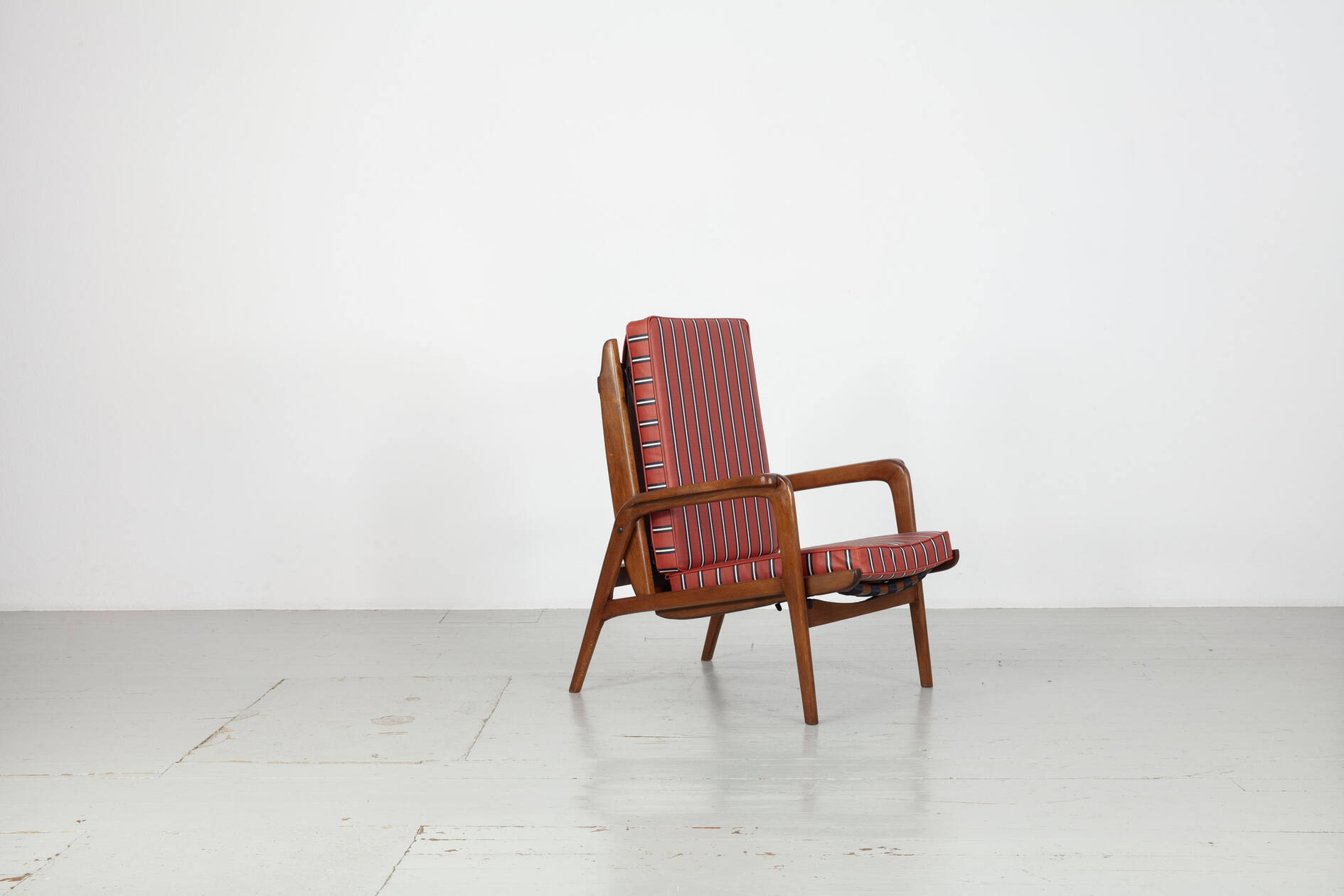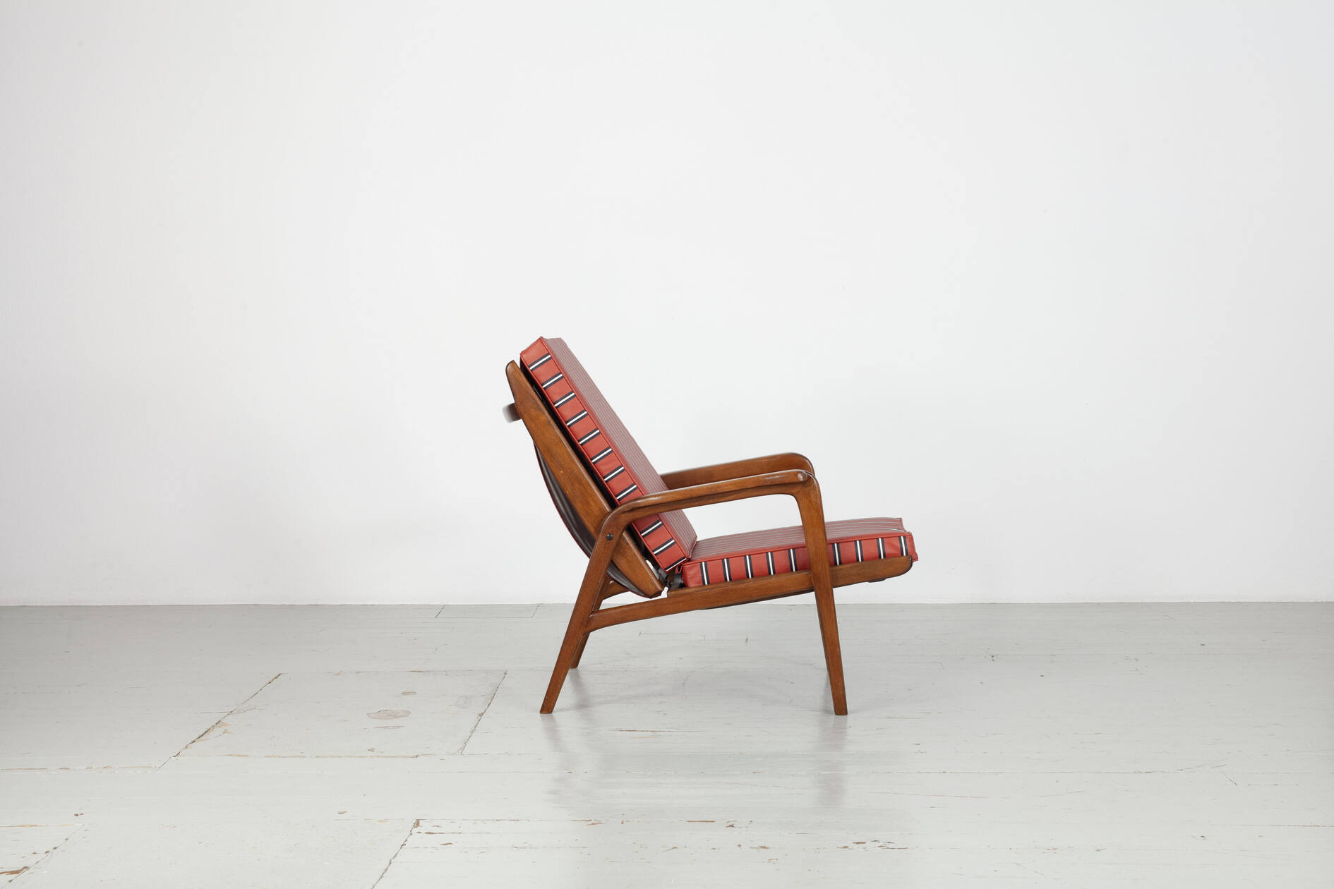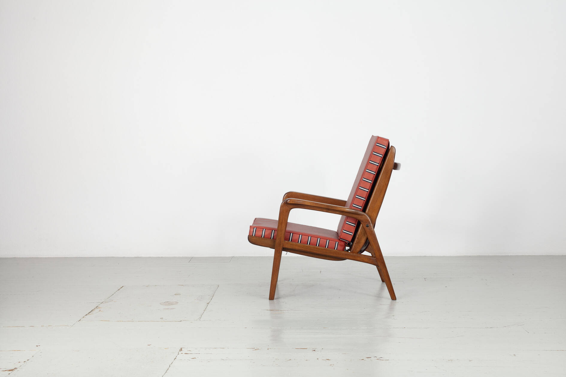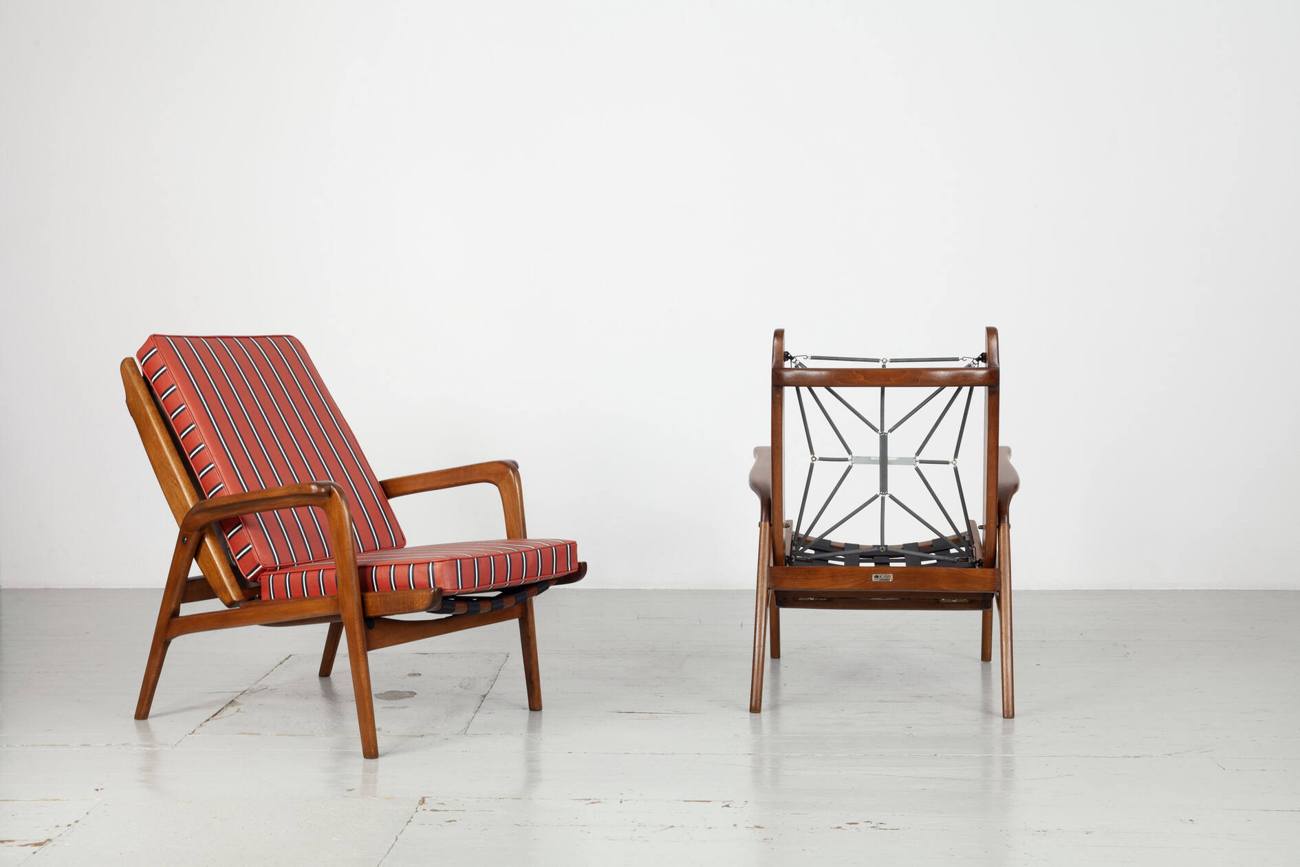 Armchair made of stained beech wood with metal and fabric straps, fitted with new foam cushions and a striped Dedar cover (SN Regimen col. Ruggine 004).