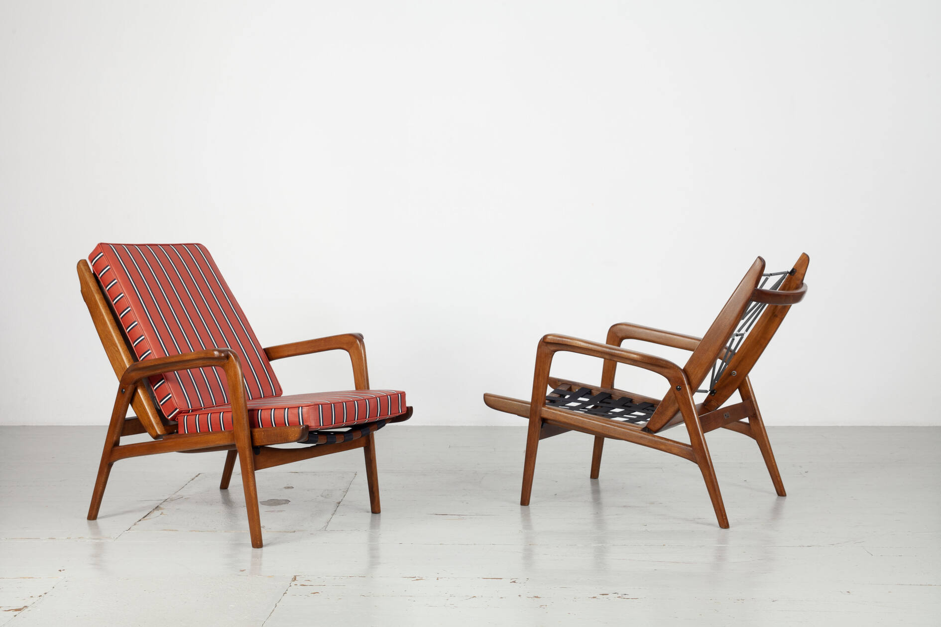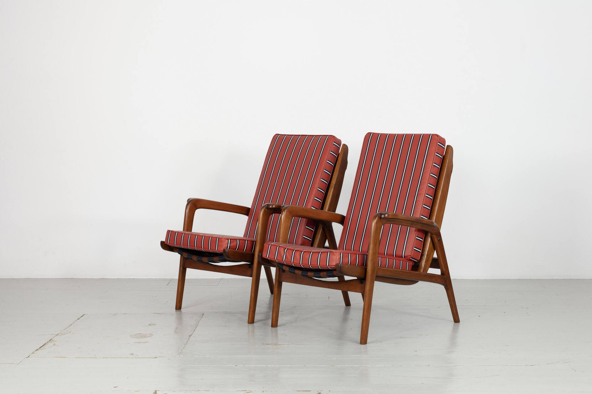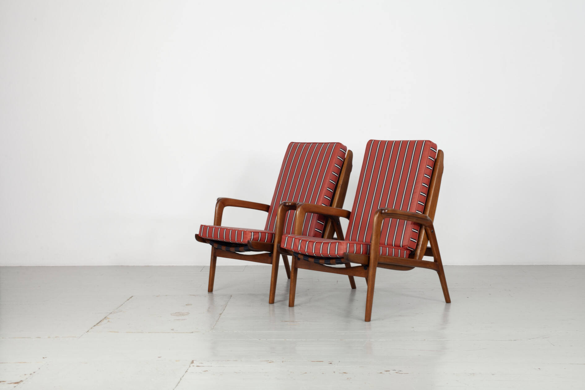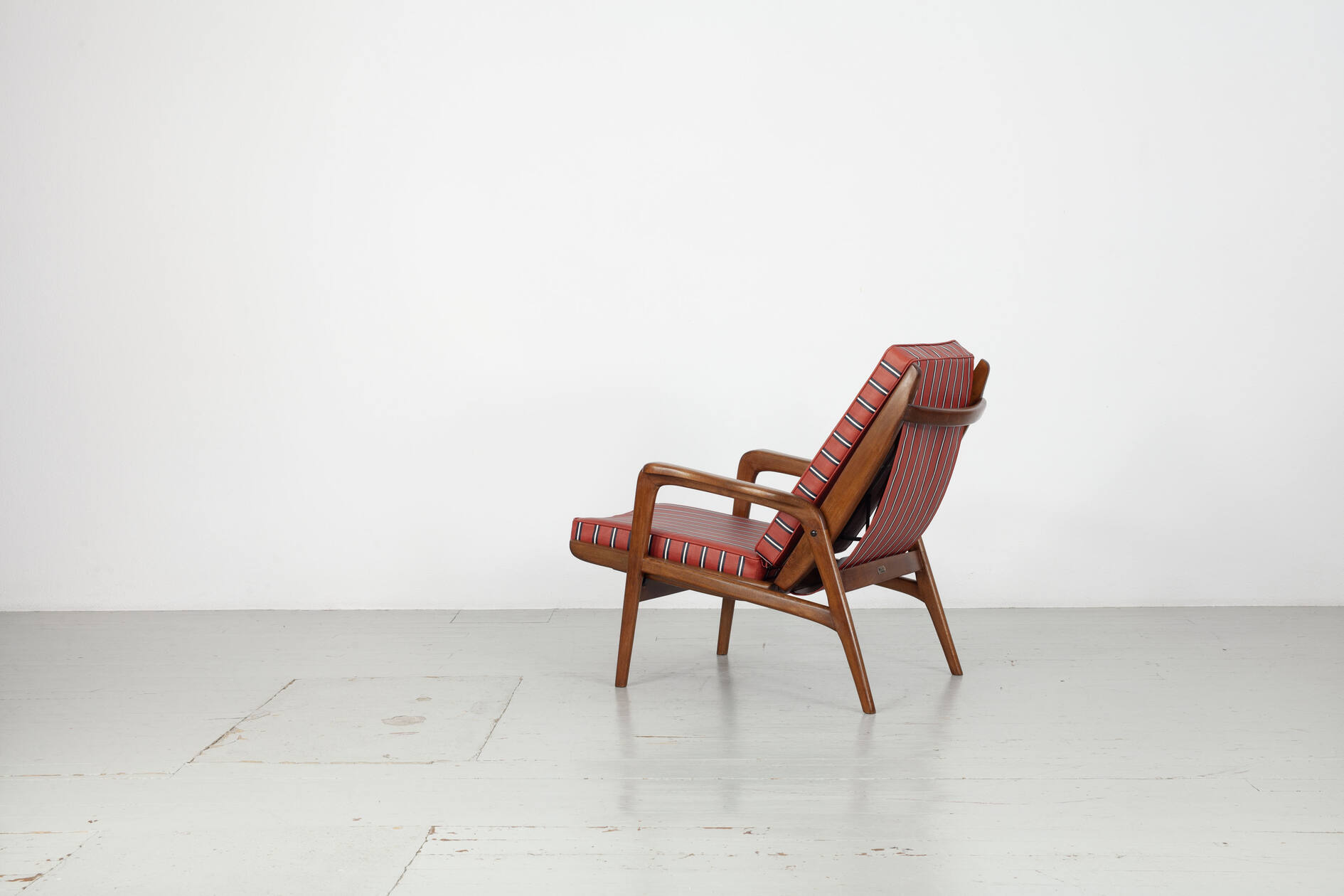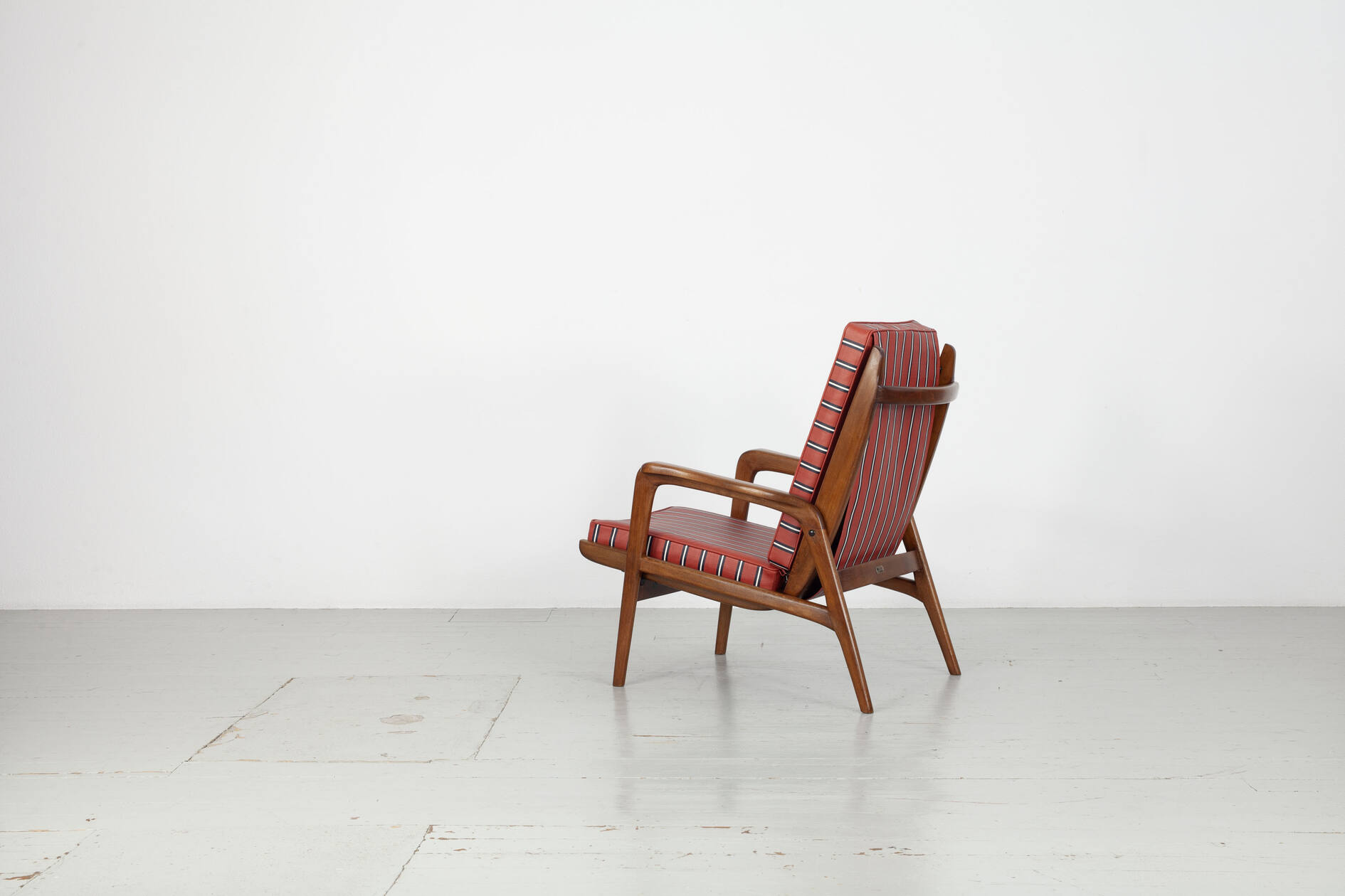 Armchair made of stained beech wood with metal and fabric straps, fitted with new foam cushions and a striped Dedar cover (SN Regimen col. Ruggine 004).