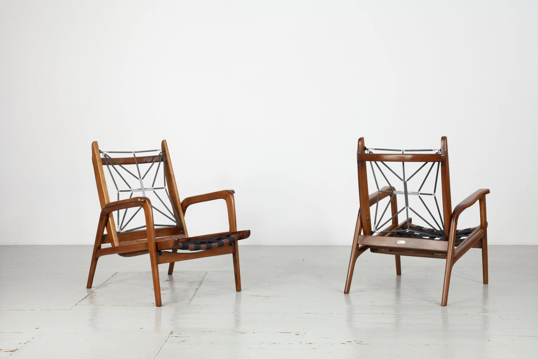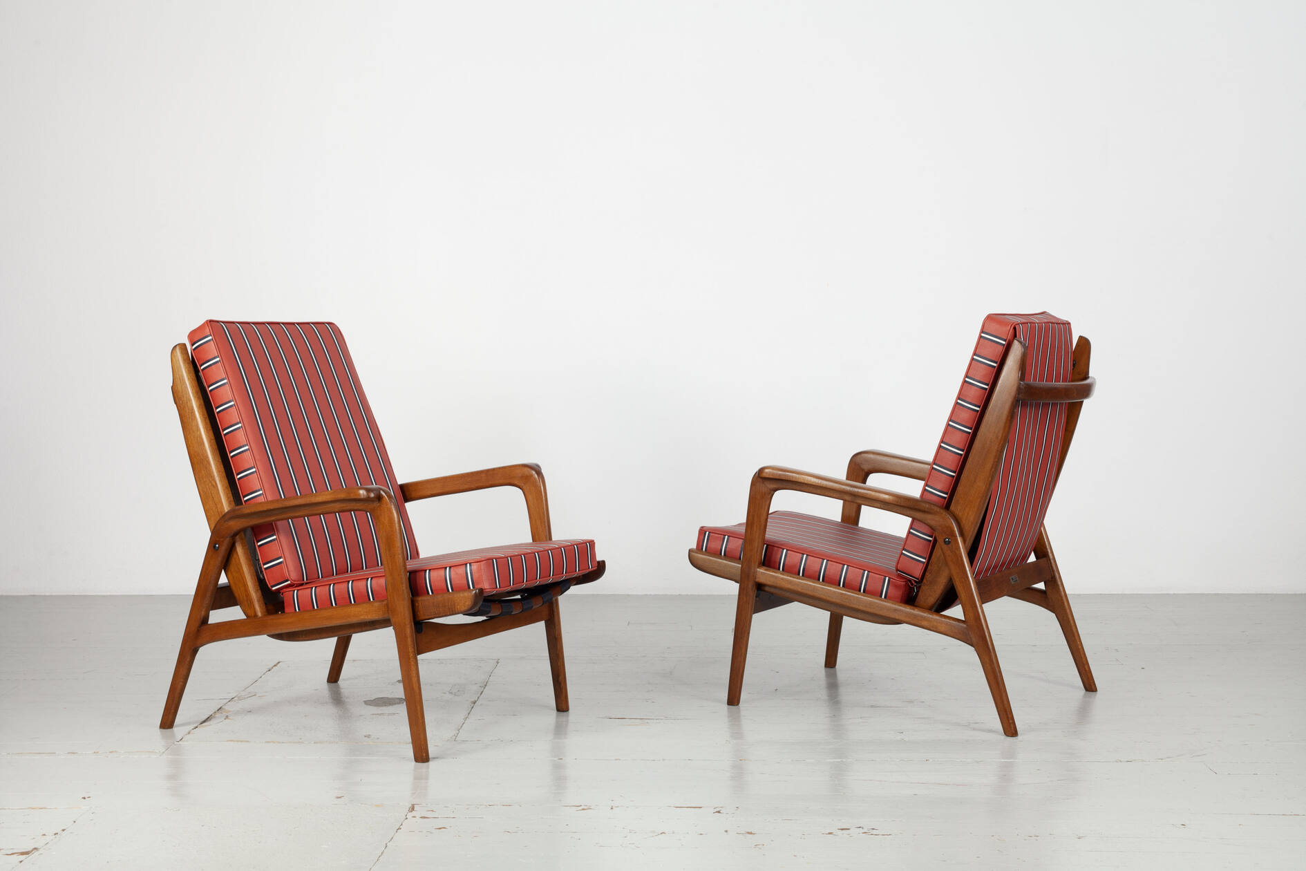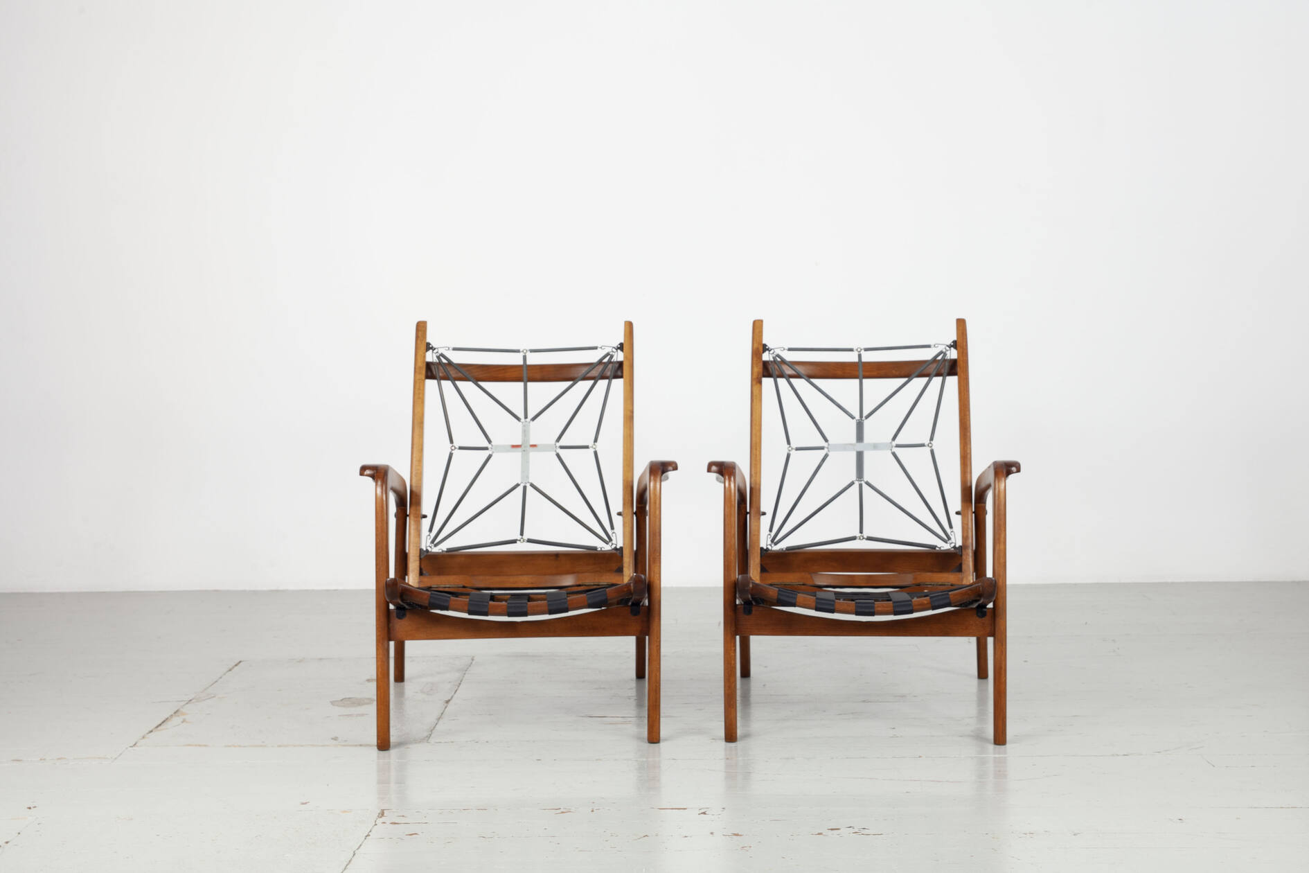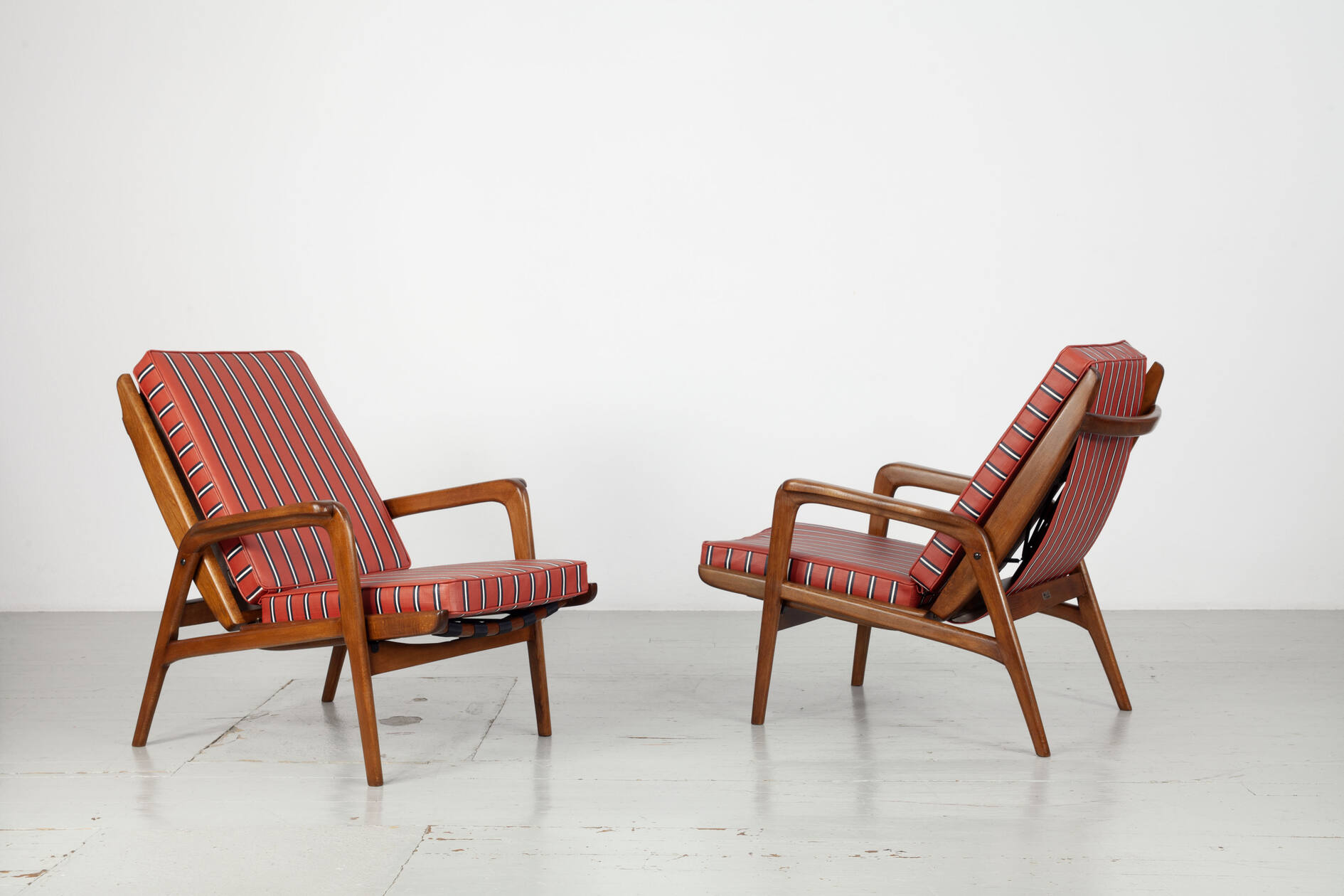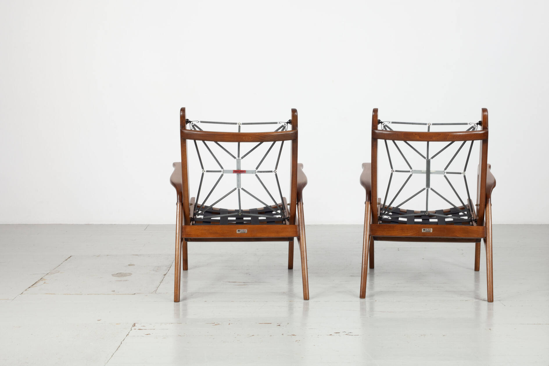 Armchair made of stained beech wood with metal and fabric straps, fitted with new foam cushions and a striped Dedar cover (SN Regimen col. Ruggine 004).