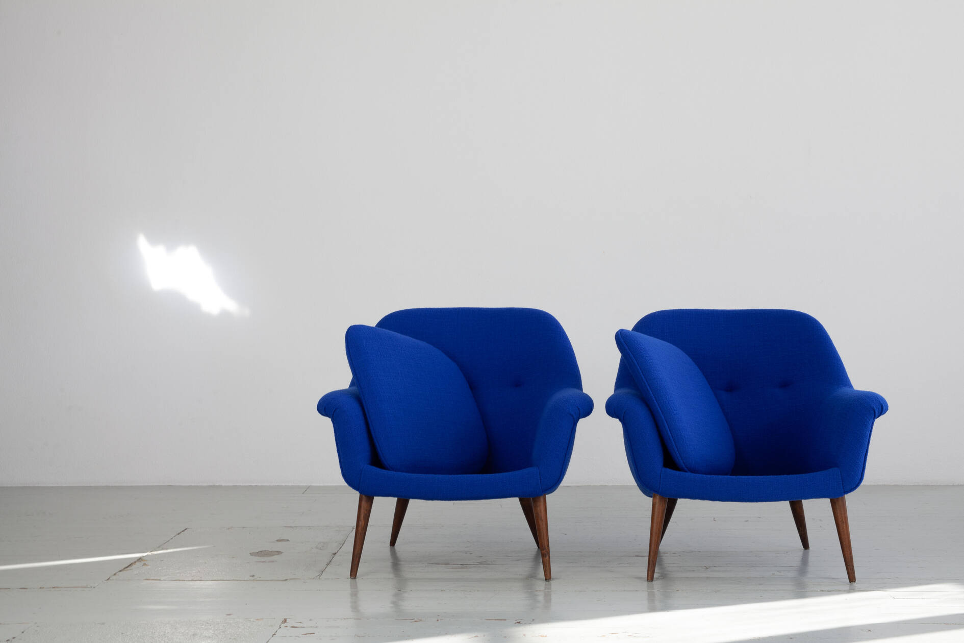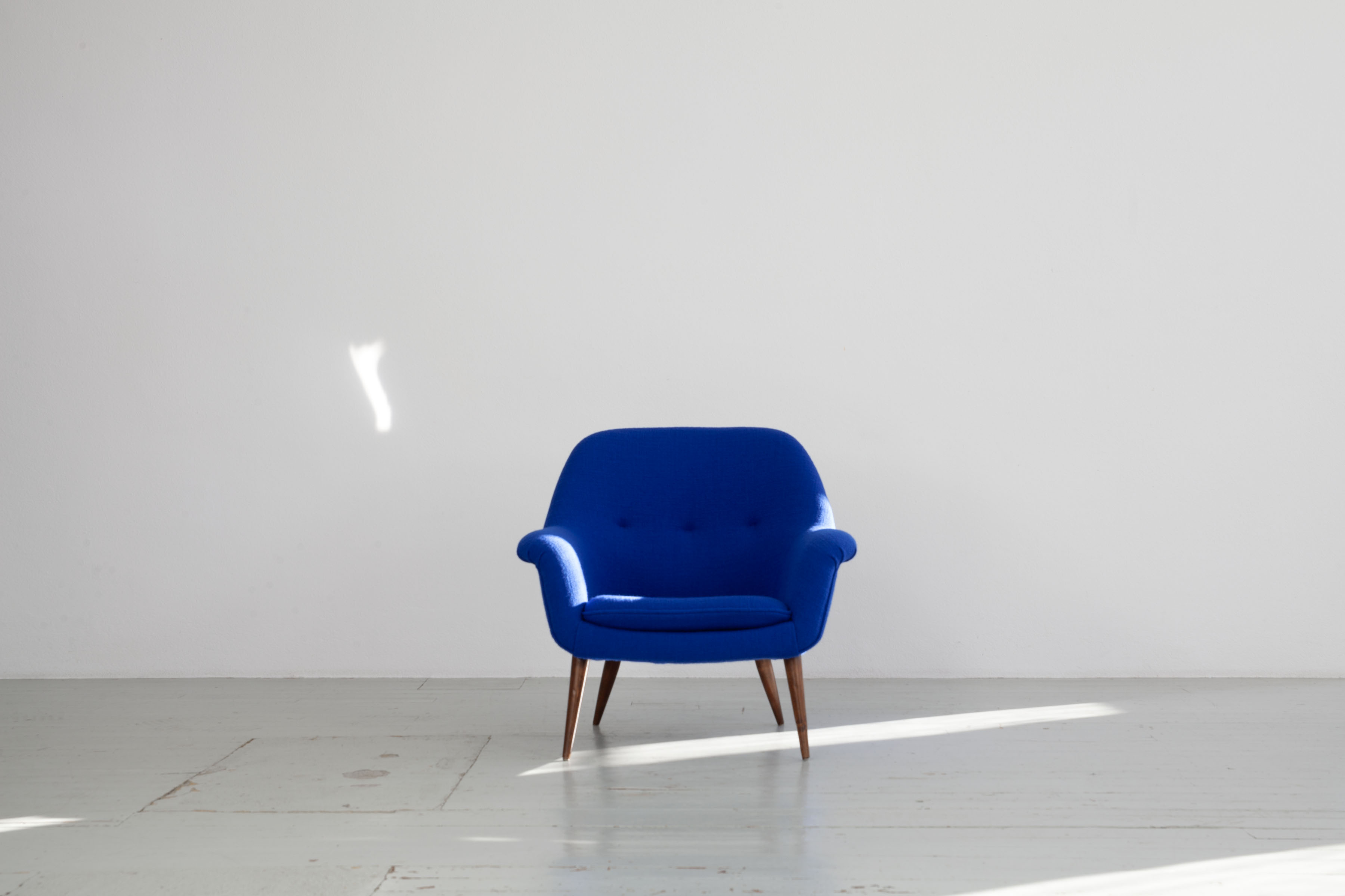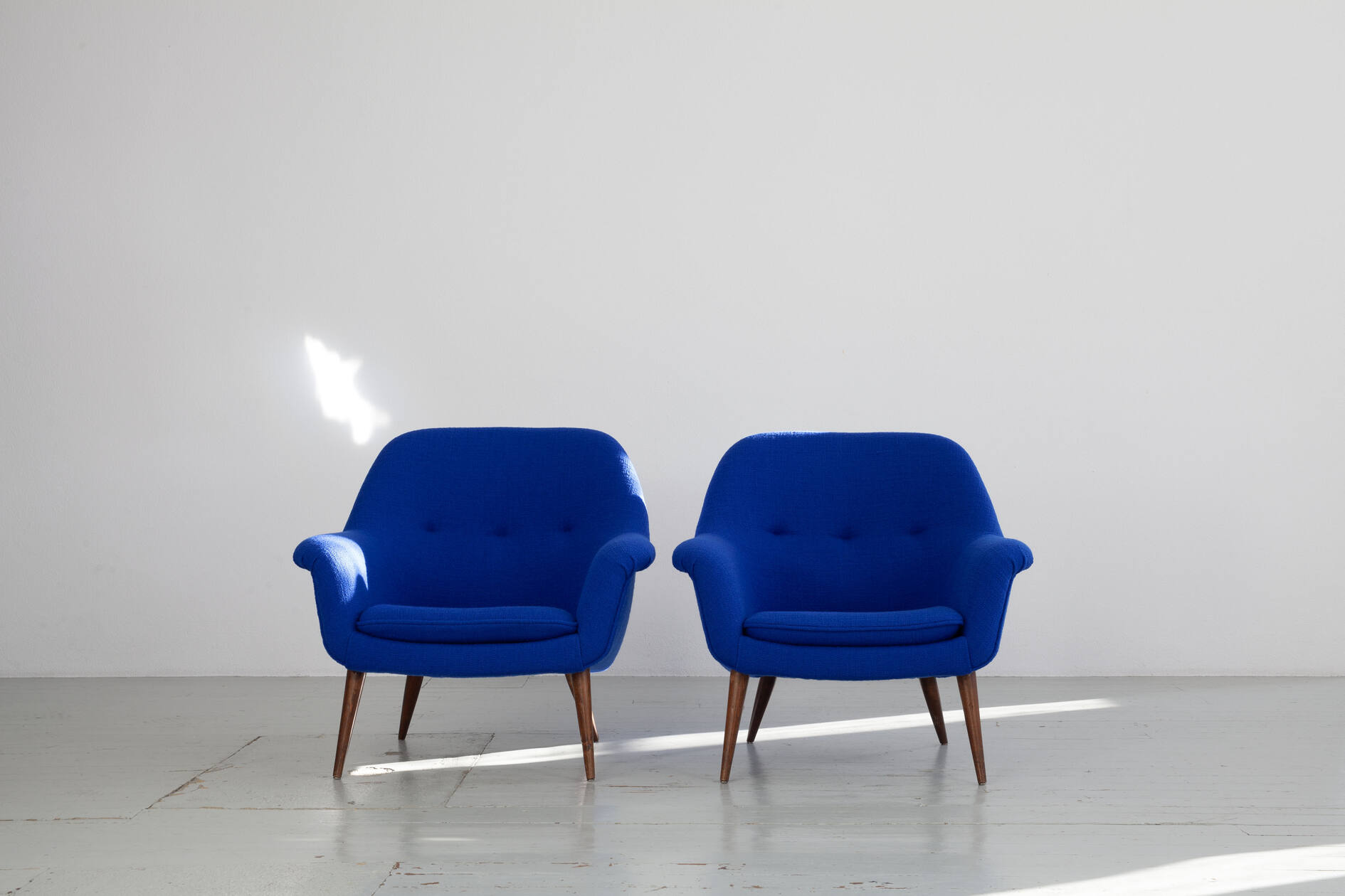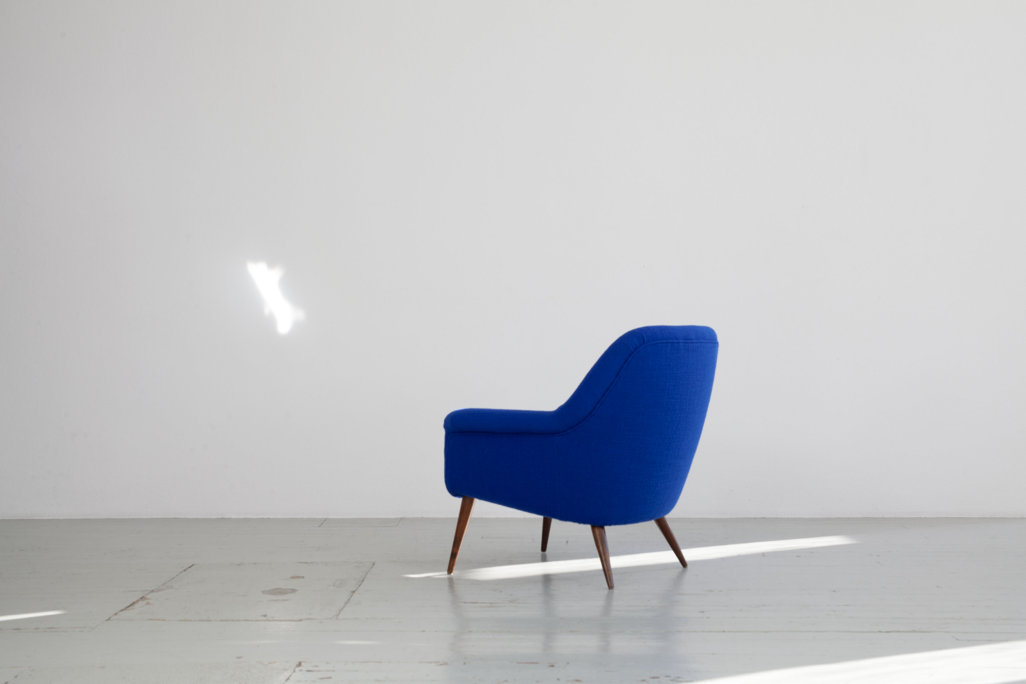 The armchairs have been reupholstered true to the original using Dedar fabric, “Perfect Flower”, color 018 (blue).