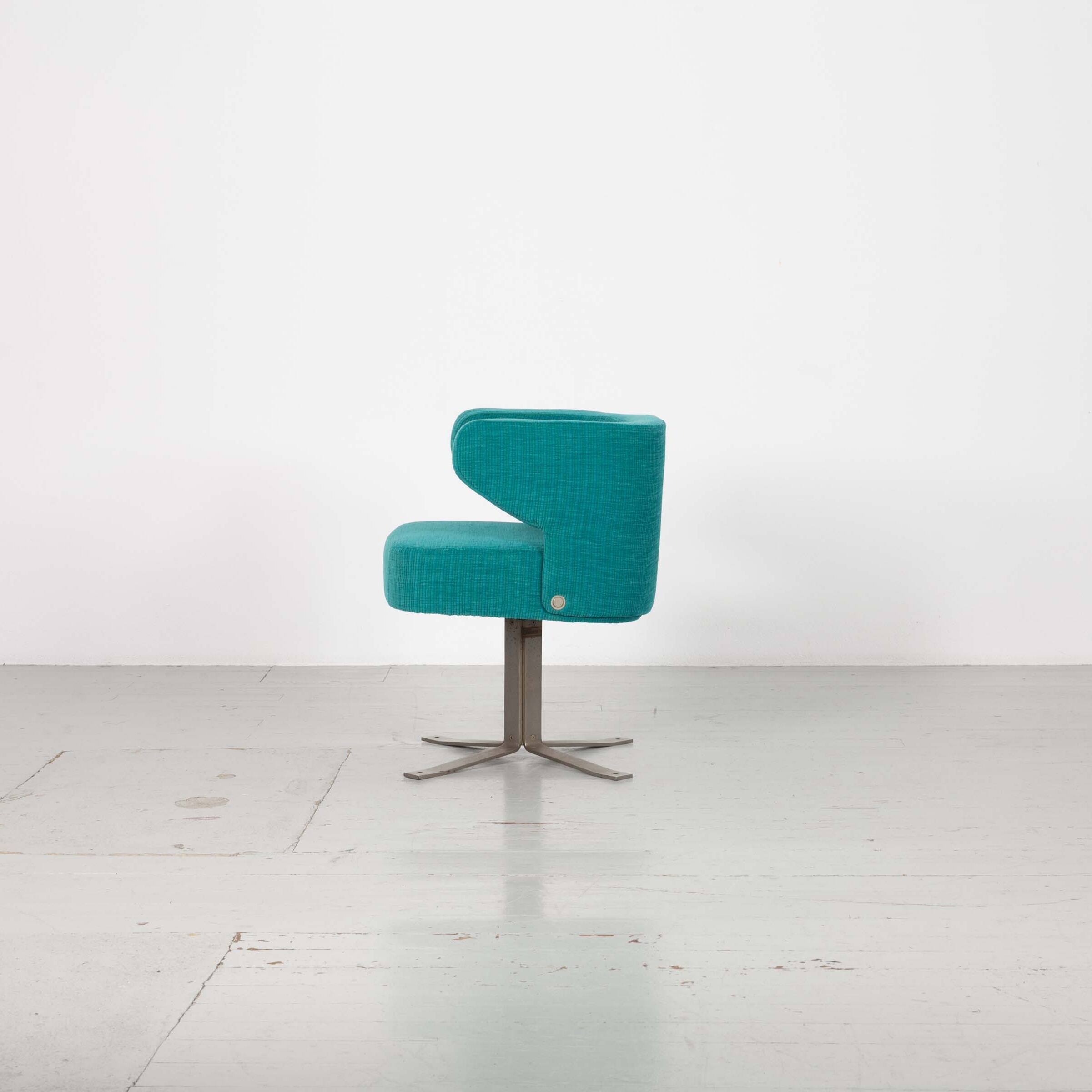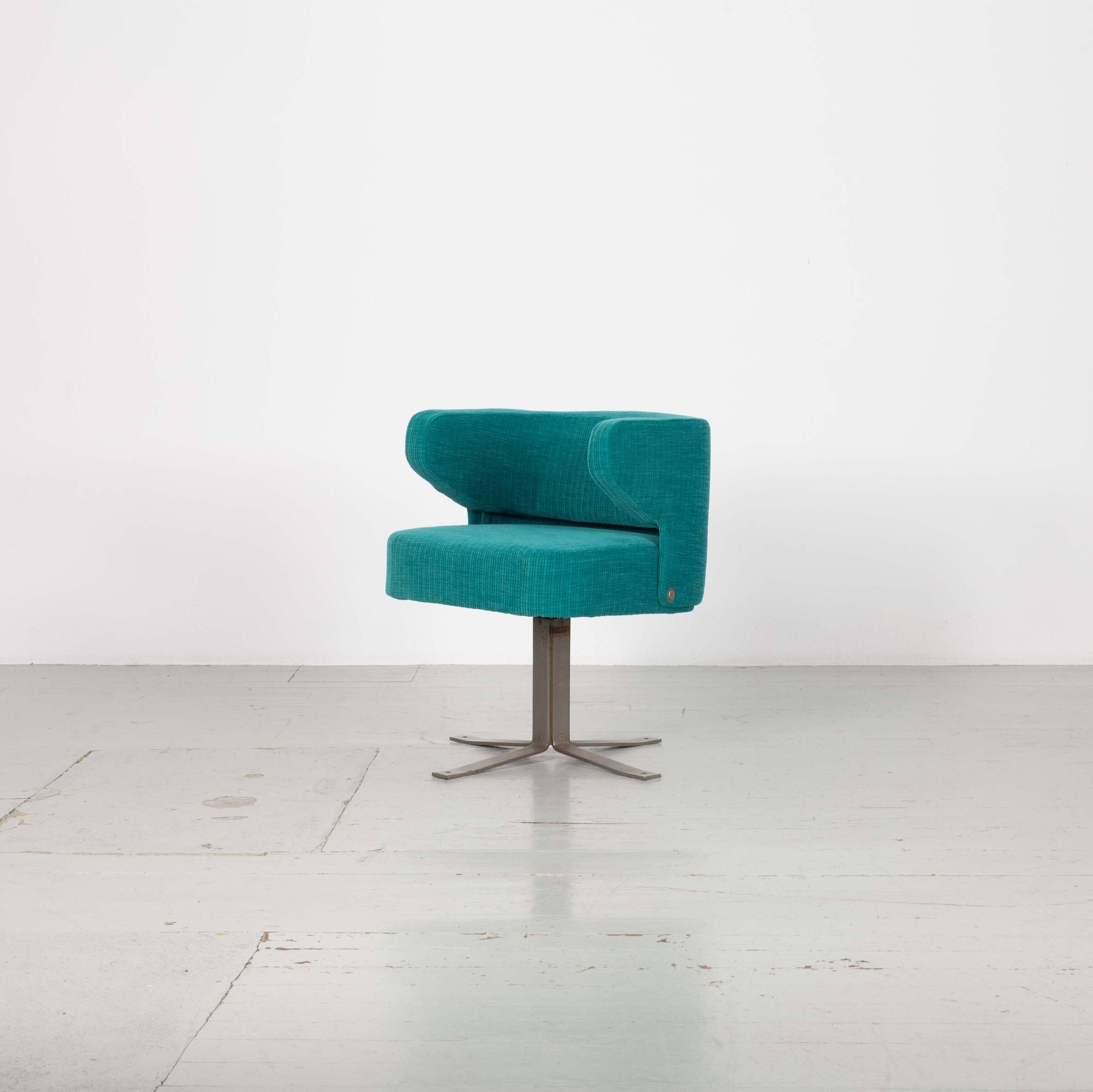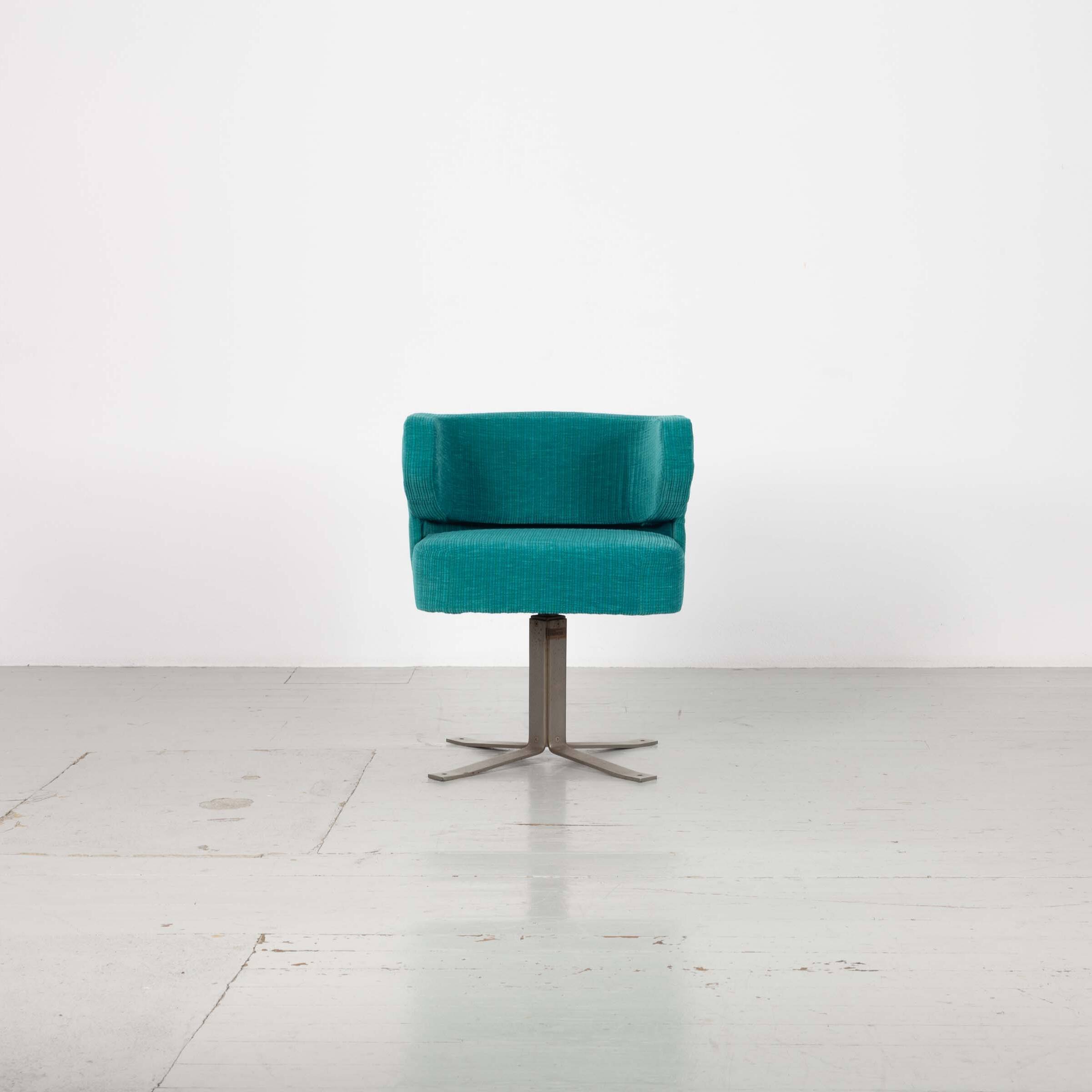 Swivel chair model “Poney,” designed by Giulio Moscatelli, produced by Formanova in Italy in the 1970s. Chrome-plated metal base – water blue vintage fabric cover.