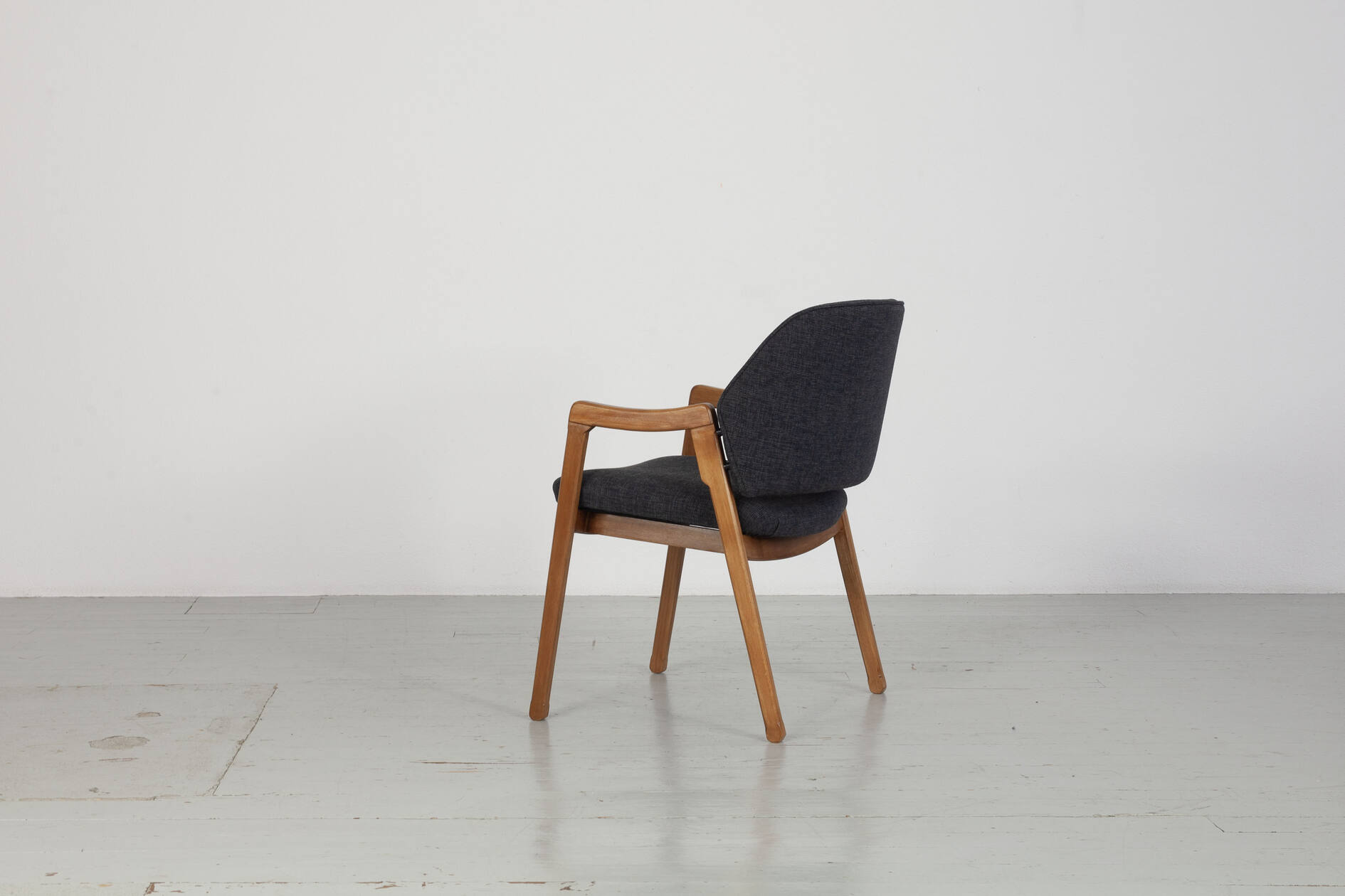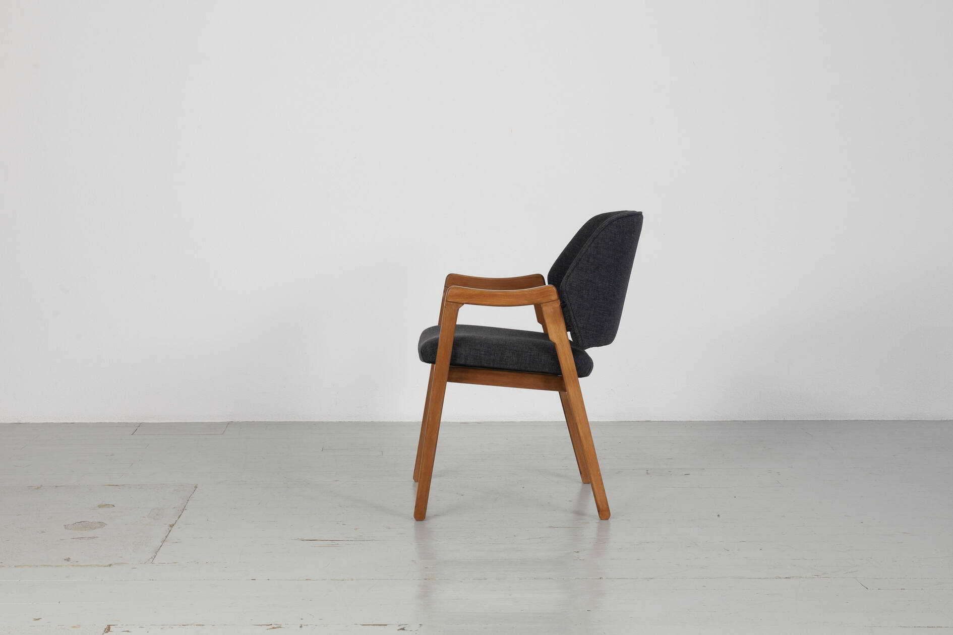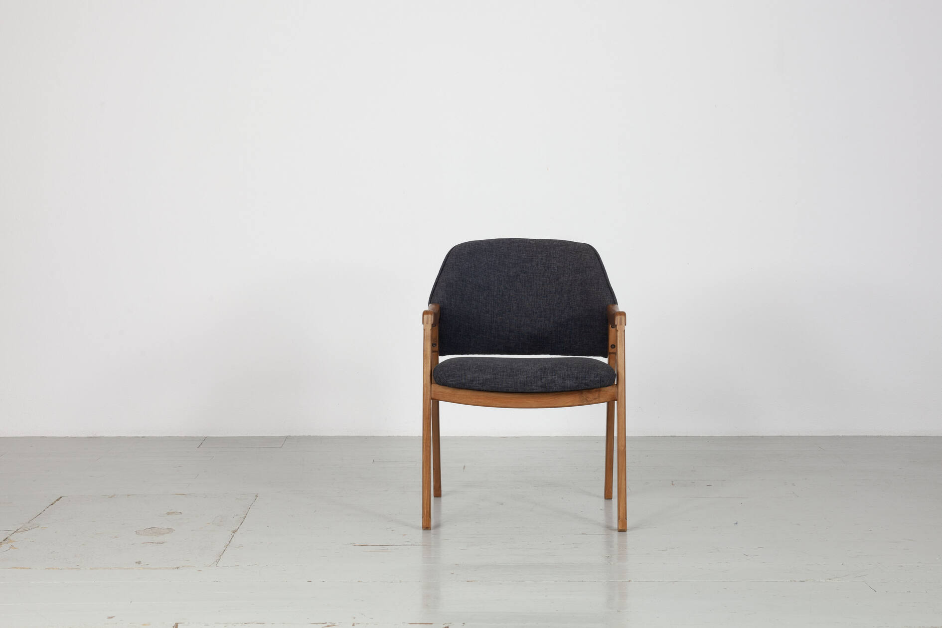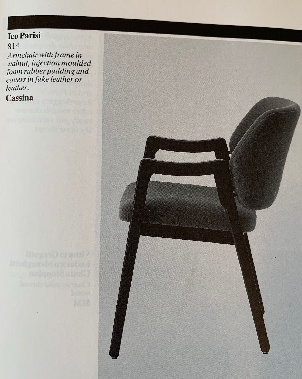 Armchair manufactured by Cassina, design Ico and Luisa Parisi, model 814, walnut structure, seat and backrest reupholstered in gray fabric. Cassina label on the underside of the chairs.