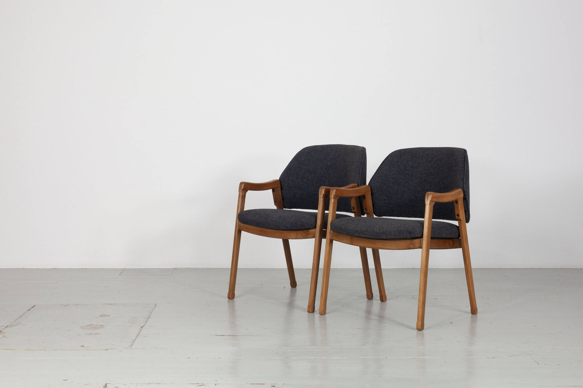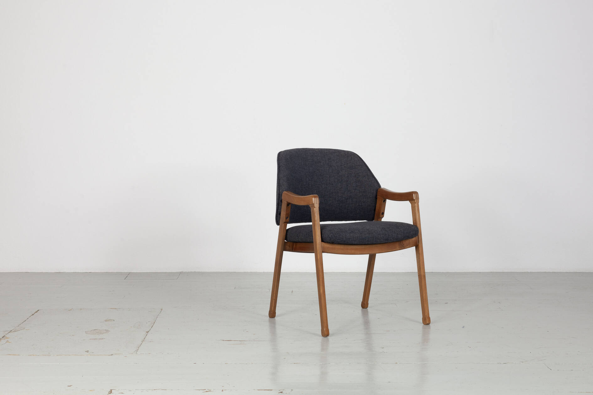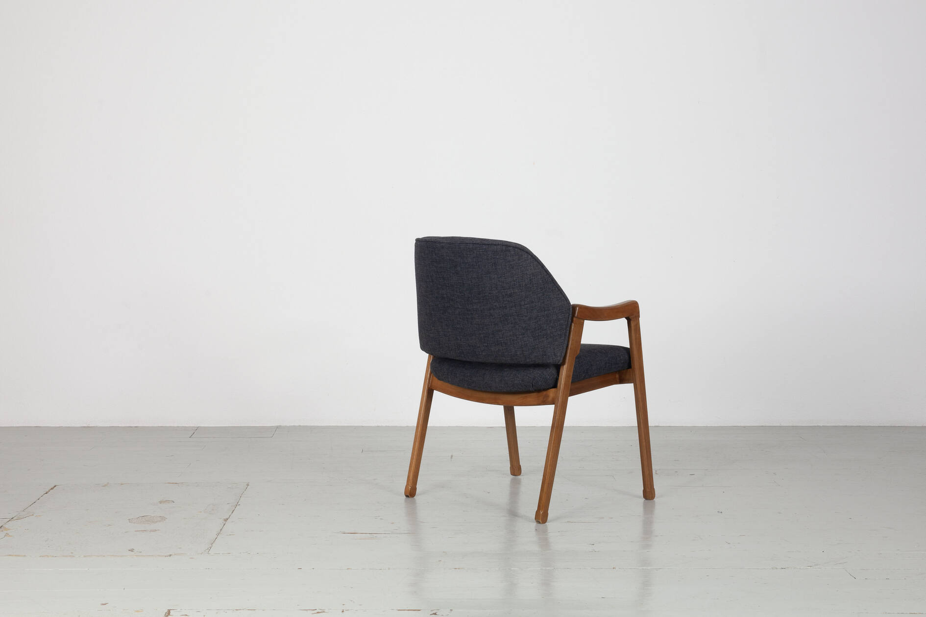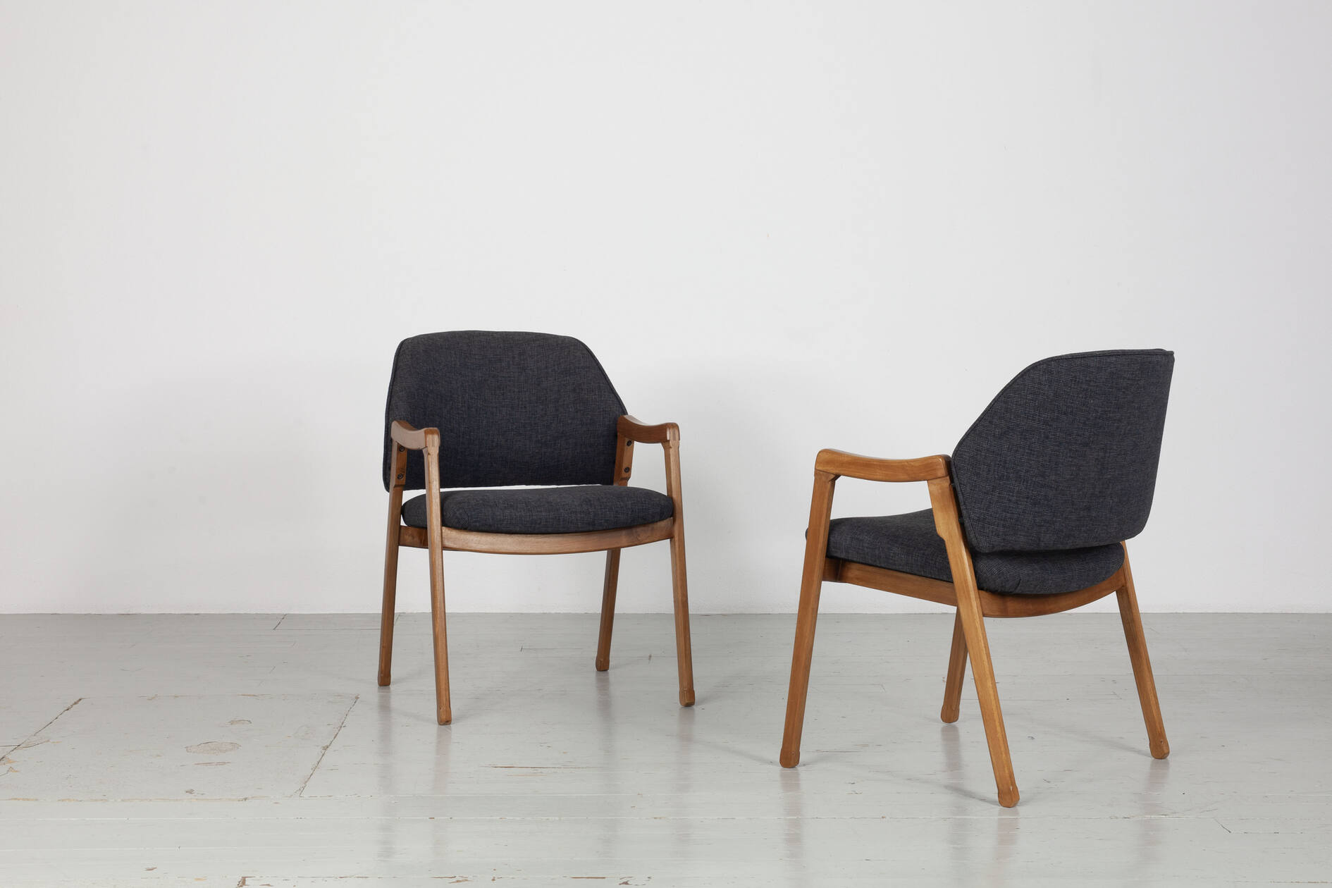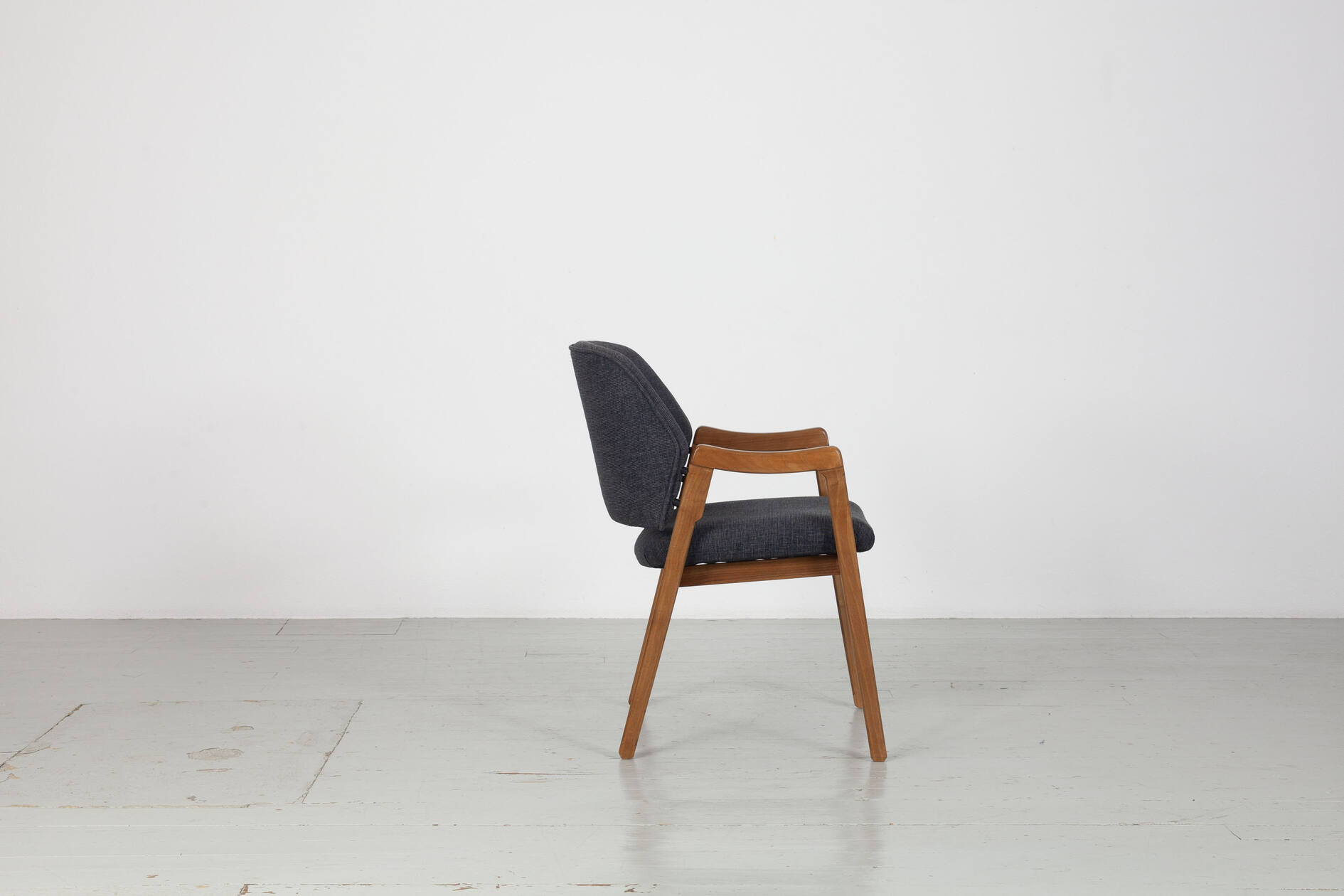 Armchair manufactured by Cassina, design Ico and Luisa Parisi, model 814, walnut structure, seat and backrest reupholstered in gray fabric. Cassina label on the underside of the chairs.