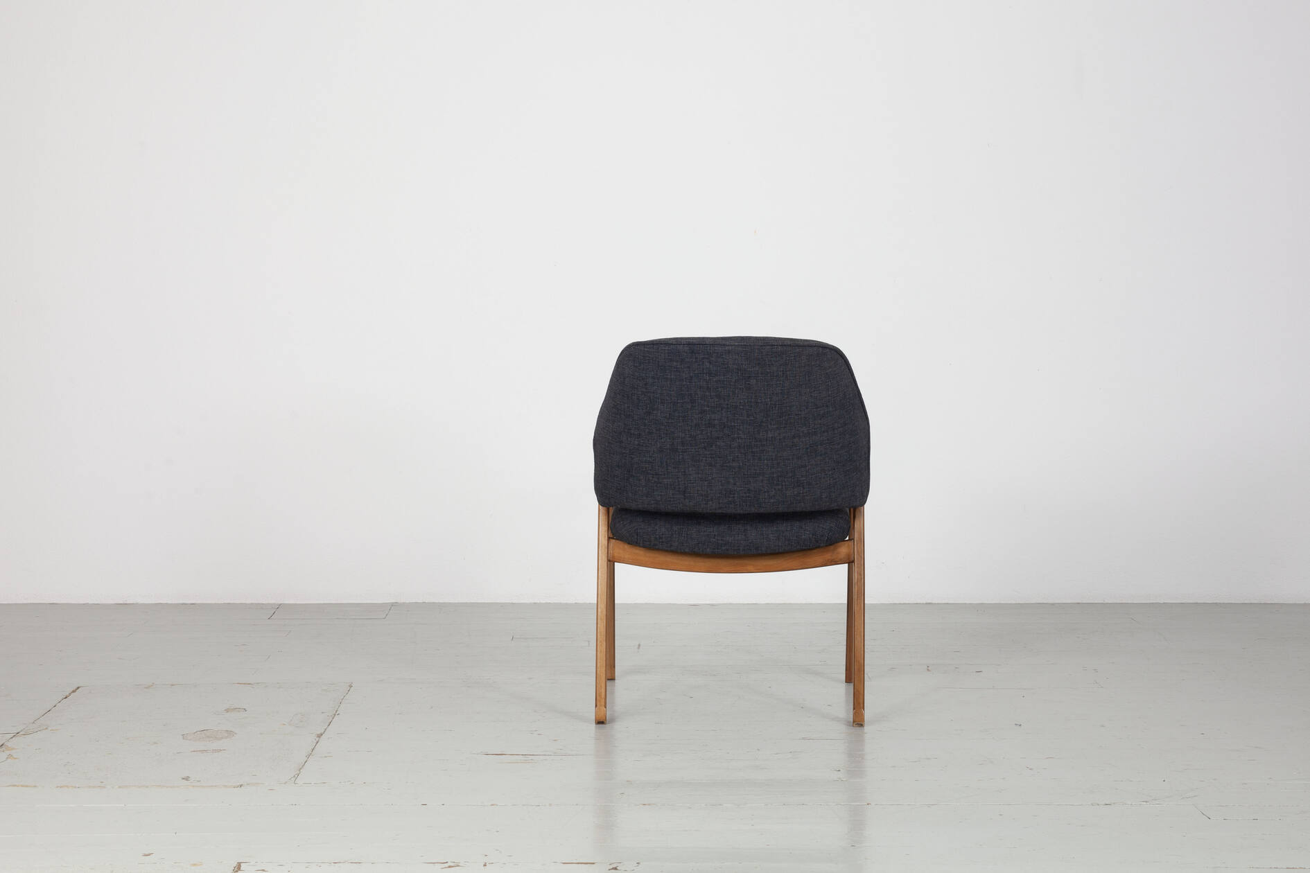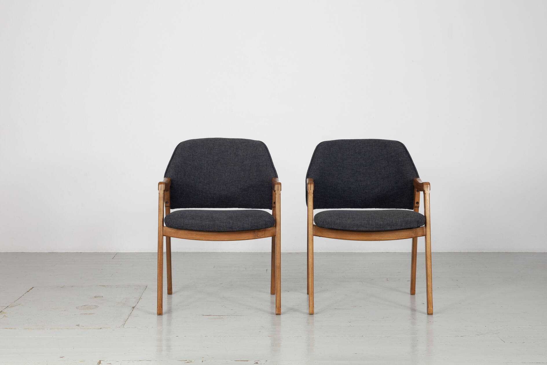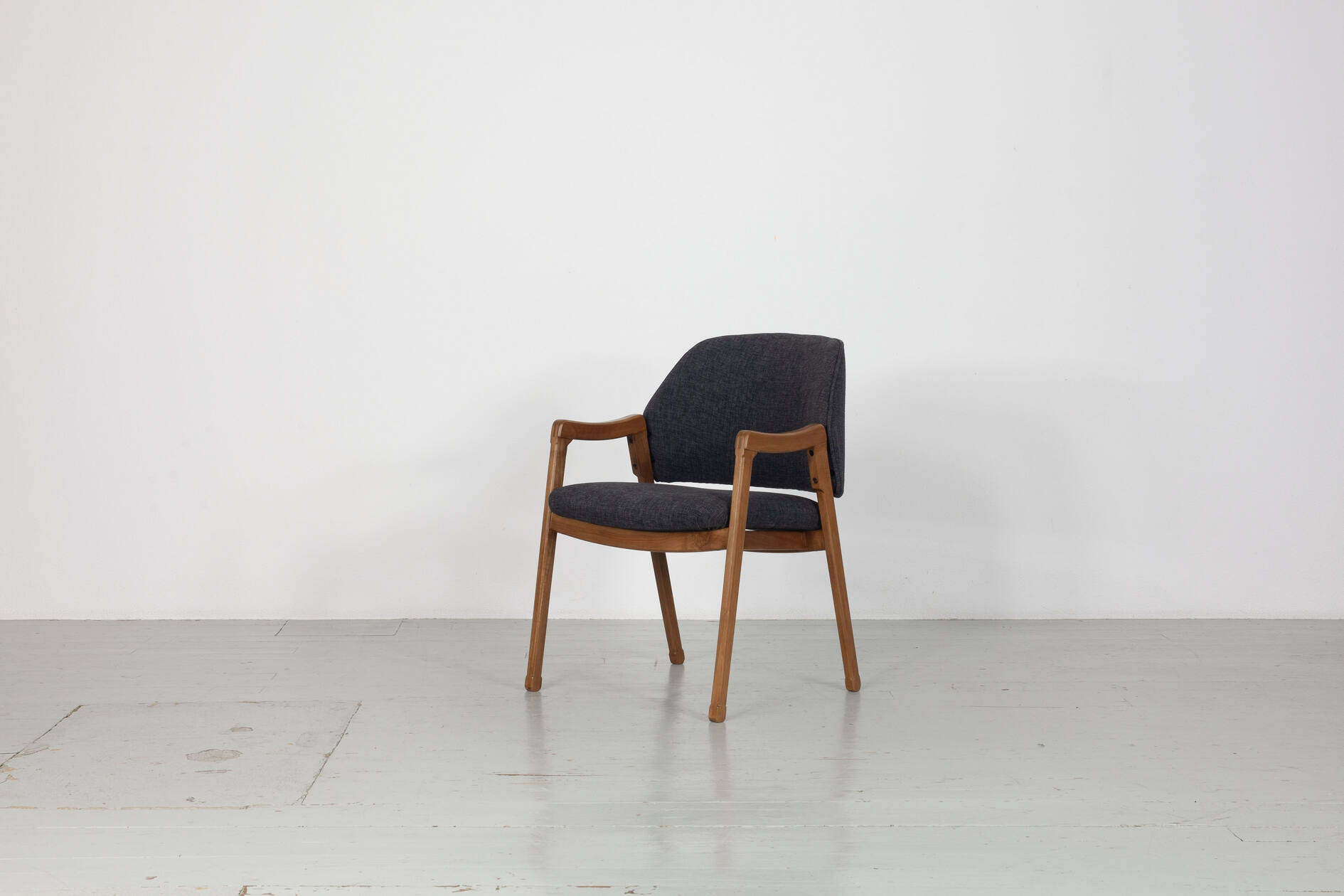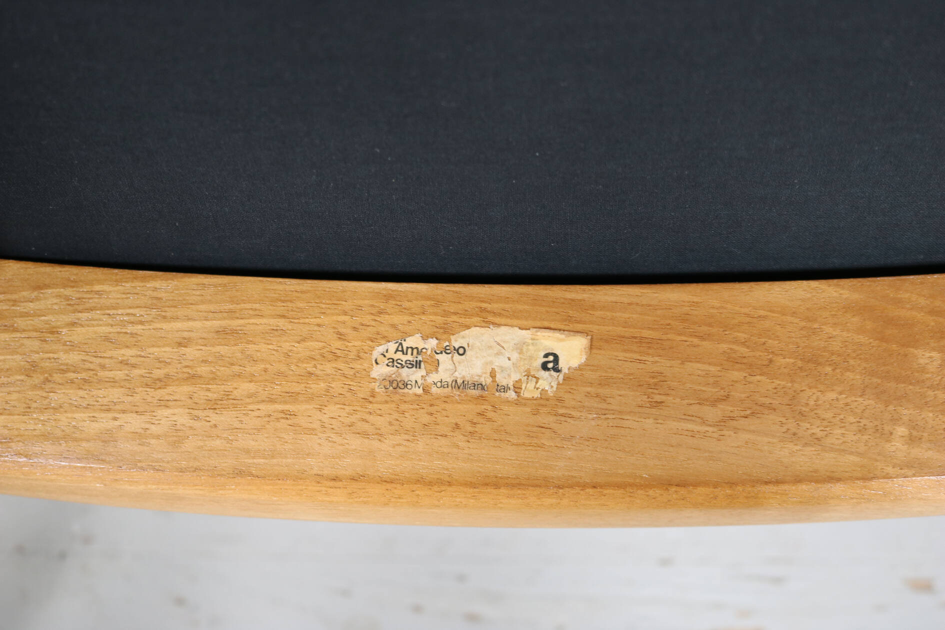 Armchair manufactured by Cassina, design Ico and Luisa Parisi, model 814, walnut structure, seat and backrest reupholstered in gray fabric. Cassina label on the underside of the chairs.